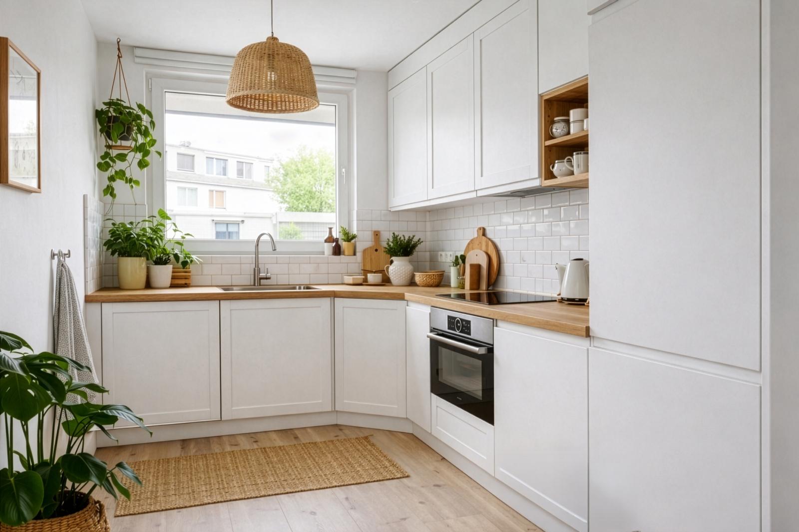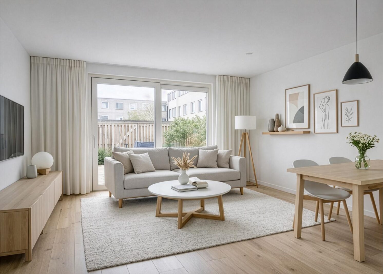 The cosy living room features tiled flooring with underfloor heating. The semi-open kitchen has a modern design and is fully equipped with all necessary appliances, including an induction hob, oven, and dishwasher.