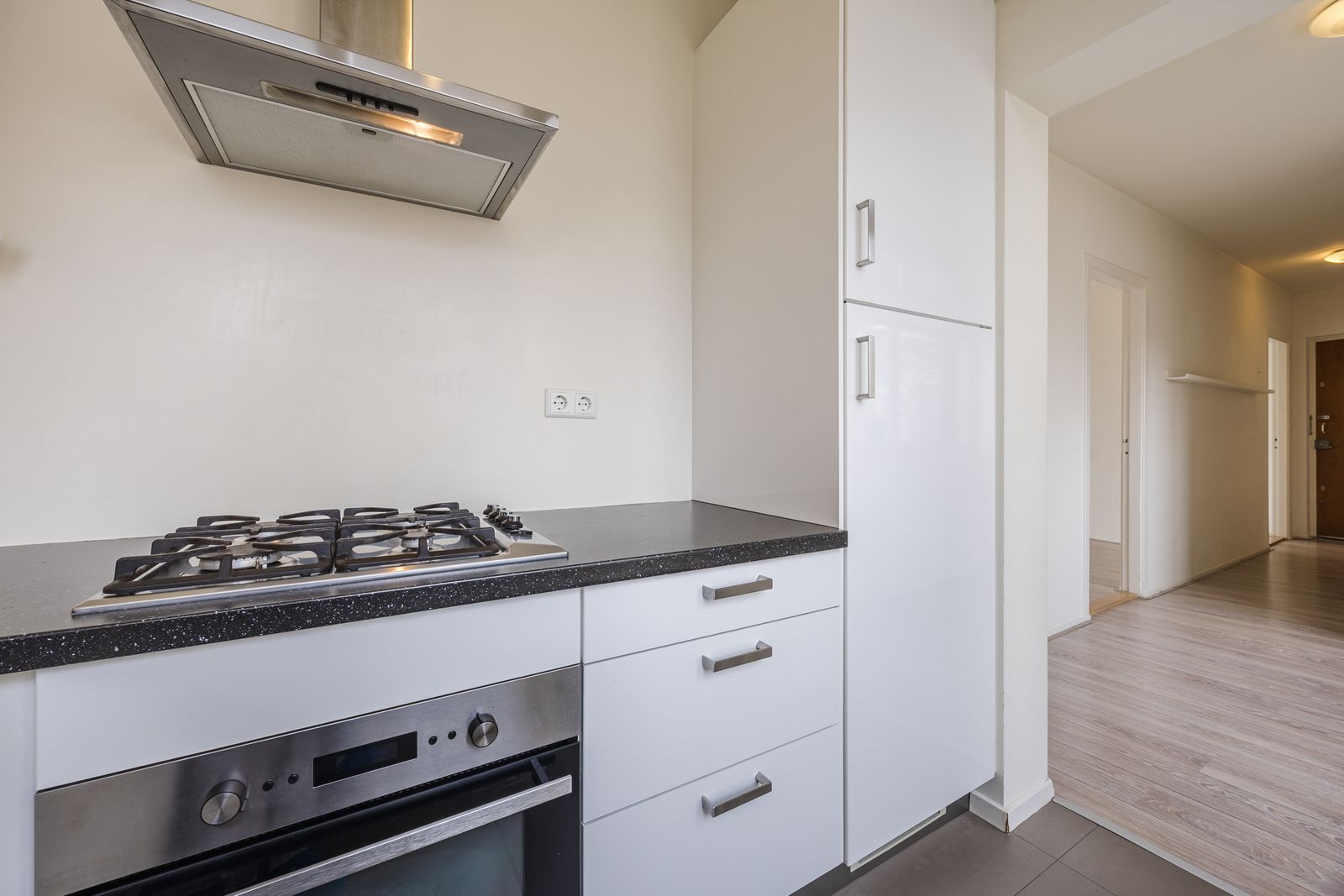 De woning zelf is strak afgewerkt en instapklaar. De lichte woon-/eetkamer aan de voorzijde zorgt voor een fijne leefruimte met veel daglicht. De moderne keuken in hoekopstelling is praktisch ingericht en voorzien van diverse inbouwapparatuur. Aan de achterzijde bevinden zich twee goed bemeten slaapkamers met toegang tot het balkon op het noordoosten, waar je heerlijk kunt genieten van de ochtendzon.