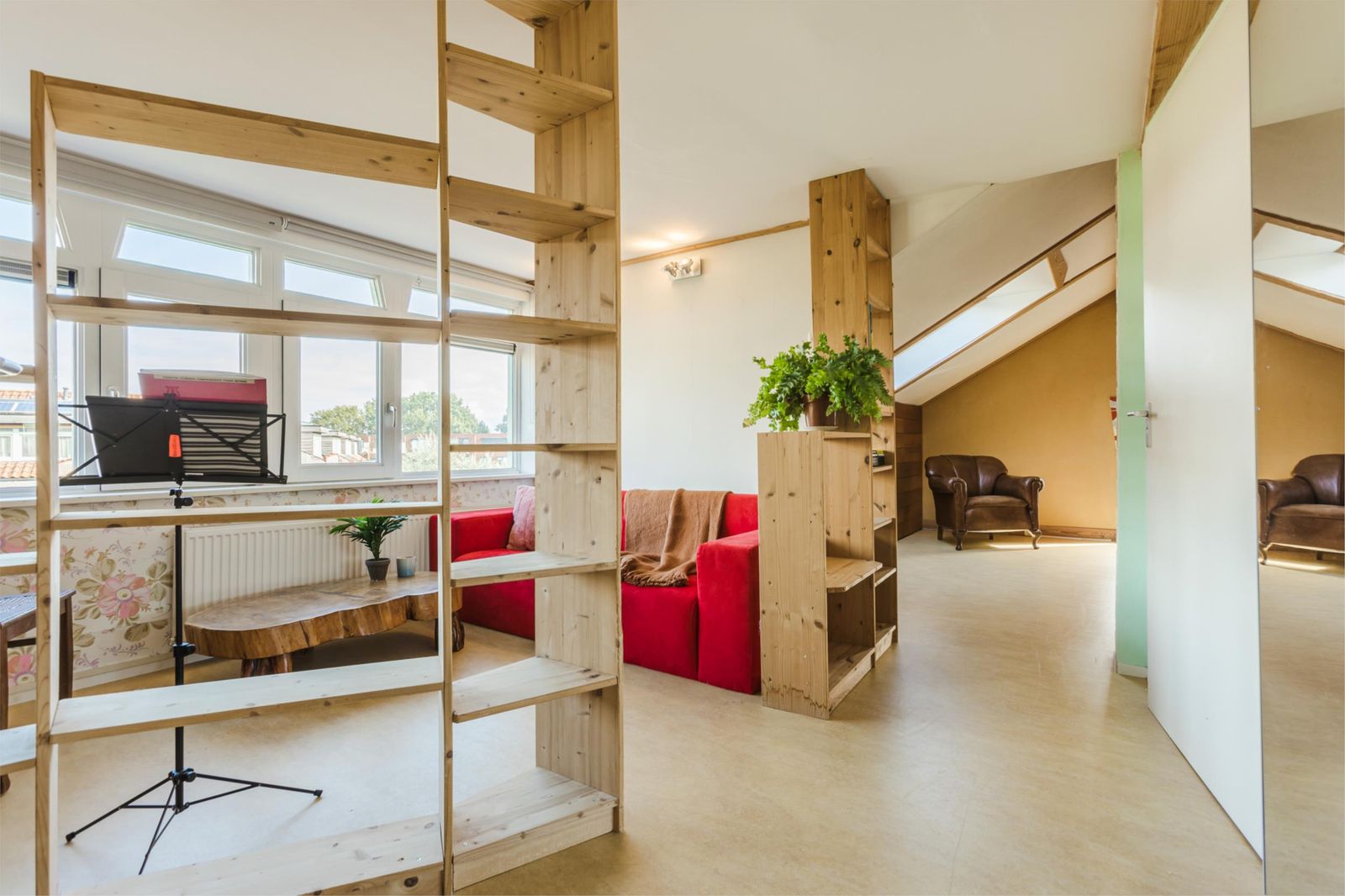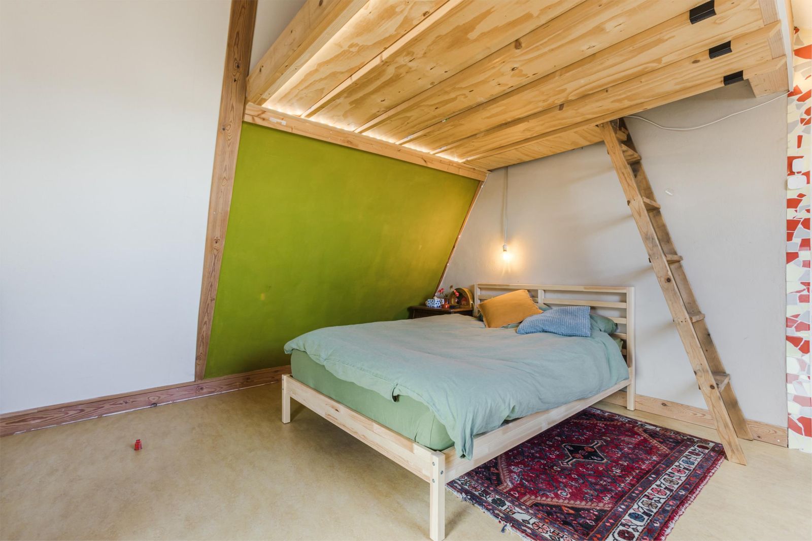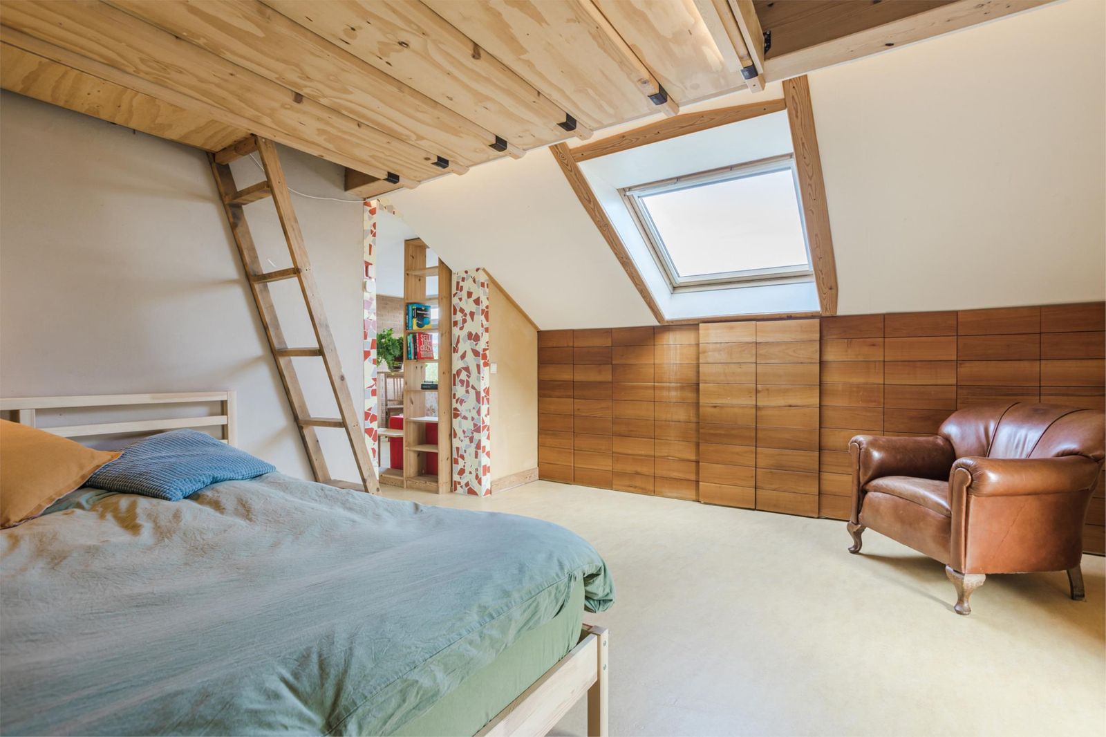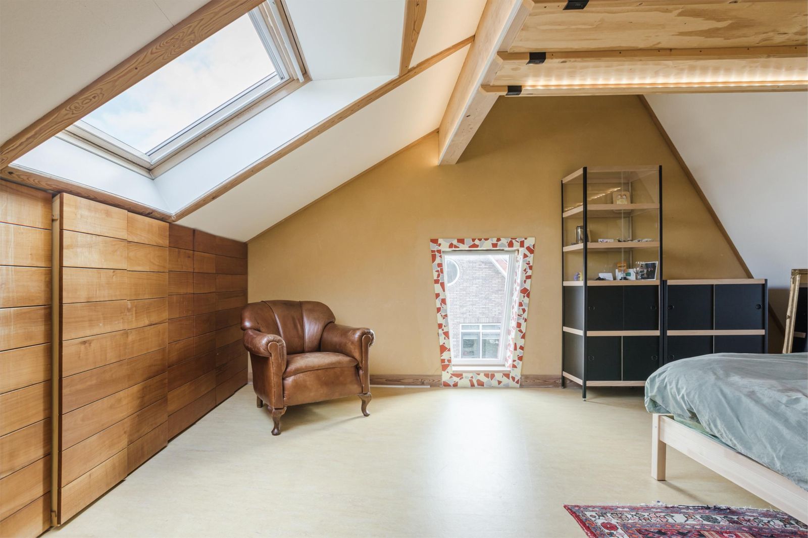 Twee (potentiële) slaapkamers. Eerste slaap/zitruimte is nu afgescheiden door een open kastenwand. De tweede slaapkamer is groot en heeft dakraam, zijraam, een extra slaapverdieping in de nok en kasten met veel opbergruimte onder het schuine dak.