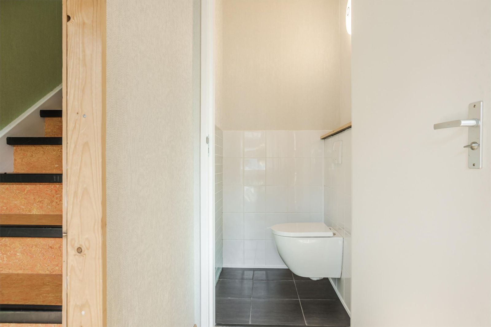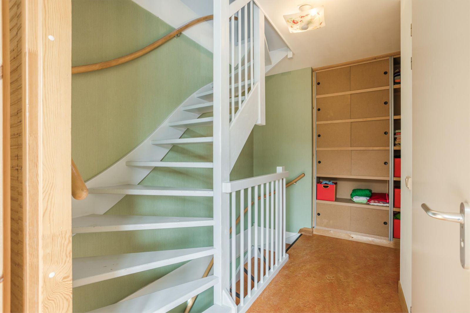 Hal/entree, kleine keuken met inbouwapparatuur en wasmachine. Toilet. Woonkamer. Trapopgang naar eerste verdieping. Trapkast.