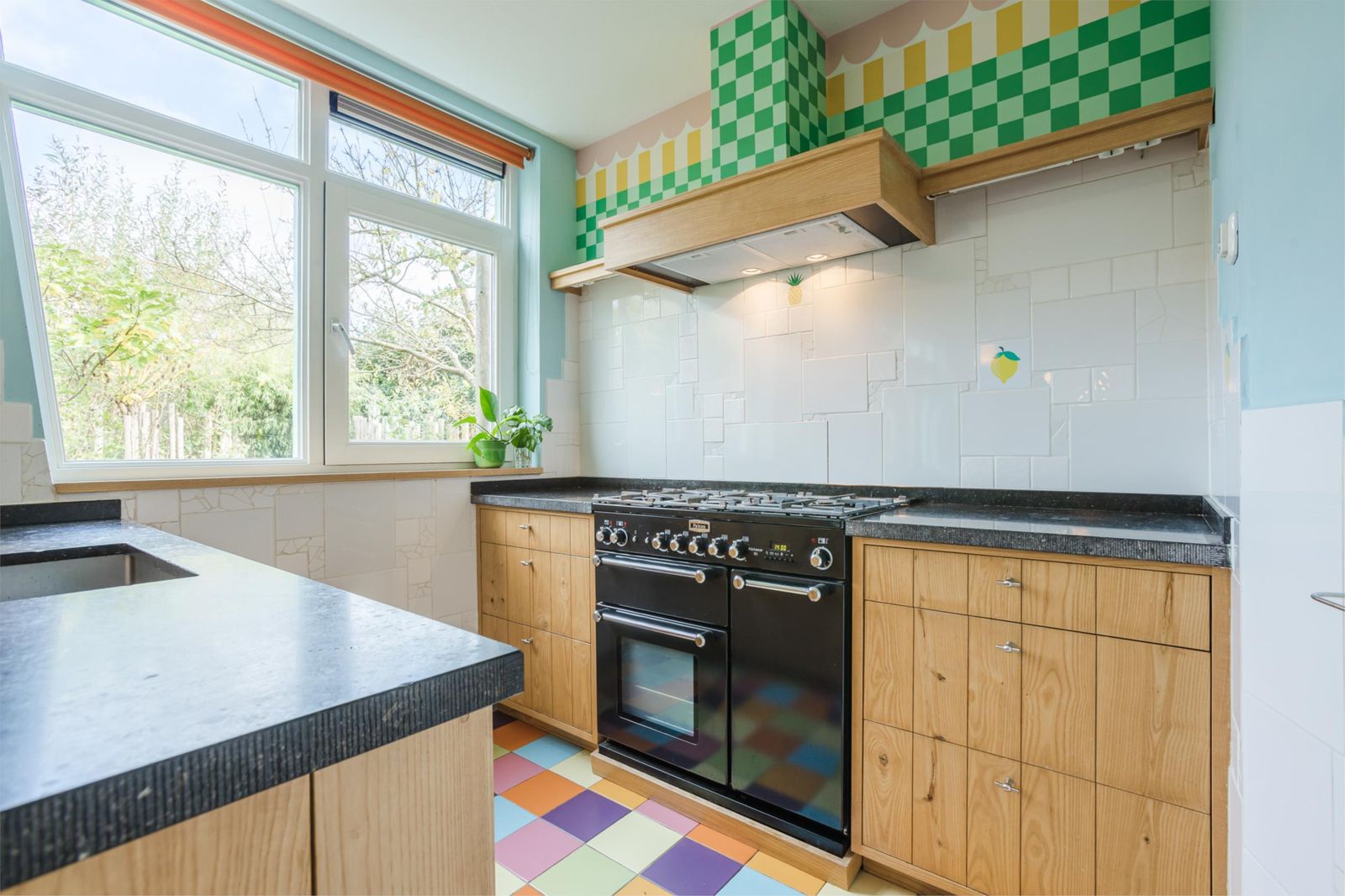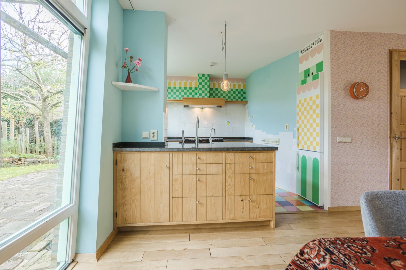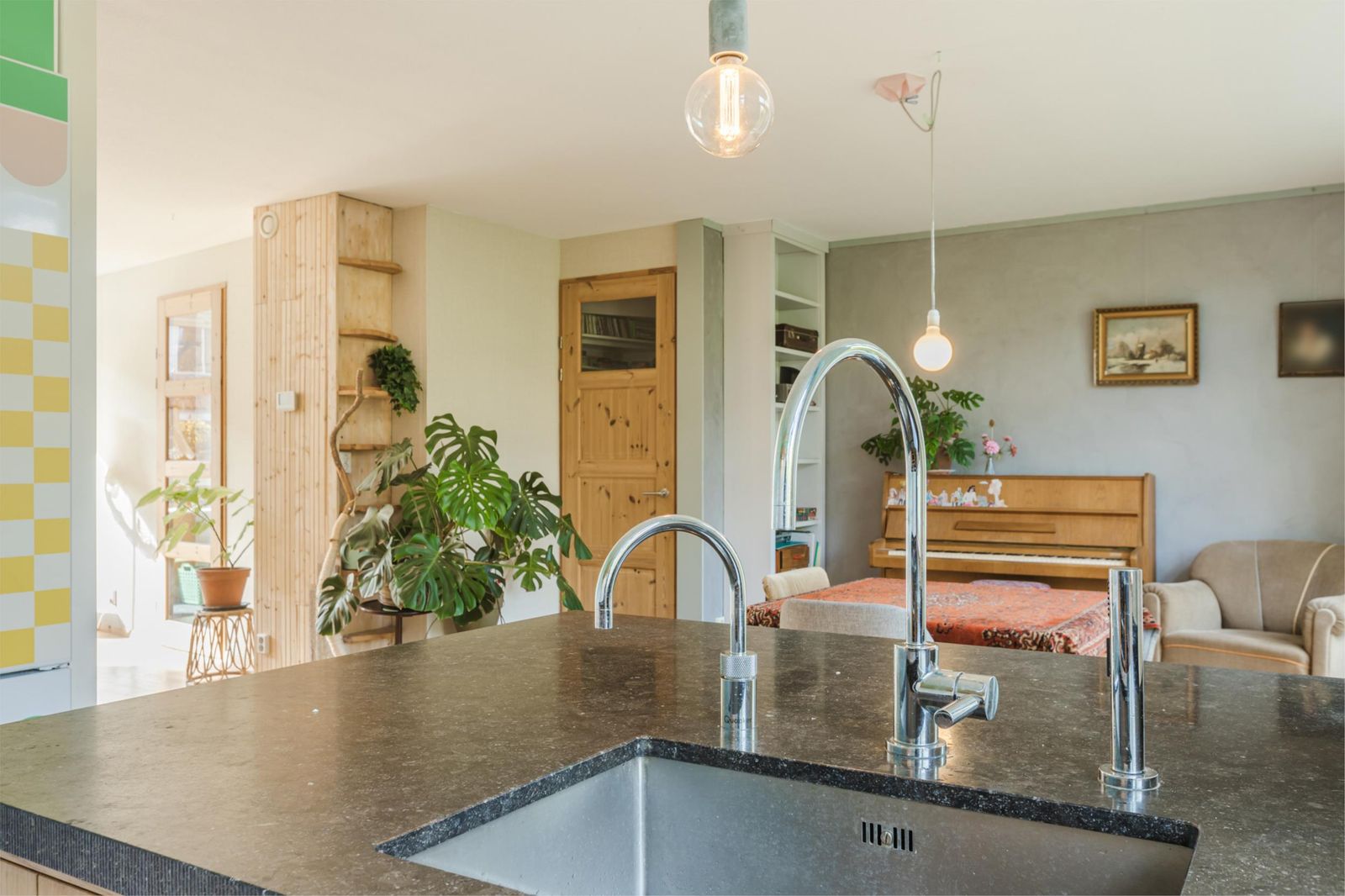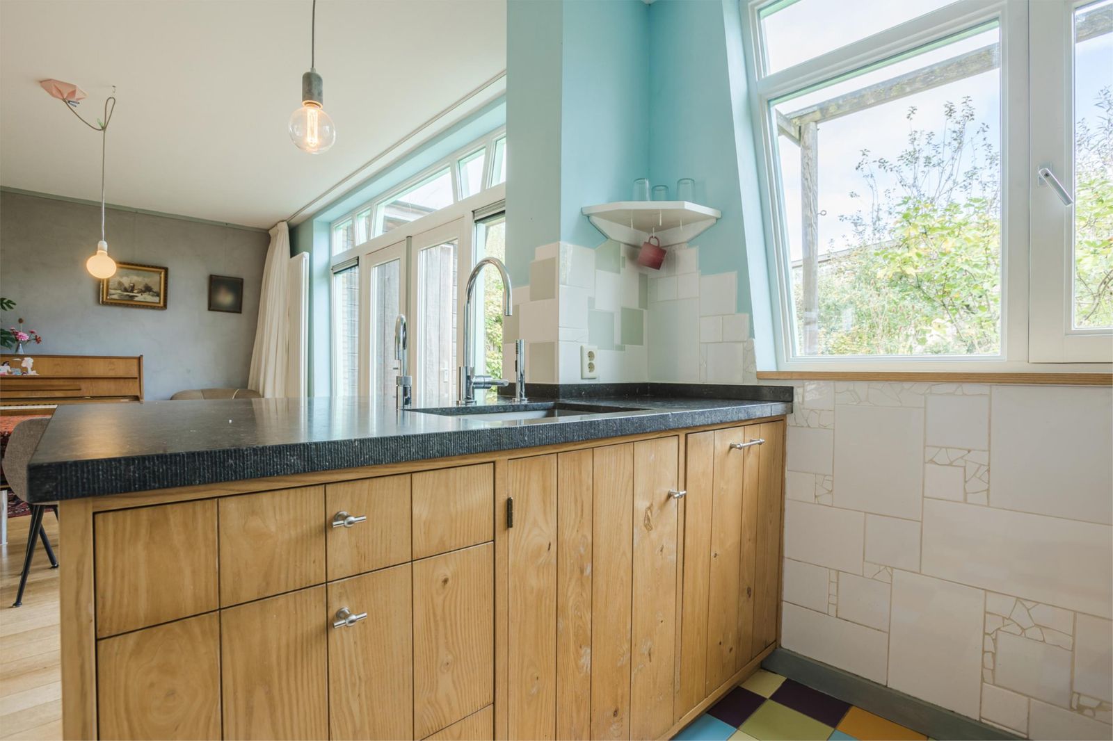 Hal/entree, meterkast, toilet, garderobe, trapopgang naar eerste verdieping. Keuken met kookeiland en diverse inbouwapparatuur: koelkast, vaatwasser, oven, gasplaat, afzuigkap en Quooker). Voorraadkast onder de trap.