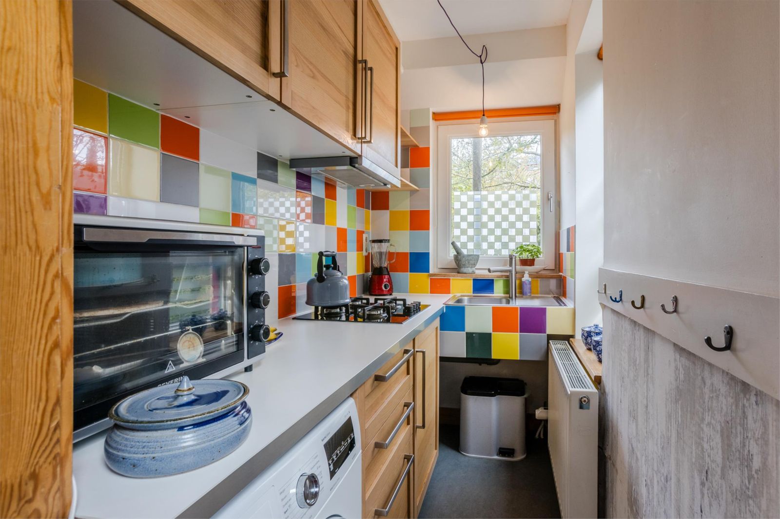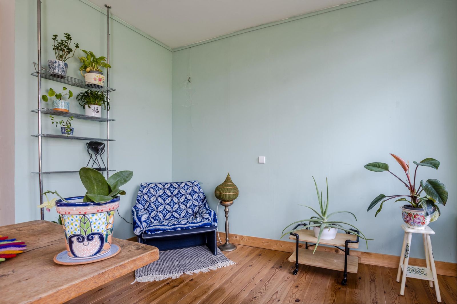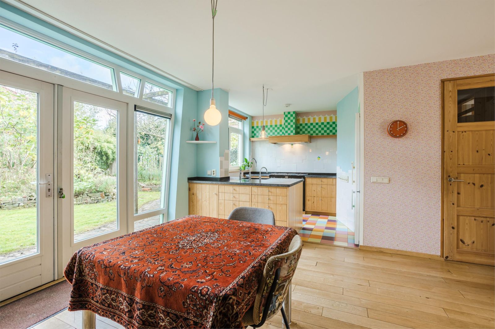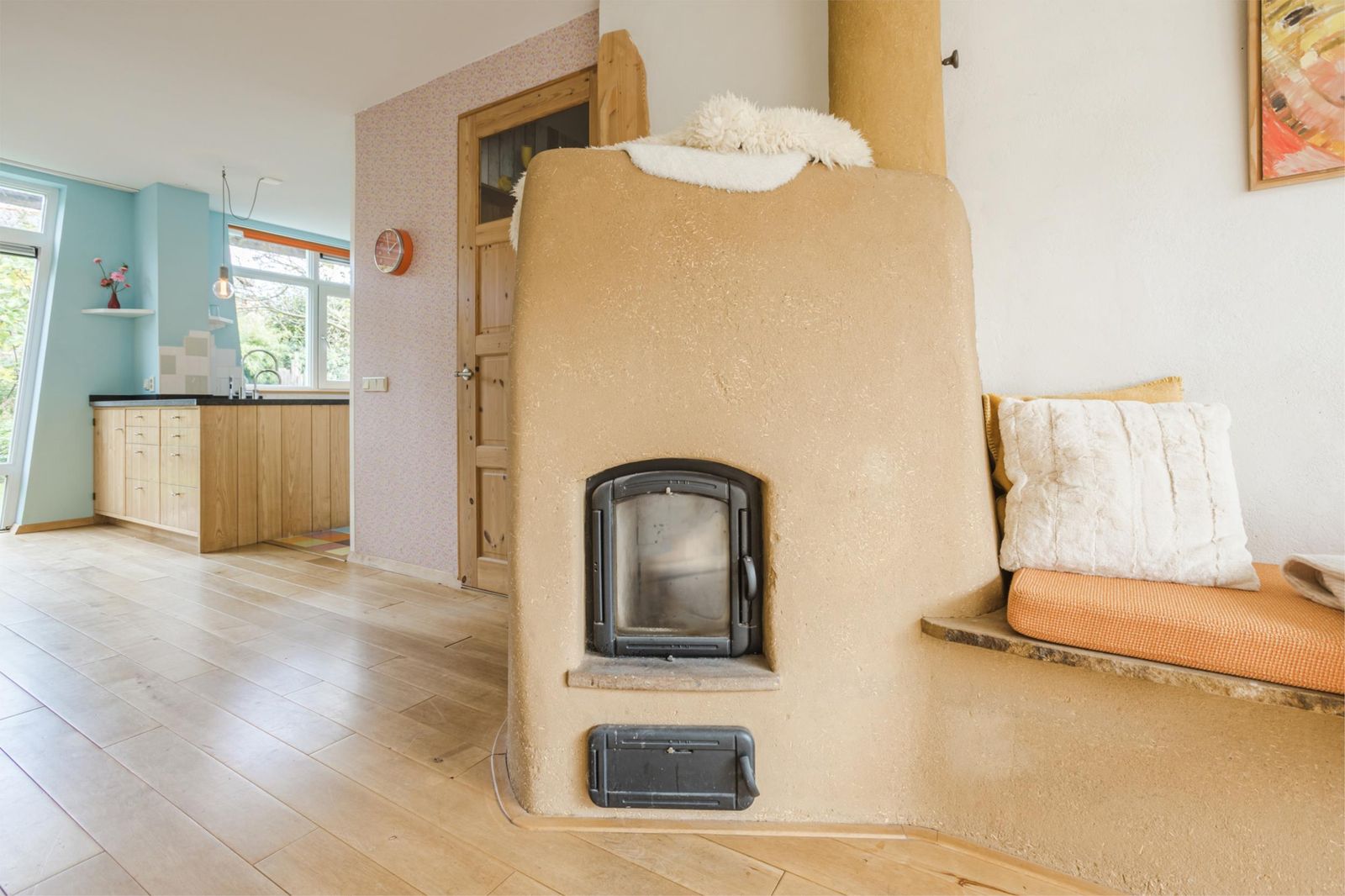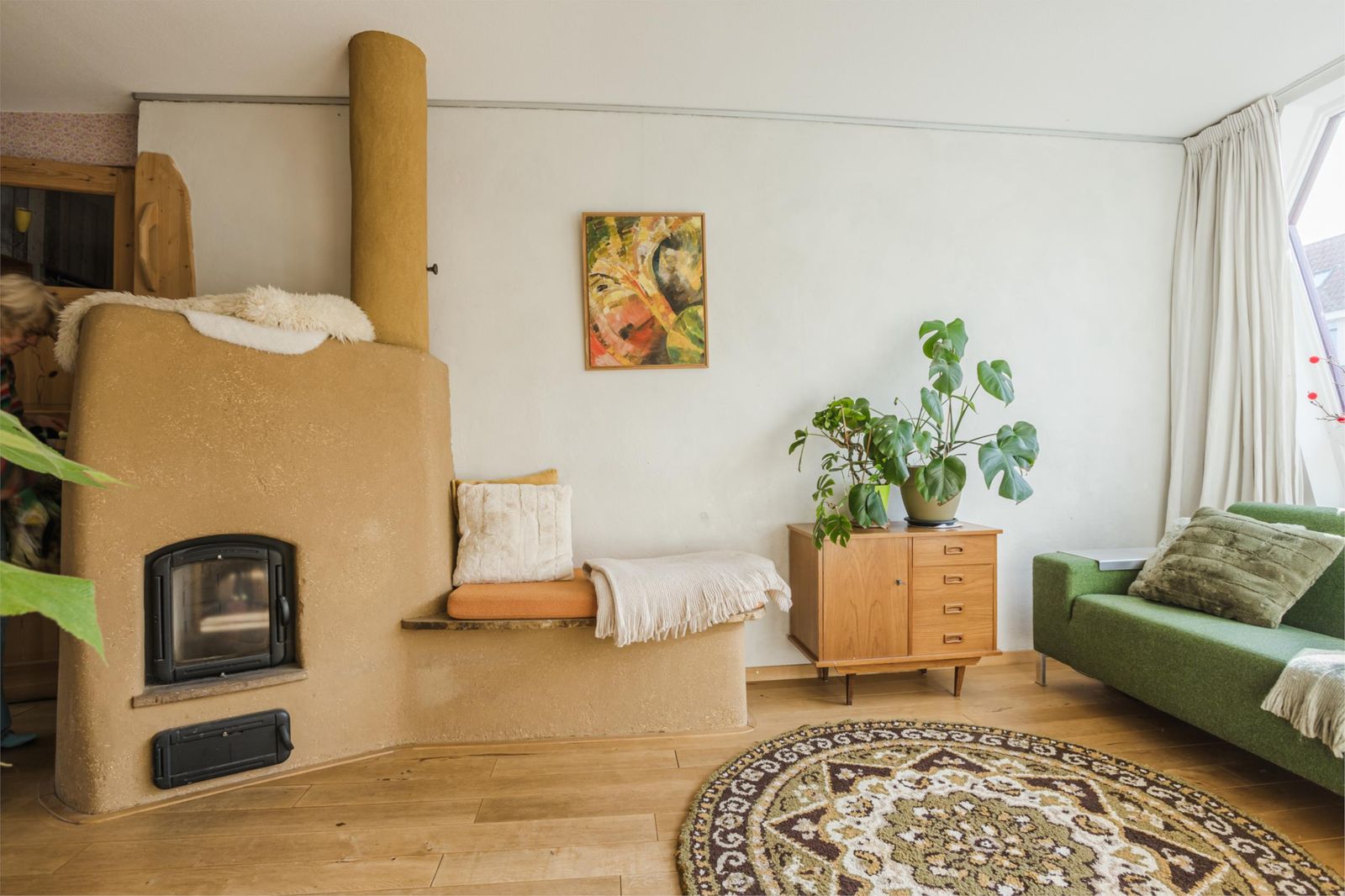 Openslaande deur naar het terras. Woonkamer met uitzicht op de gemeenschappelijke groene hof. In de woonkamer staat een leemkachel, die de hele dag zijn warmte vasthoudt. De gehele ruimte is voorzien van een houten vloer en wanden afgewerkt met leem.