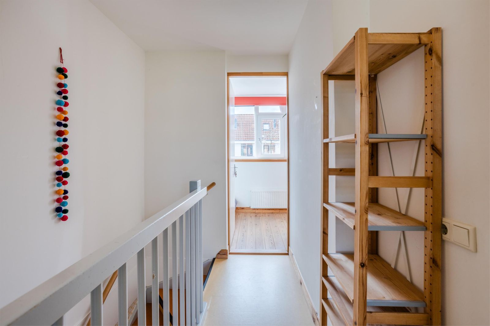 Overloop met kastenwand, wastafelmeubel, ruimte voor wasmachine en wasdroger. Toilet. Twee grote slaapkamers. Slaapkamer aan de voorzijde heeft zonwering.