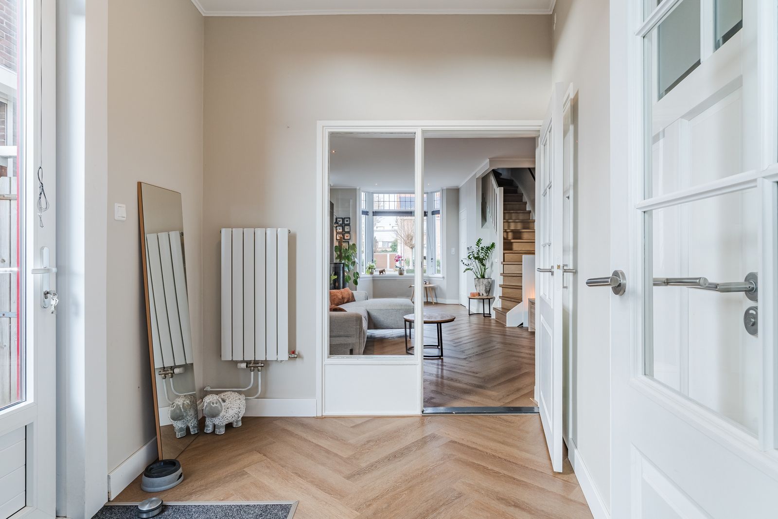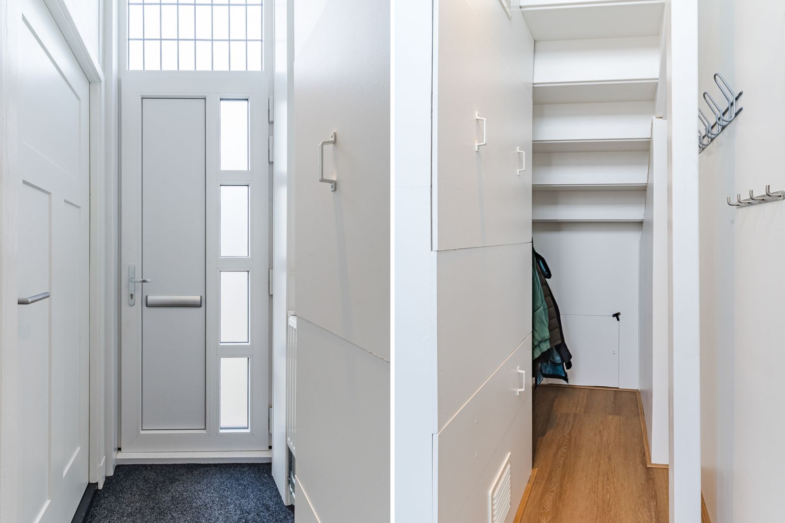 In de tussenhal is toegang naar een royale inbouwkast, badkamer, keuken en buitendeur naar de tuin.