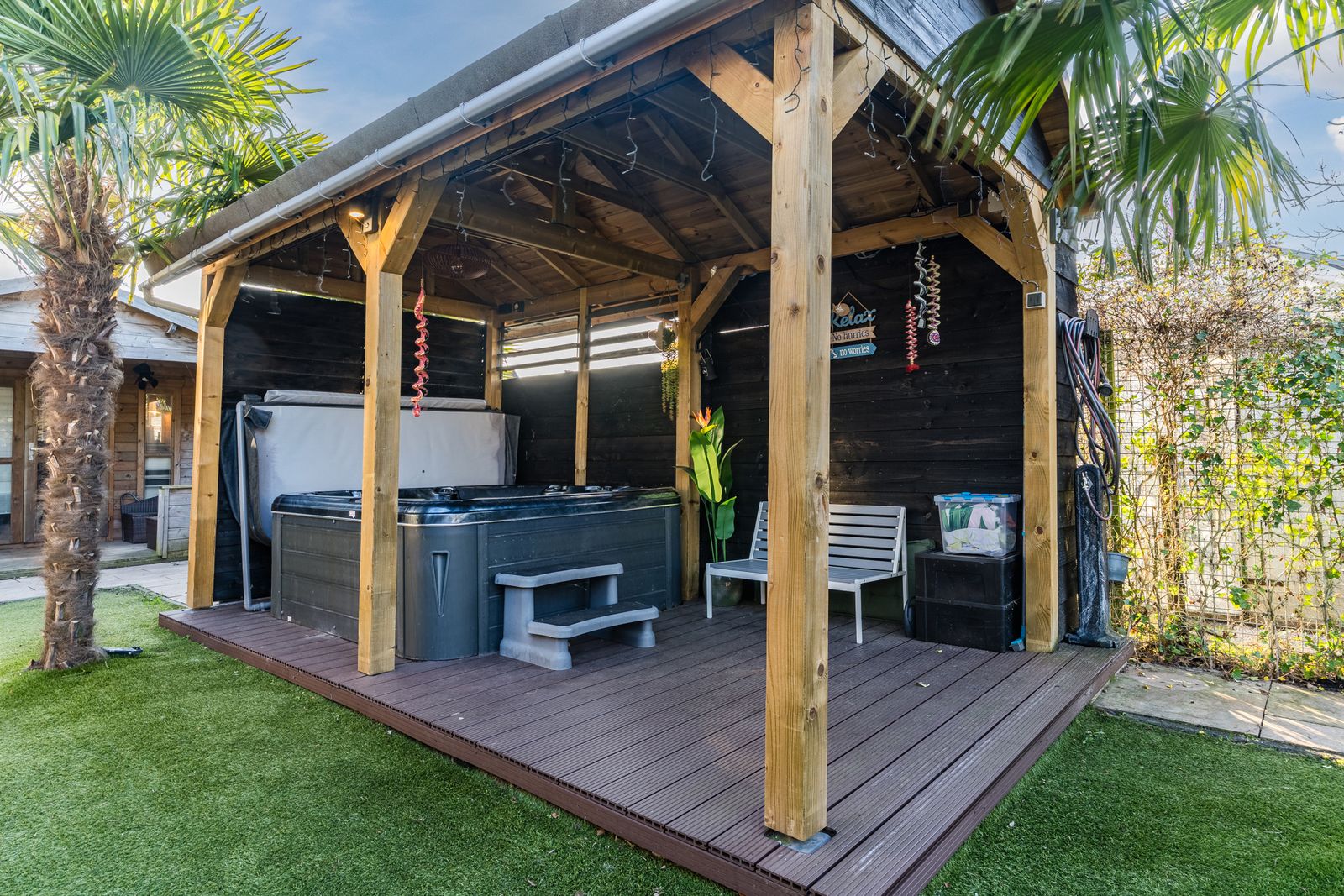 - Overkapping ca. 5,00 x 3,00 met 5 persoons jacuzzi en diverse elektra aansluitingen