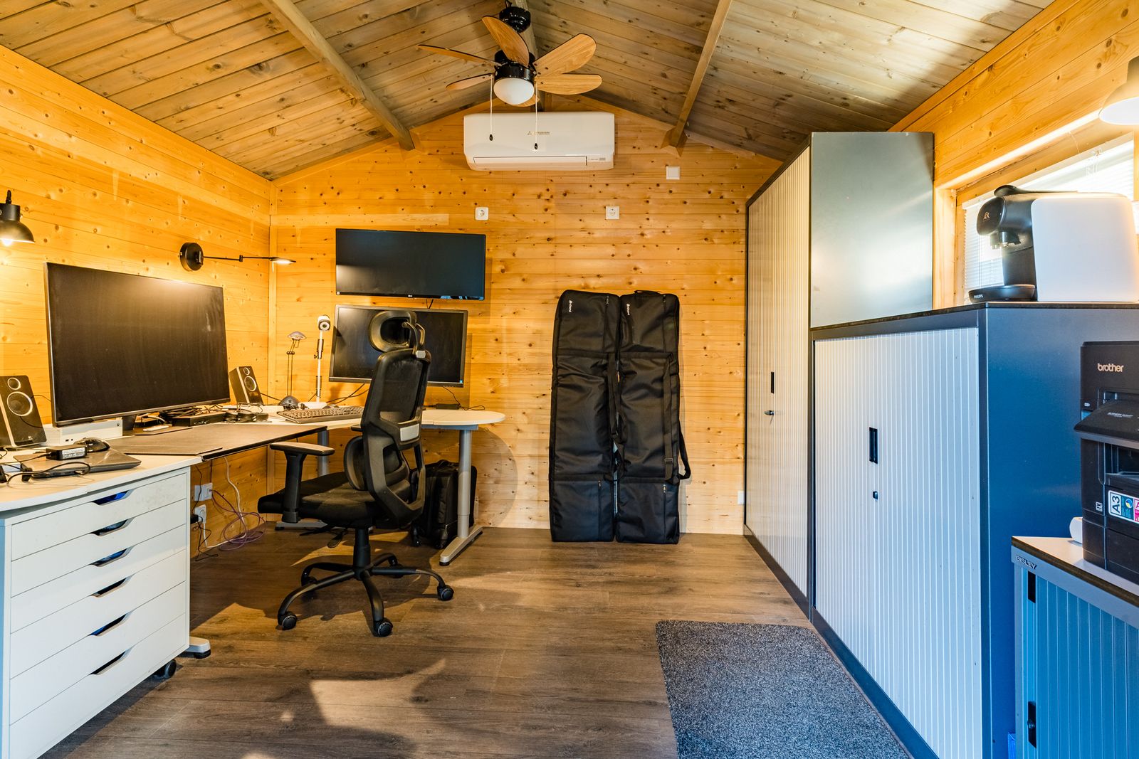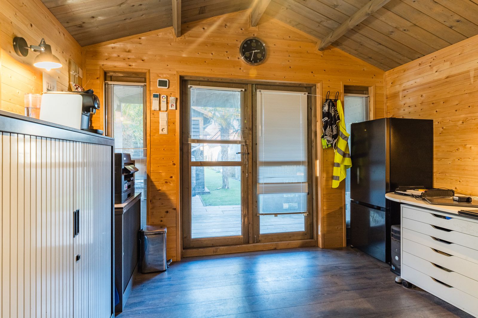 - Houten tuinhuis met veranda 3,35x3,37 voor bijvoorbeeld werken aan huis, volledig geïsoleerd, met airco-unit, elektrische aansluitingen, meterkast en glasvezel en internetverbinding