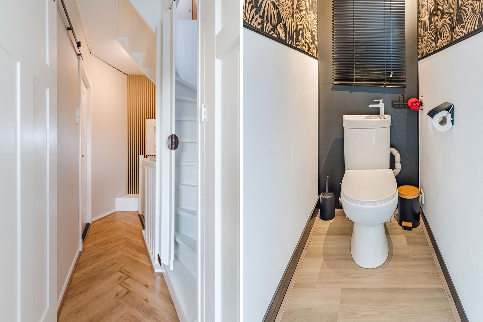 Overloop met vaste inbouwkast, toilet met sanibroyeur (2022), wasbak en inbouwkast, grote slaapkamer aan achterzijde is voorzien van een inbouwkast, airco-unit en kiepkantelraam welke kan dienen als deur en toegang geeft tot plat dak. De slaapkamer aan de voorzijde heeft een vast bed en elektrische verwarming. Alle kozijnen zijn kunststof en voorzien van HR++ glas.