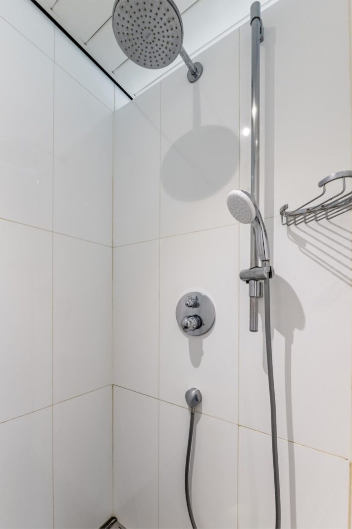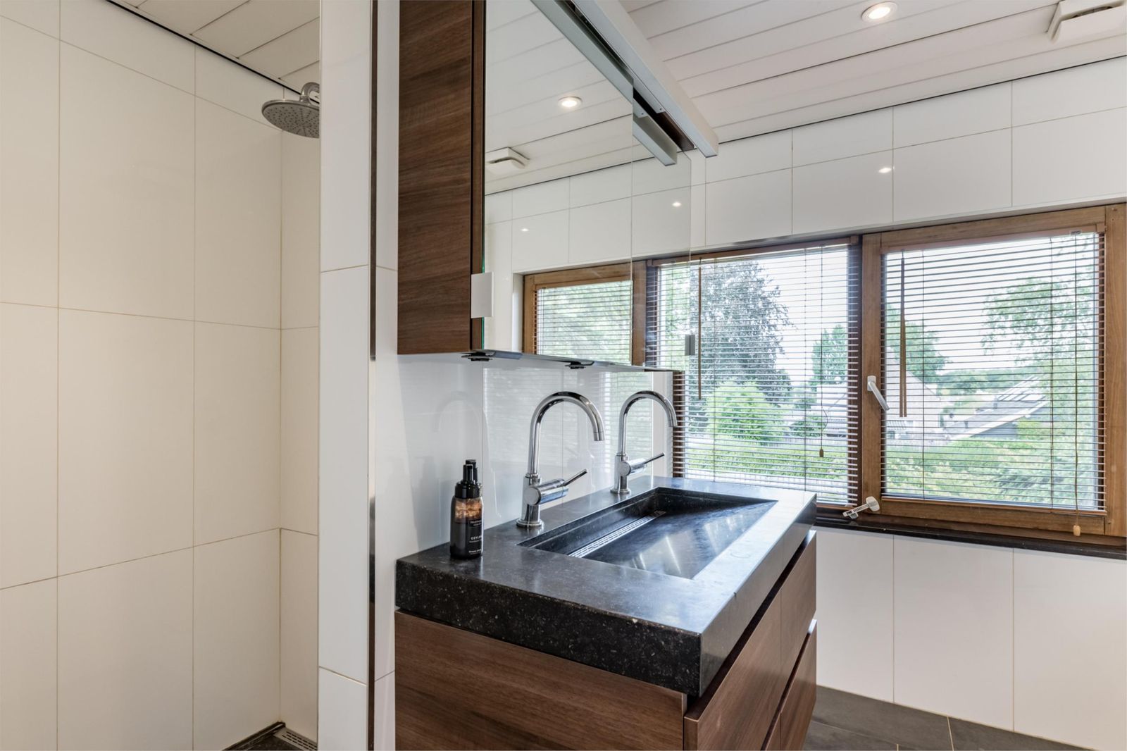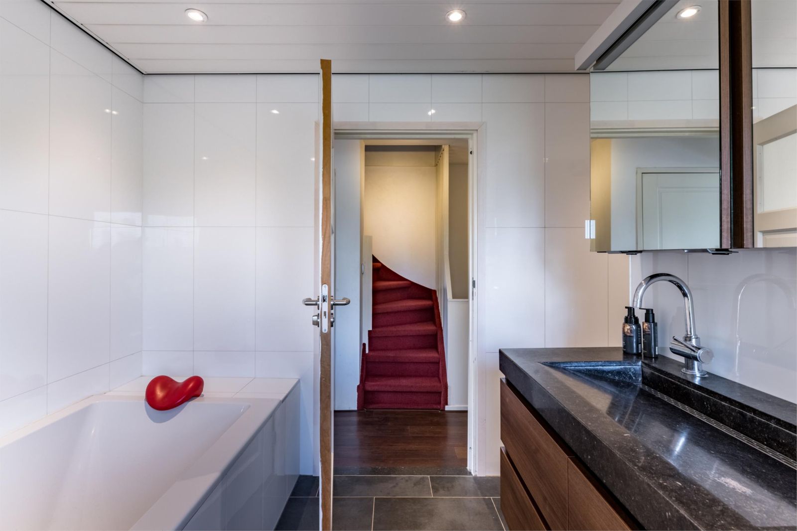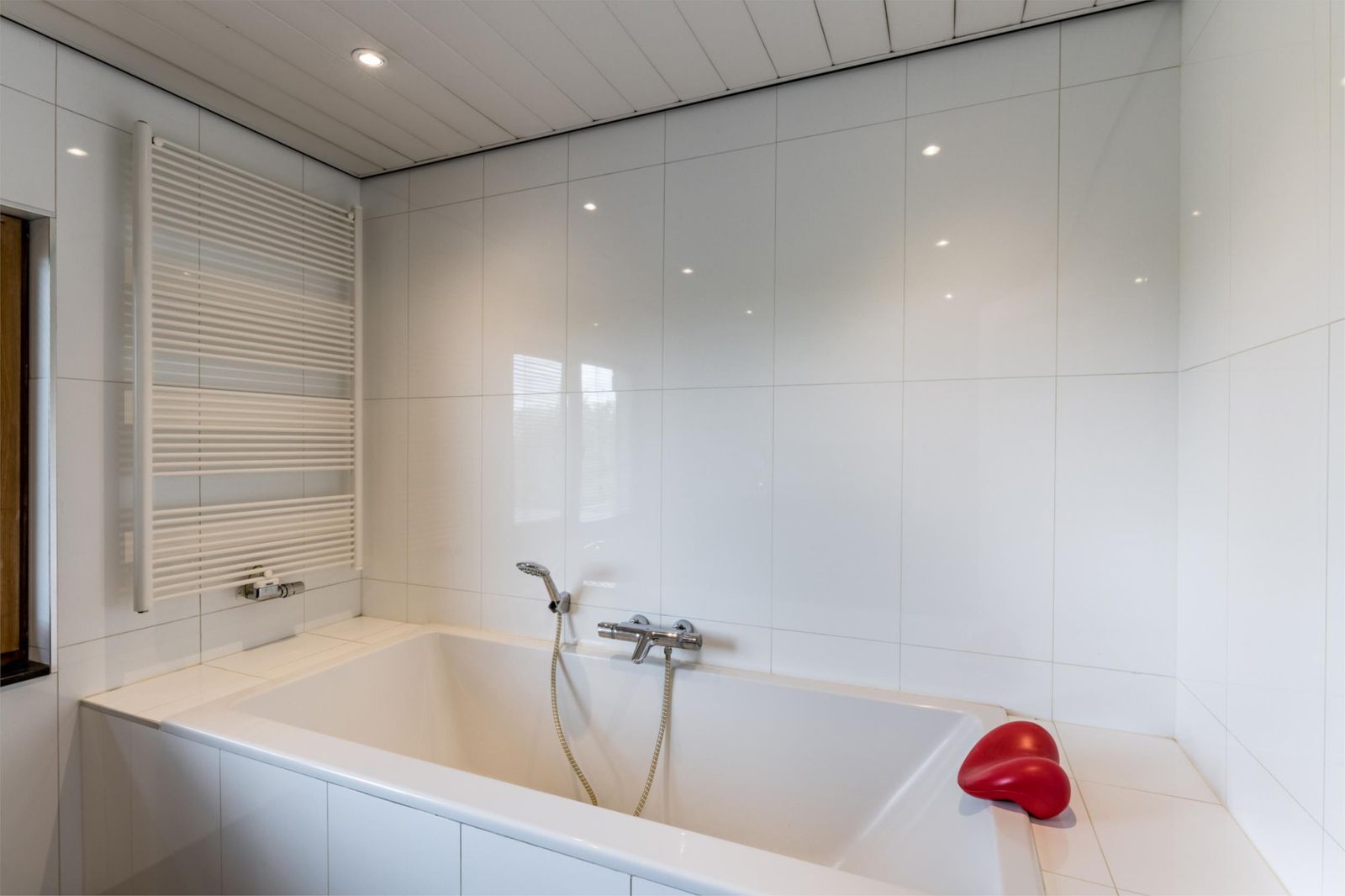 De moderne badkamer is voorzien van een extra groot ligbad, douche met regendouche en handdouche, wastafel met meubel, wandcloset, radiator, spotjes, mechanische afzuiging en vloerverwarming.