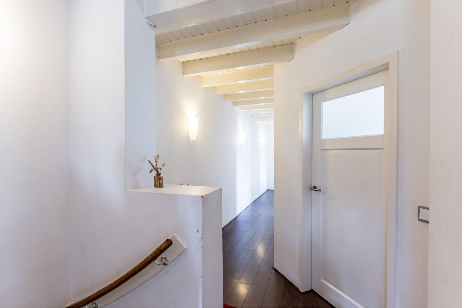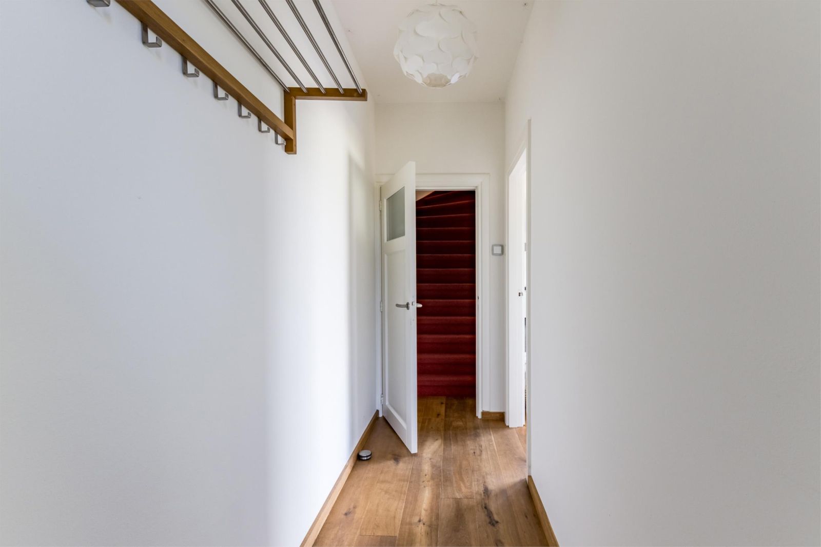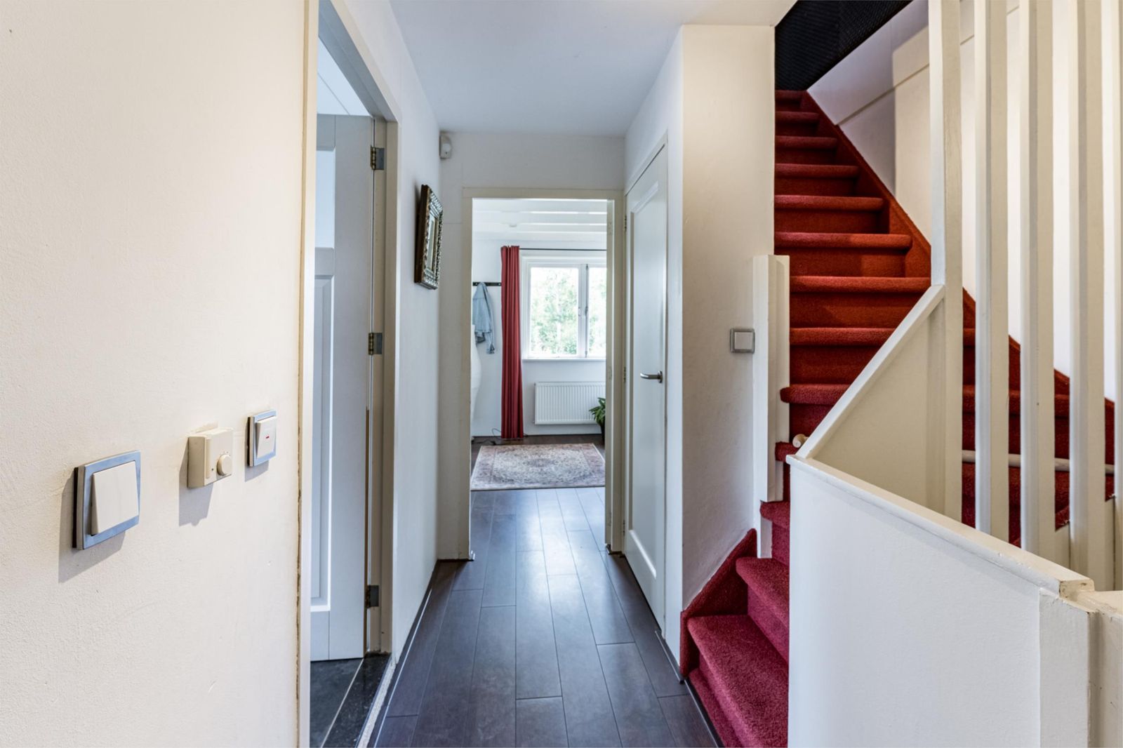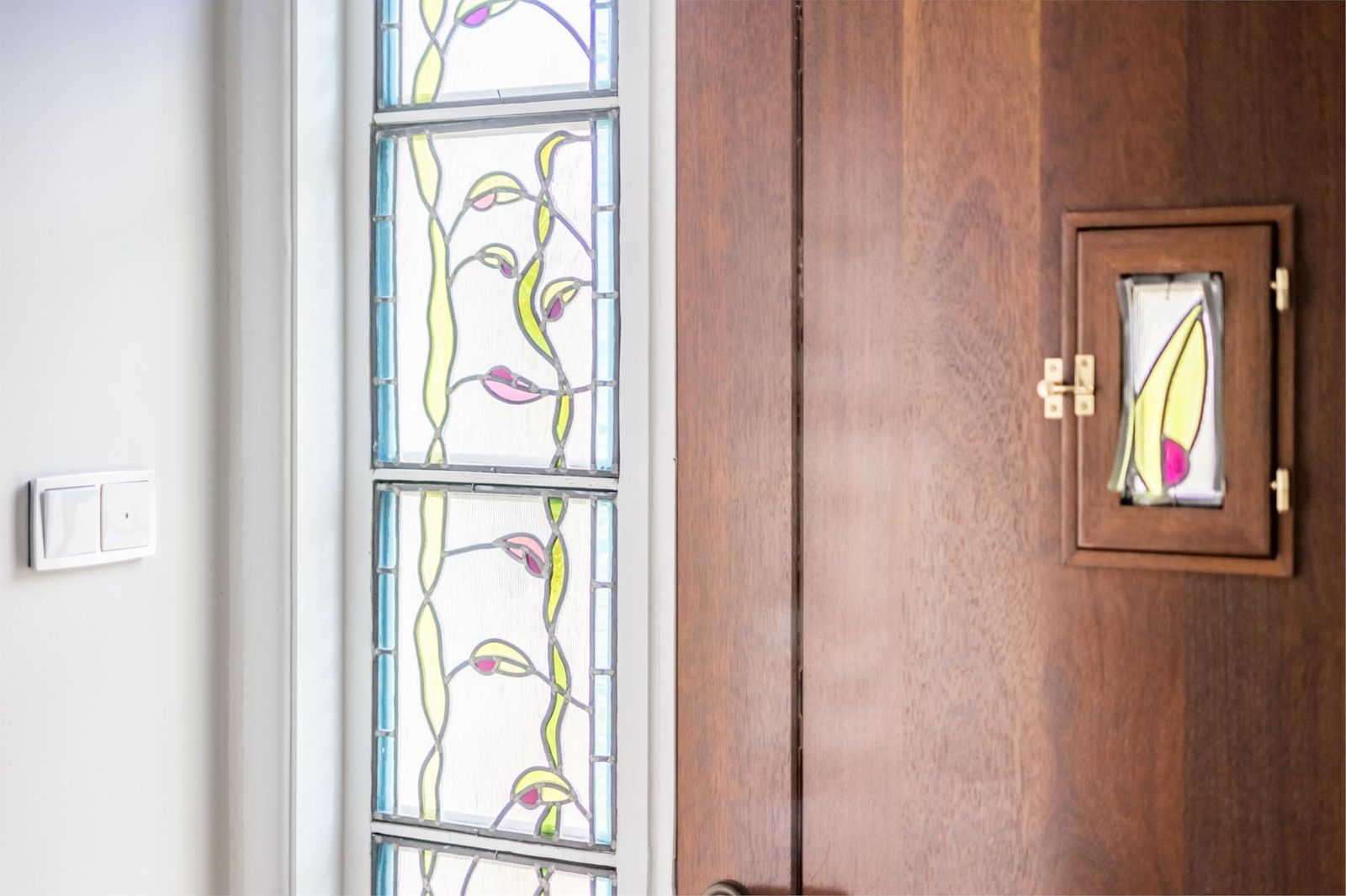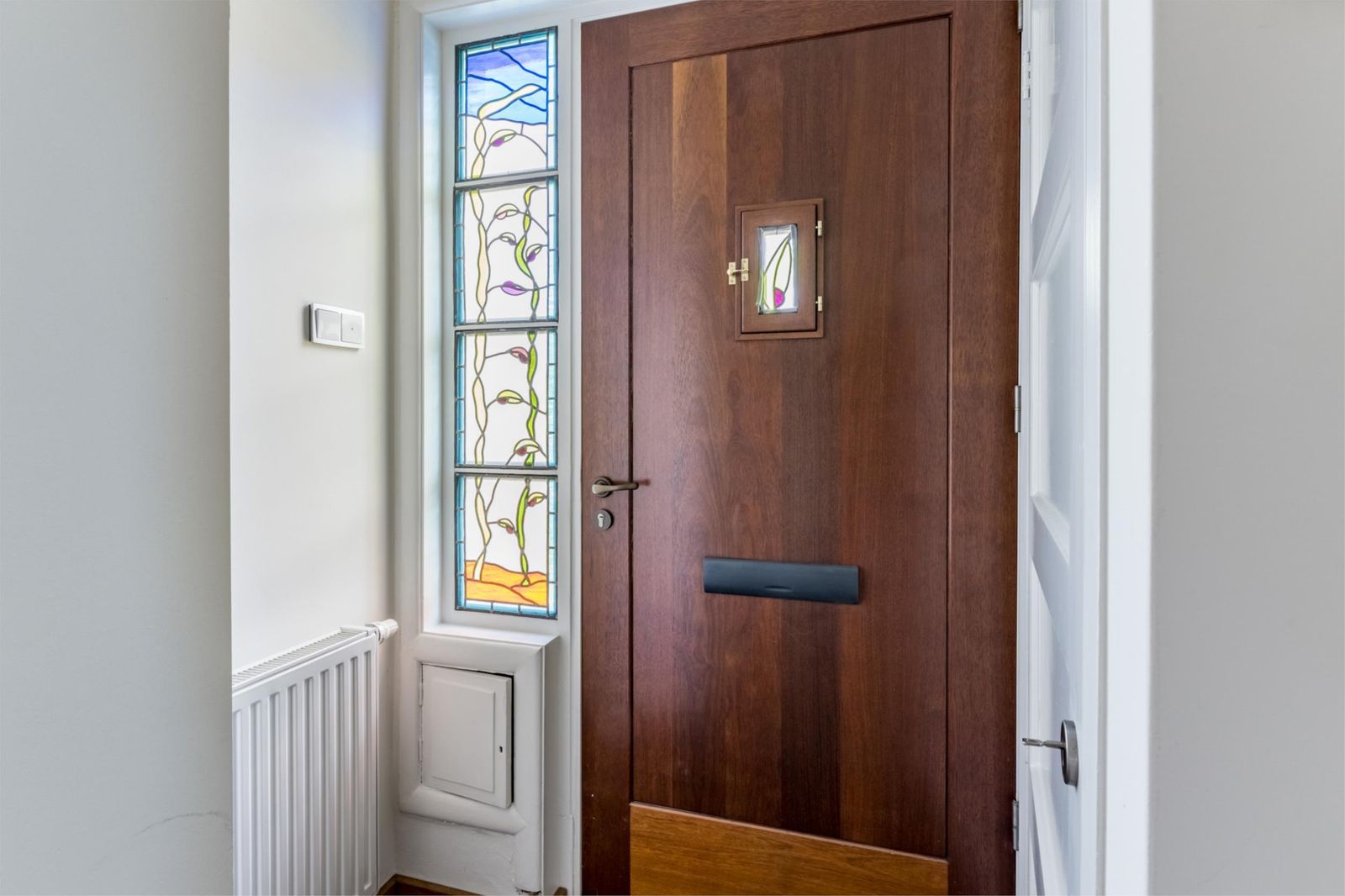 Je komt het huis binnen door de eikenhouten voordeur voorzien van speciaal voor het huis ontworpen glas in lood. De hal geeft toegang tot de woonkamer en naar de 1e verdieping.