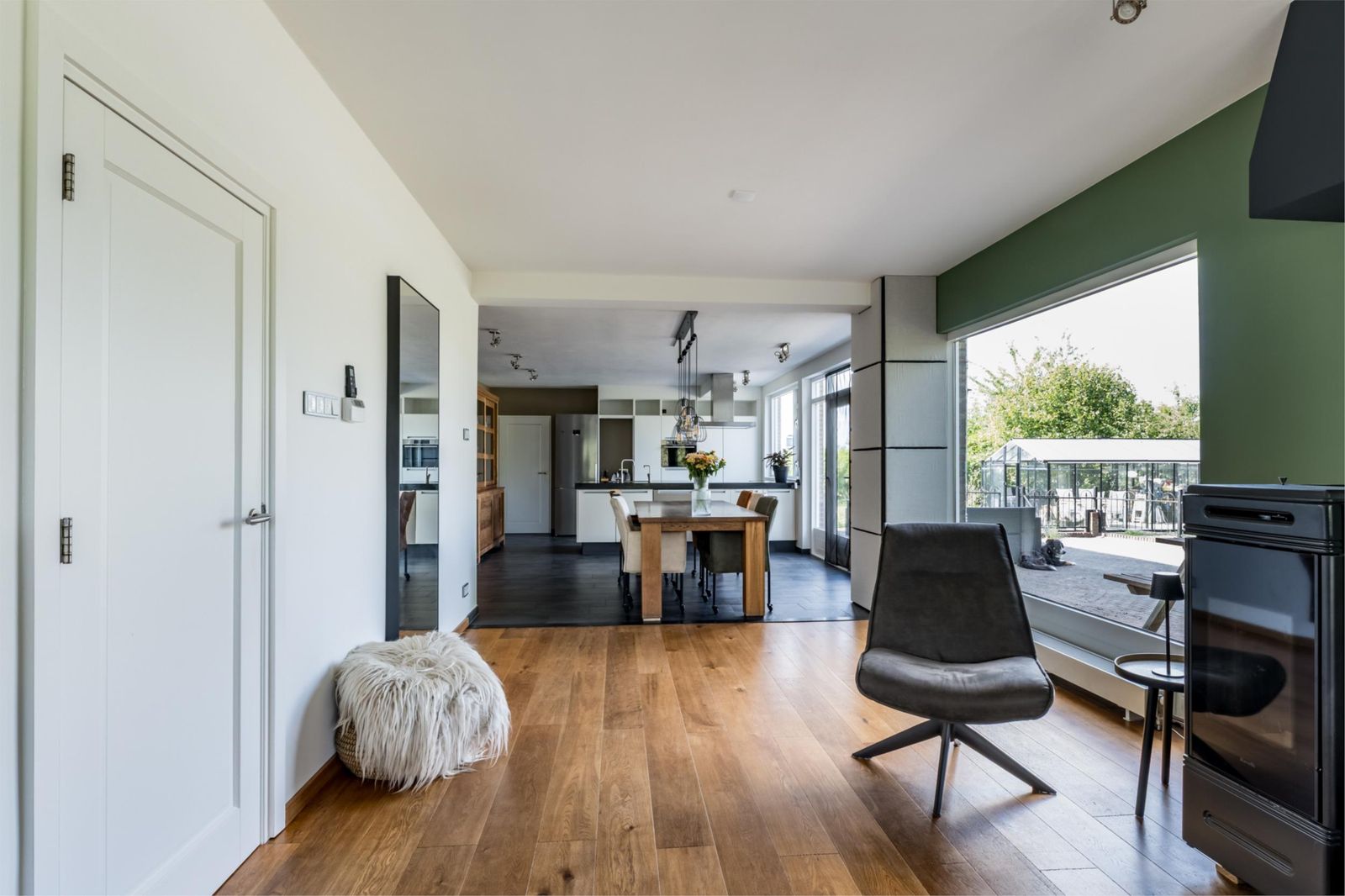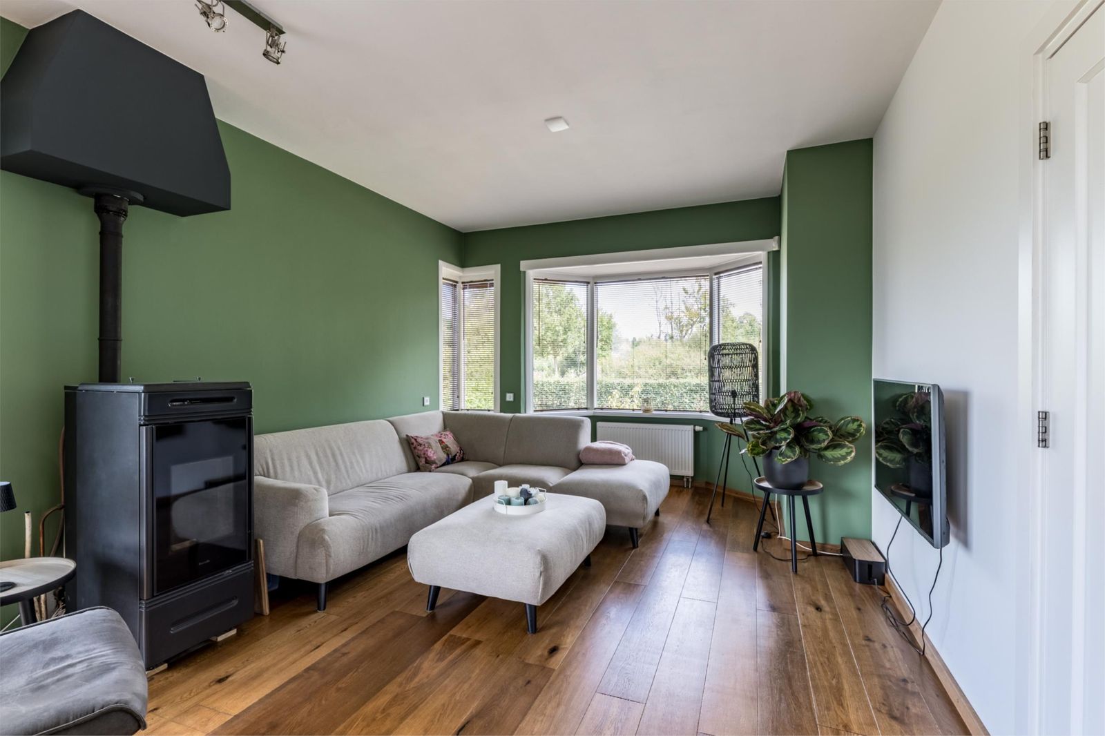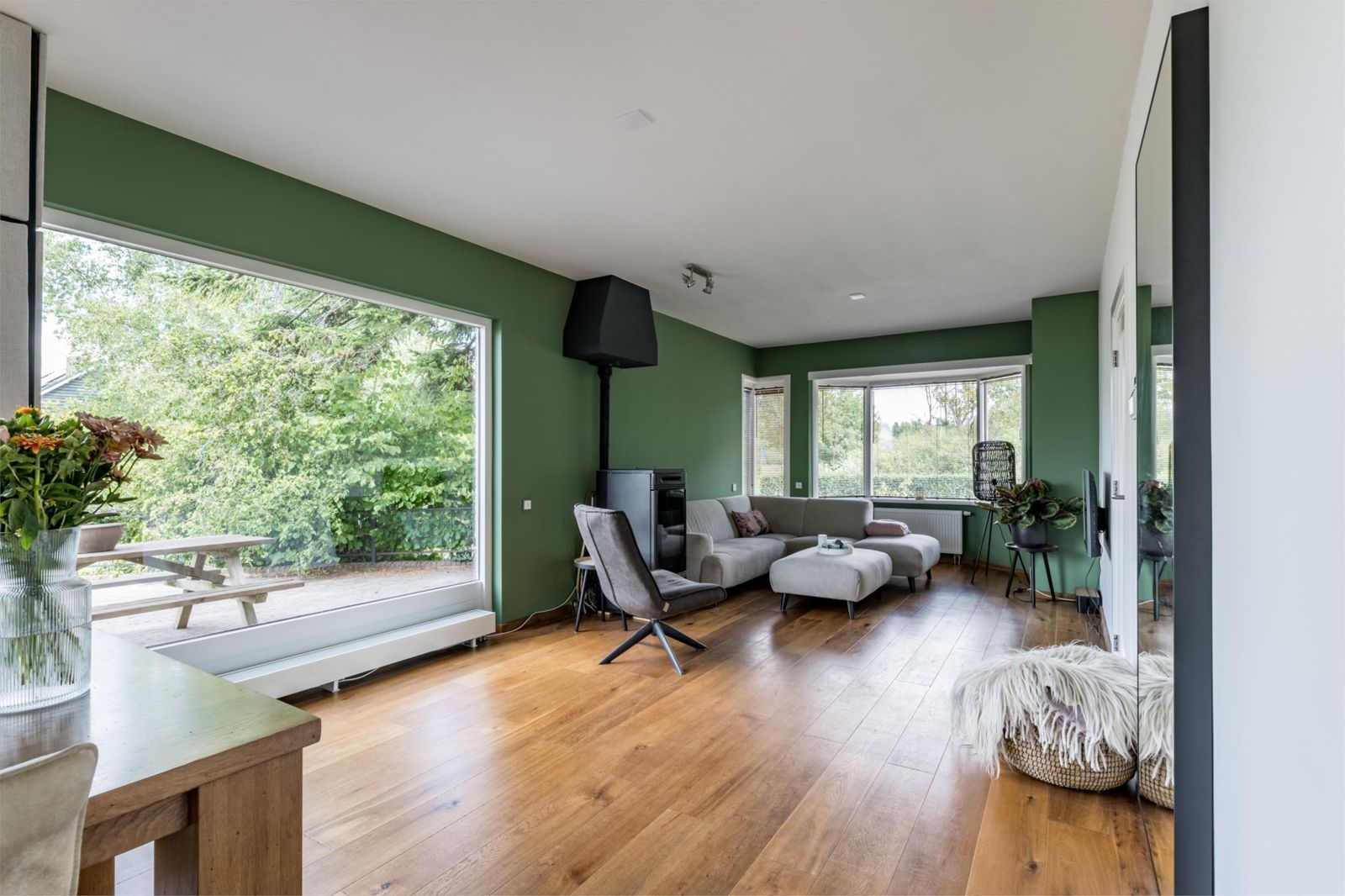 De woonkamer is een heerlijk lichte ruimte vanwege de raampartijen in de voor- en zijgevel,