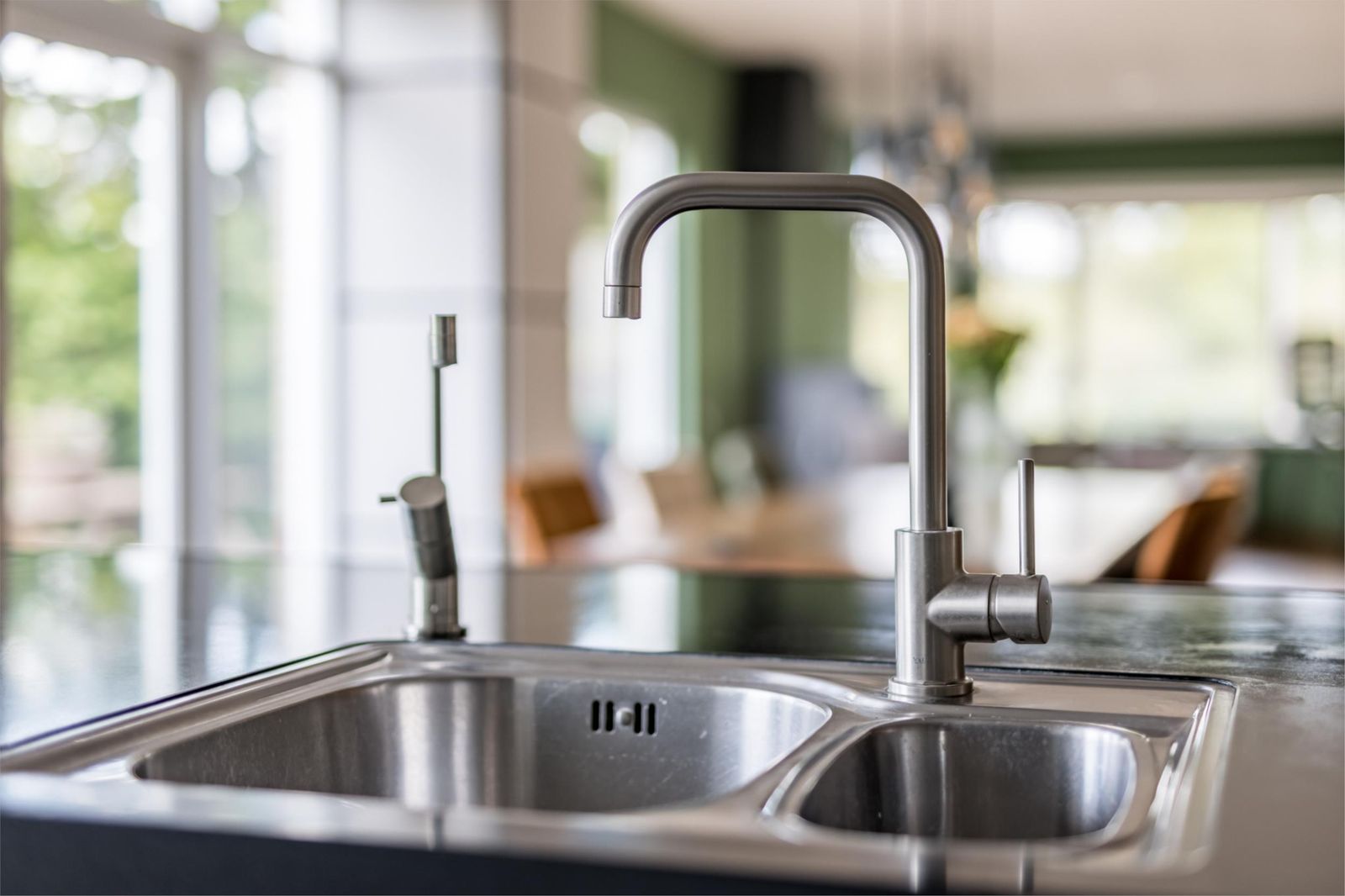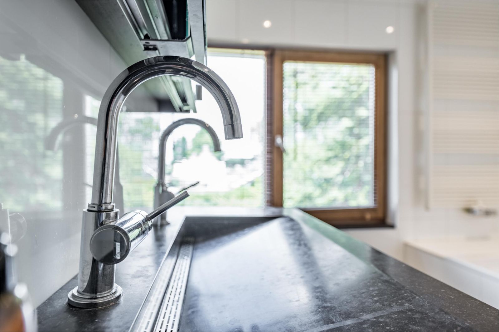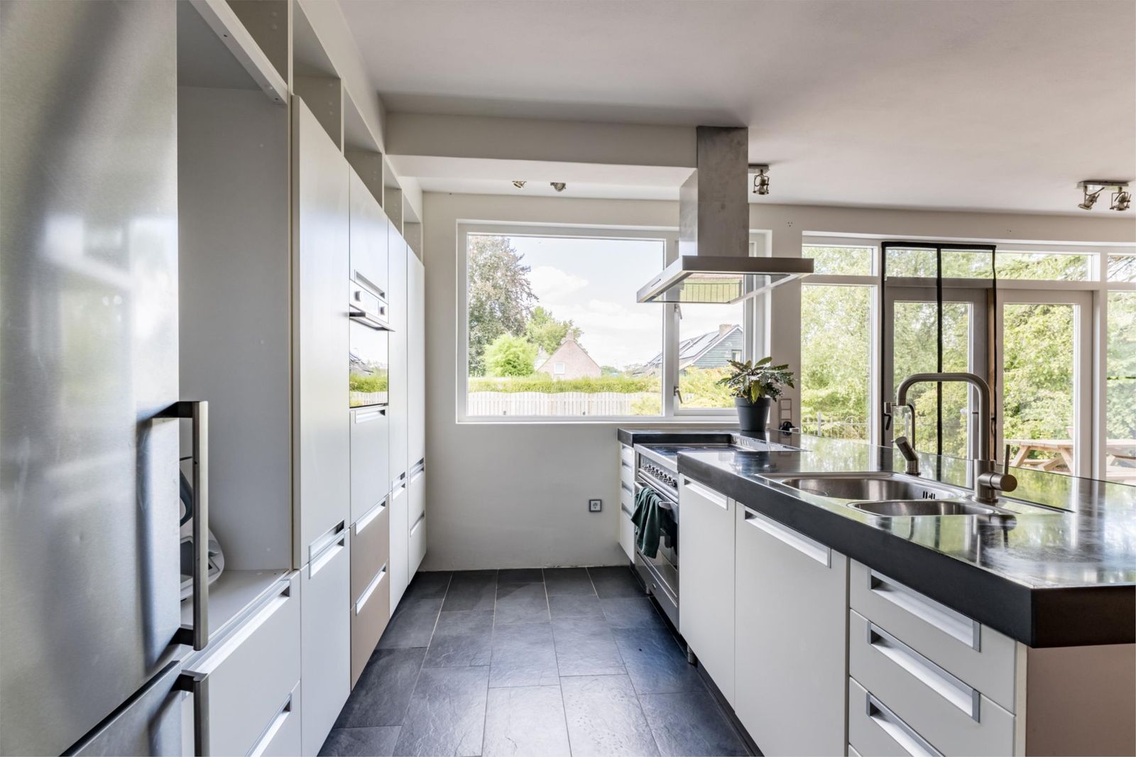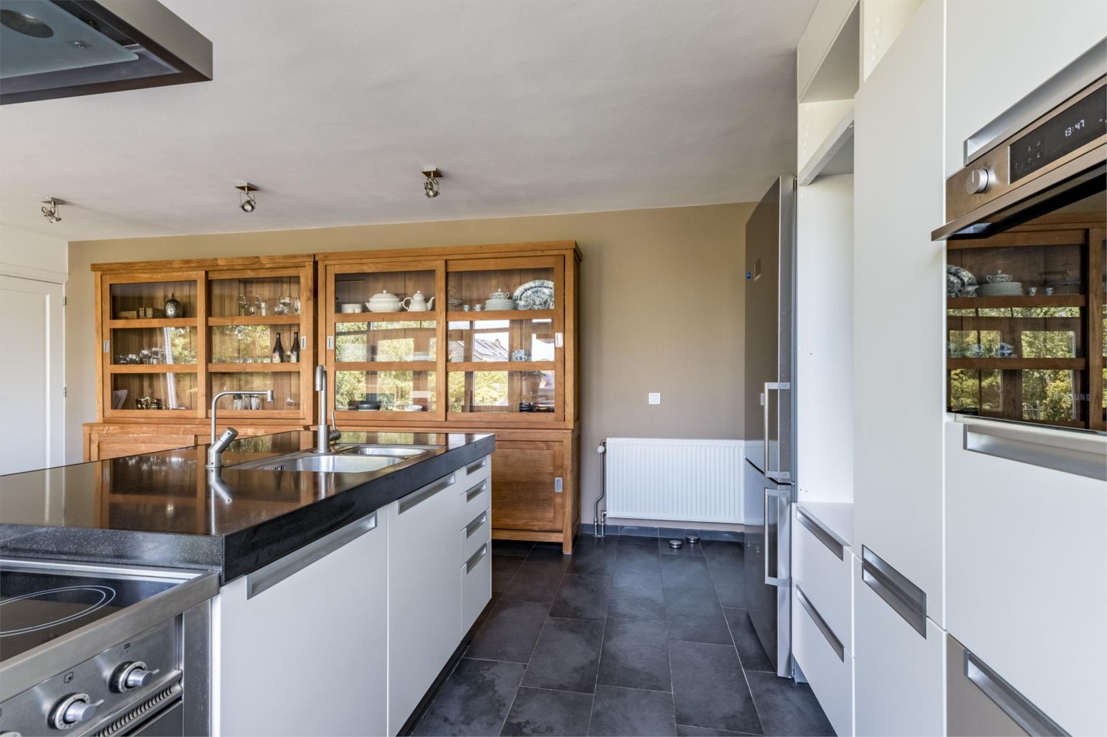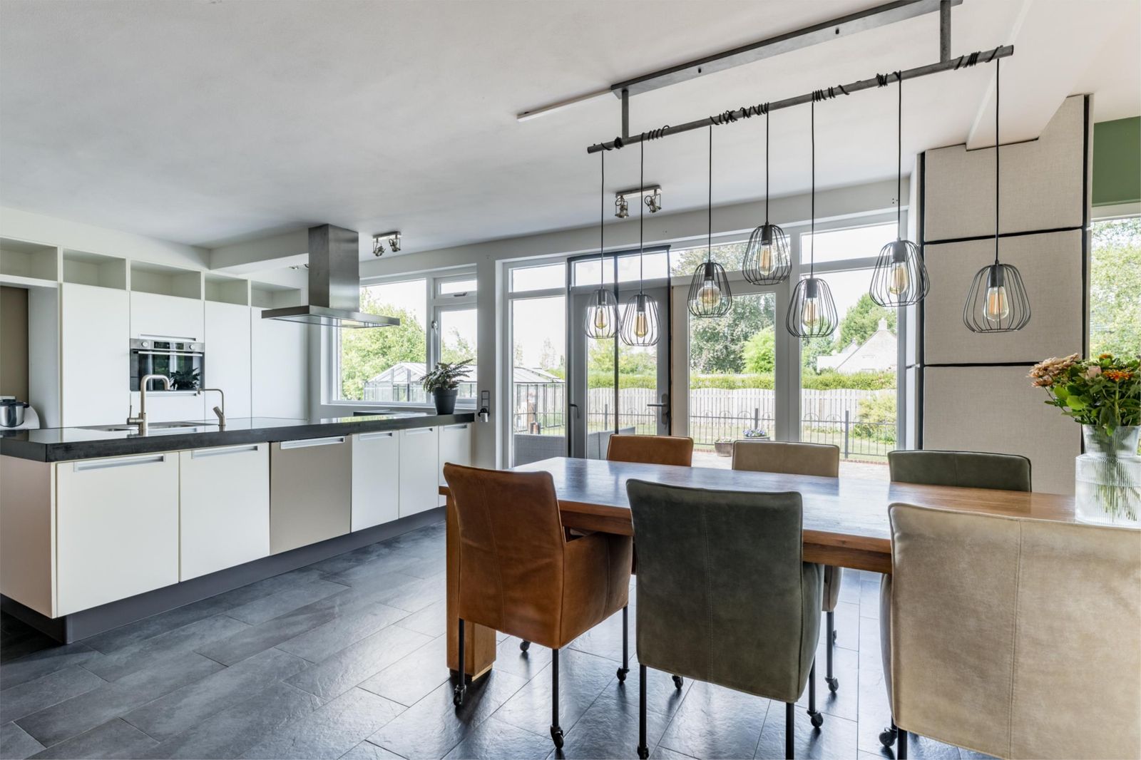 Deze ruime woonkeuken met tegelvloer is voorzien van een keramisch fornuis (90 cm) met grote oven, afzuigkap, vaatwasser (2024), Quooker, koel-vriescombinatie (2024), en combimagnetron (2024)