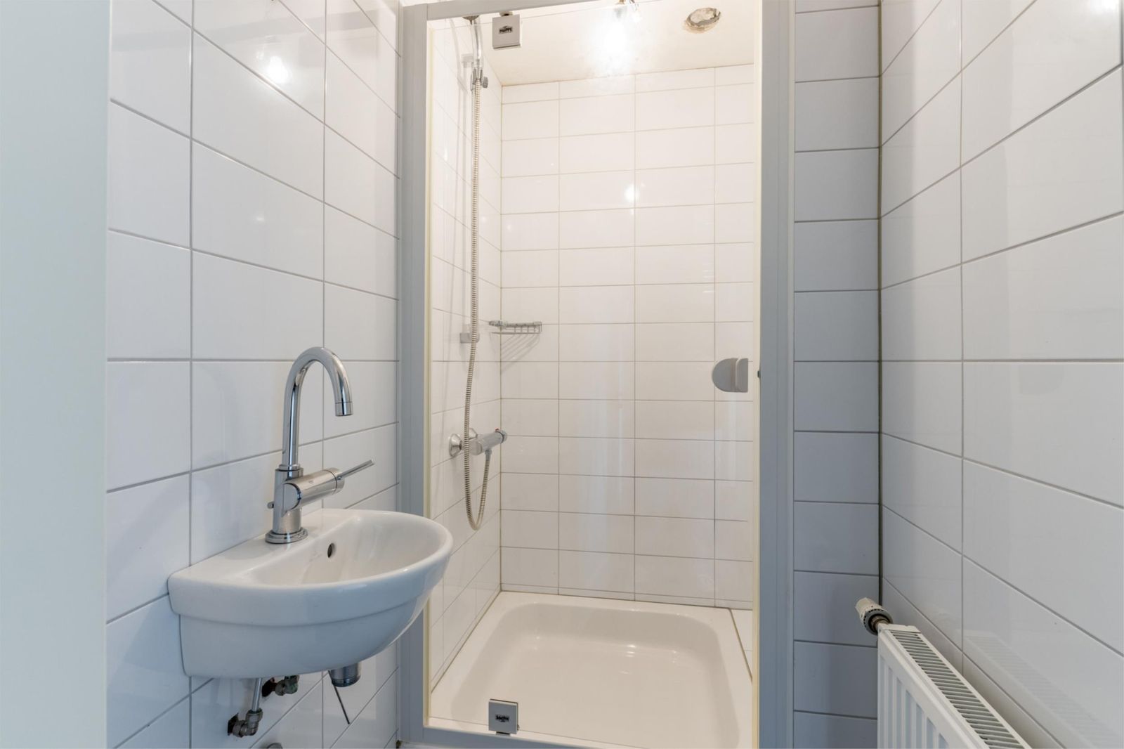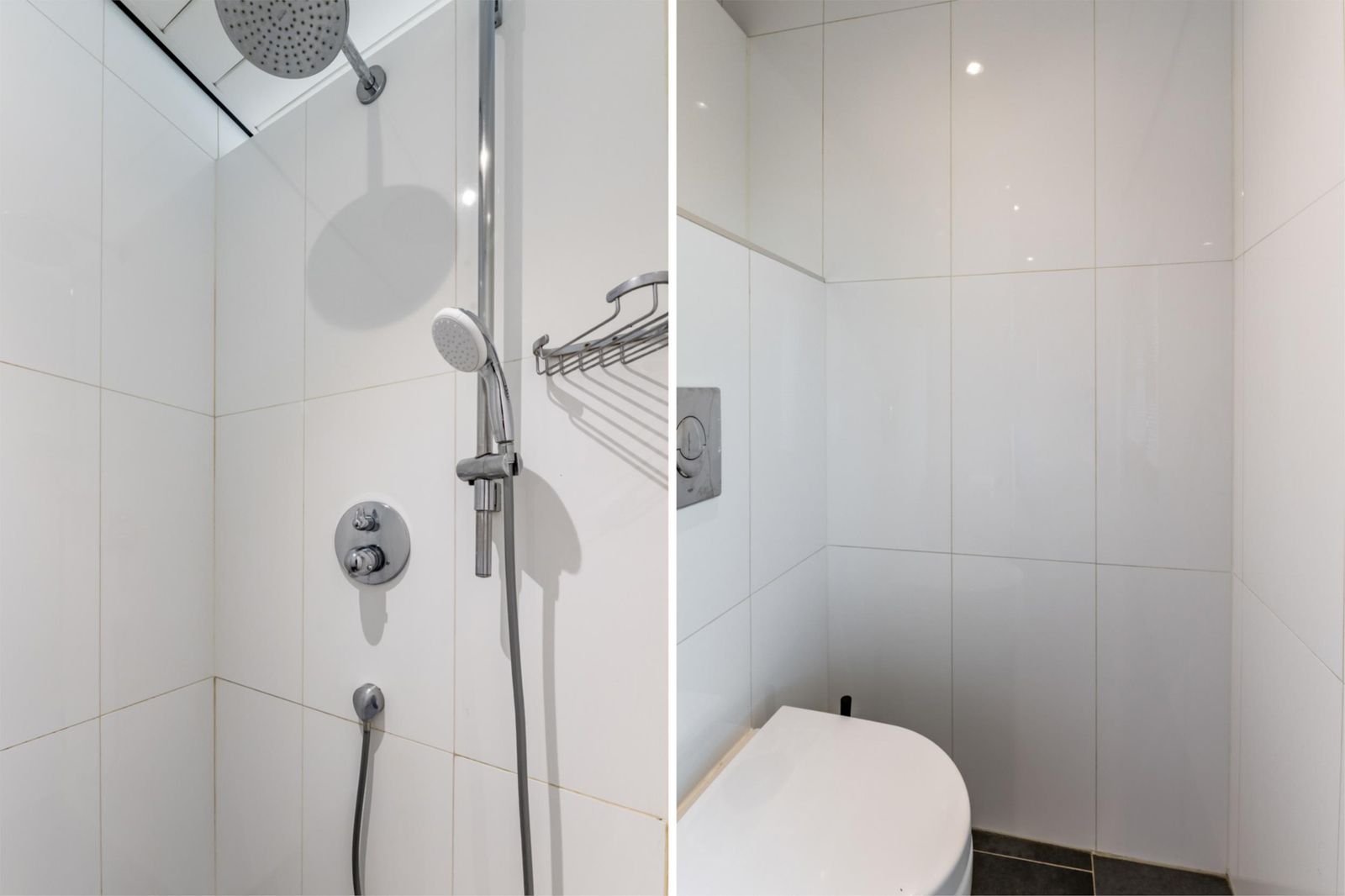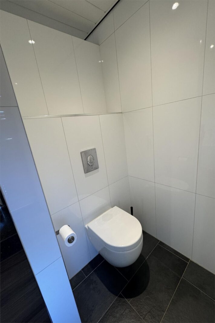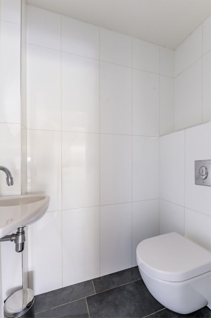 De toiletruimte is voorzien van een hangcloset en fonteintje en is afgewerkt met tegels op de vloer en geheel betegelde wanden.