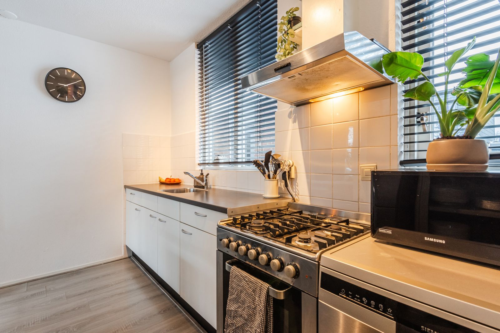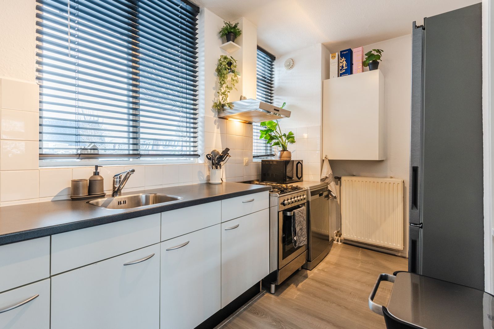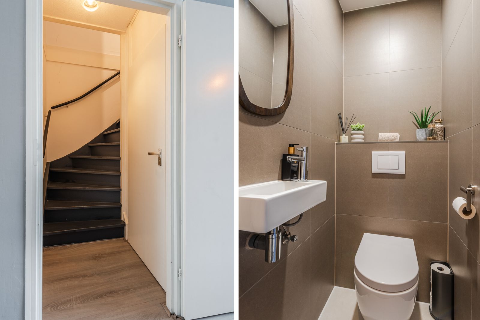 Begane grond: Ruime hal met vernieuwde meterkast (glasvezel aanwezig). Lichte woonkamer voorzien van laminaat met voldoende ruimte voor een eethoek. Ruime kast bevindt zich onder de trap voor praktische doeleinden. Dichte keuken met een rechte opstelling bestaande uit witte kastjes, gasfornuis en vaatwasser. Nieuw betegeld en modern toilet (2025).