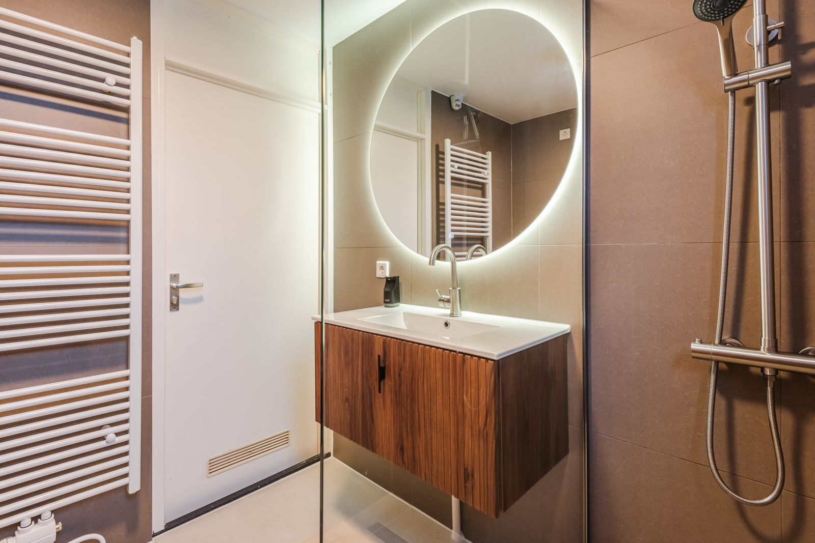 De badkamer is in 2025 volledig gerenoveerd en voorzien van een inloopdouche, zwevend toilet en een luxe wasmeubel met moderne spiegel.