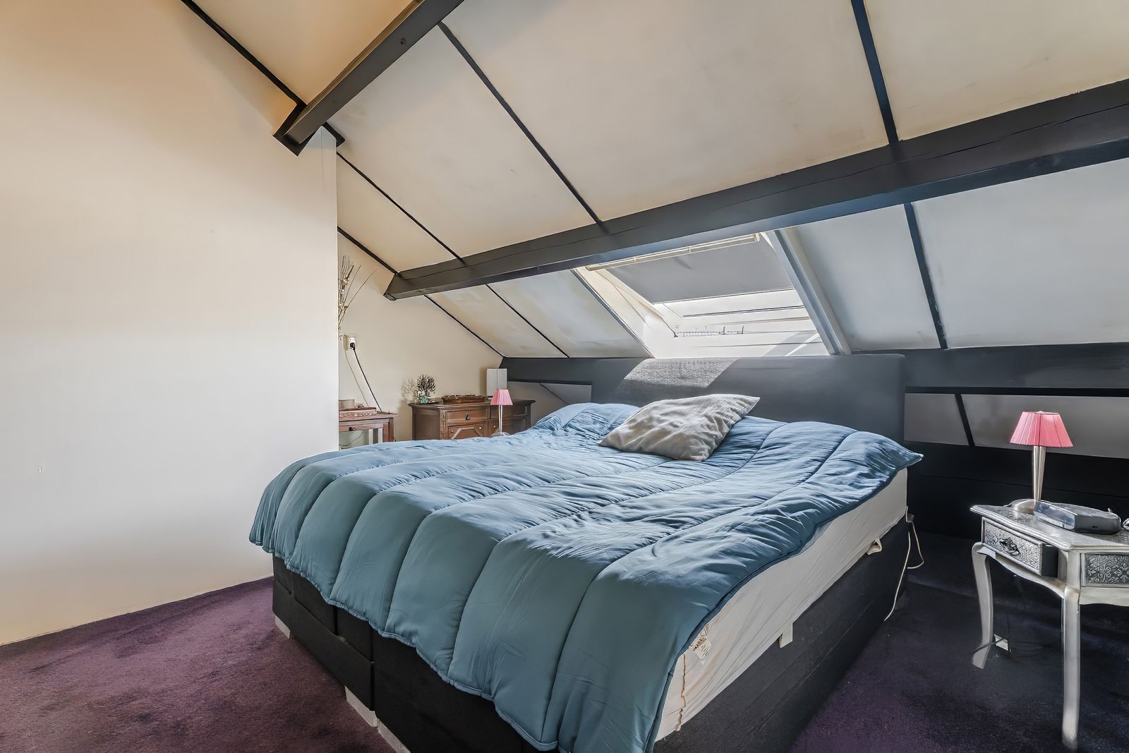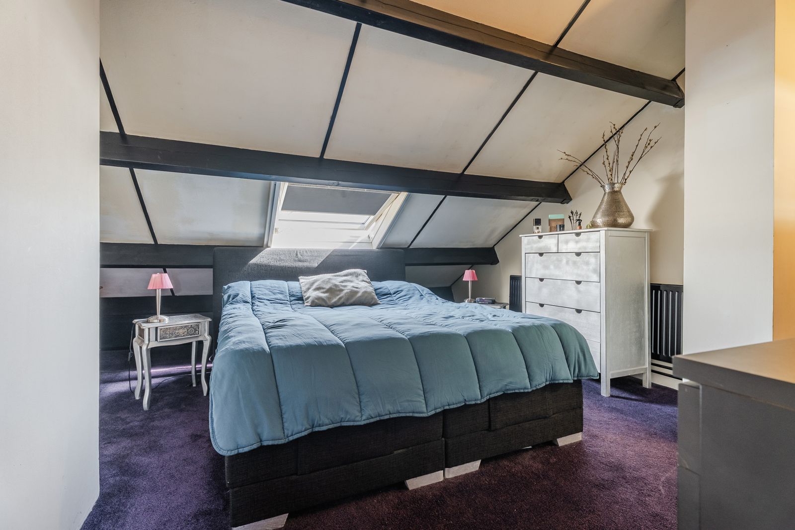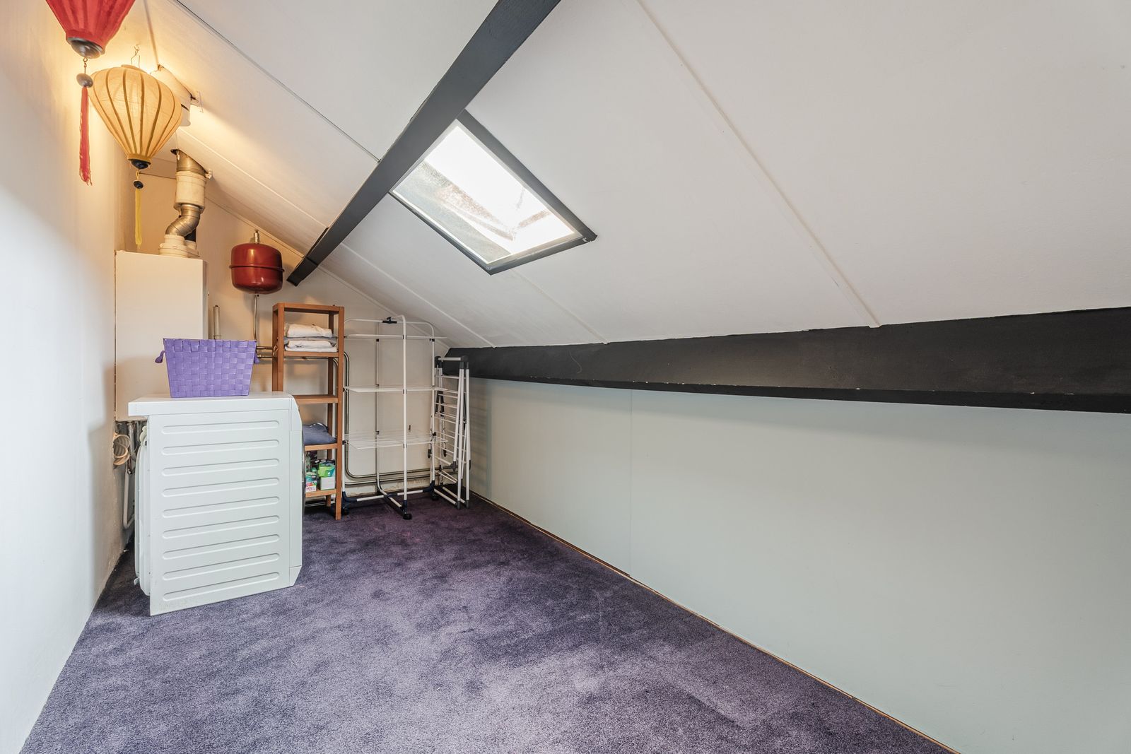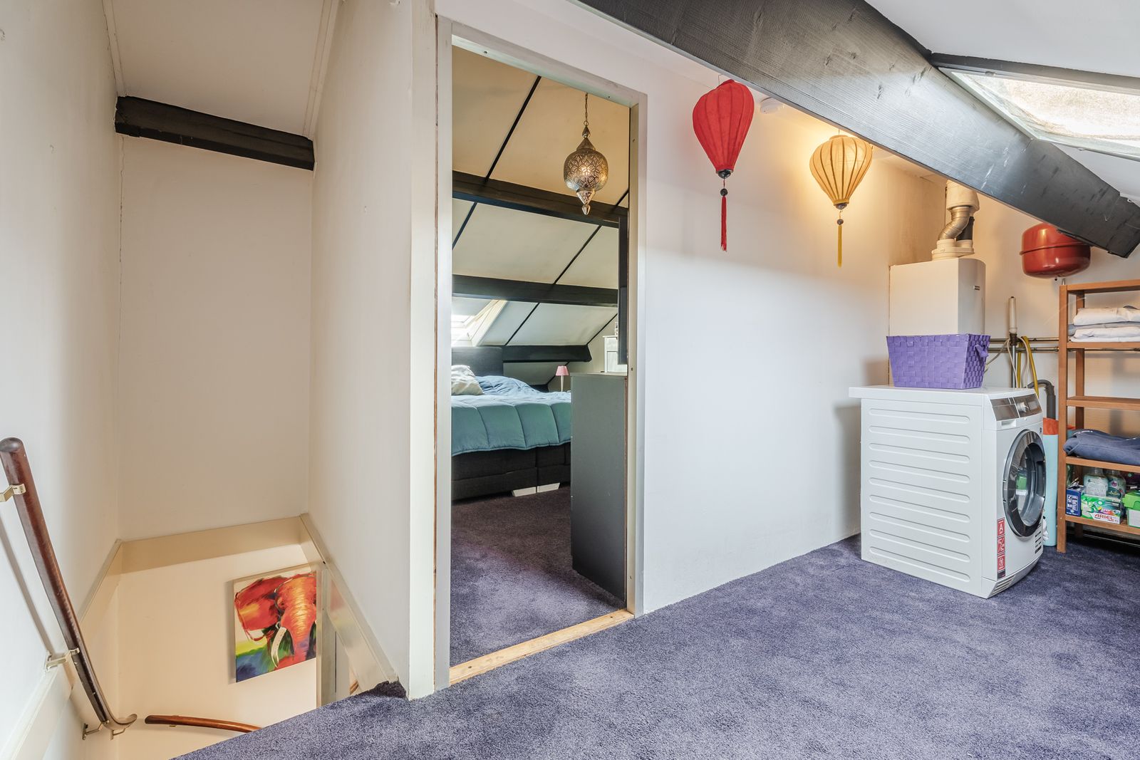 Via de vaste trap bereik je de zolderverdieping, waar twee dakramen voor een fijne lichtinval zorgen. Op de overloop vind je de CV-combiketel en een praktische ruimte voor je wasmachine en droger. Vanuit hier stap je de royale, lichte slaapkamer van ca.12m² binnen.