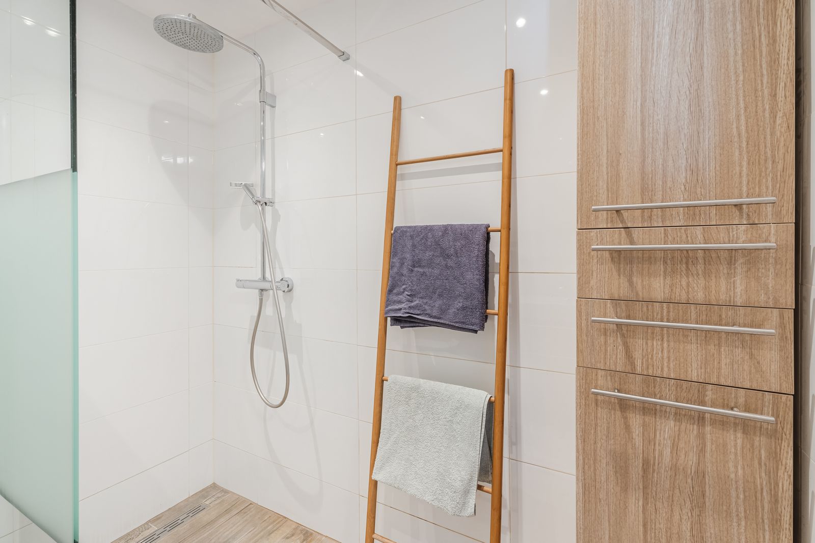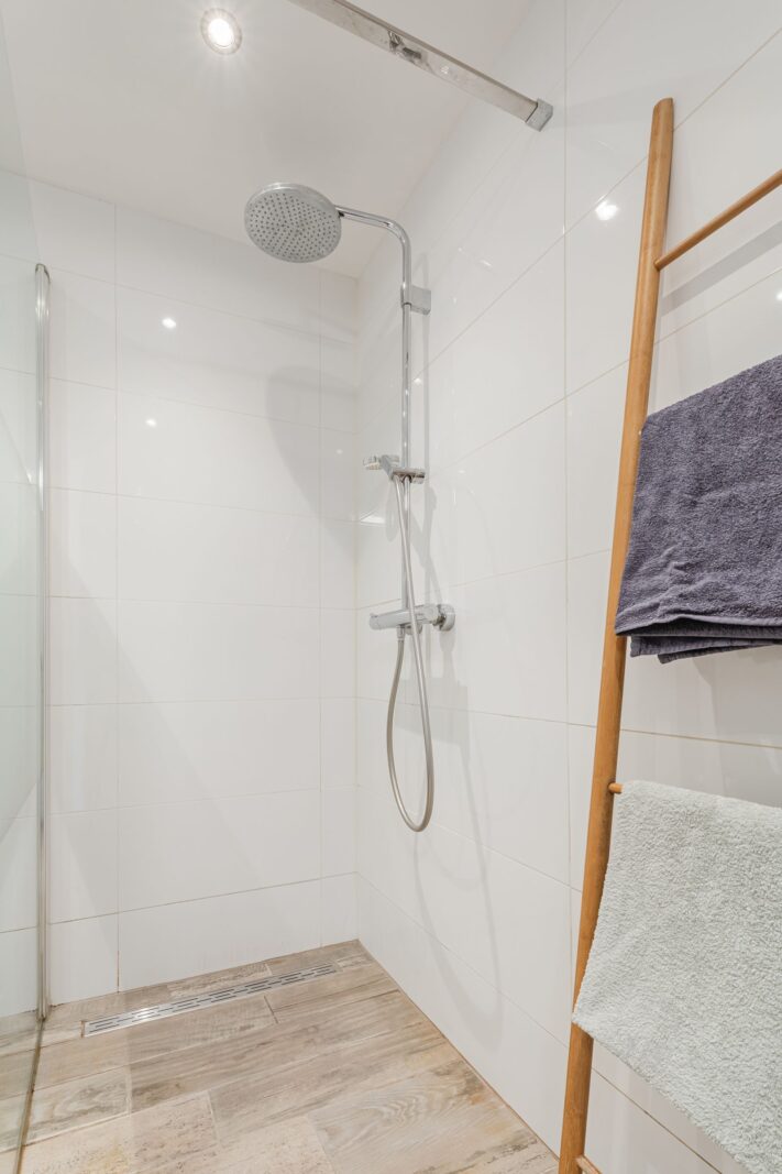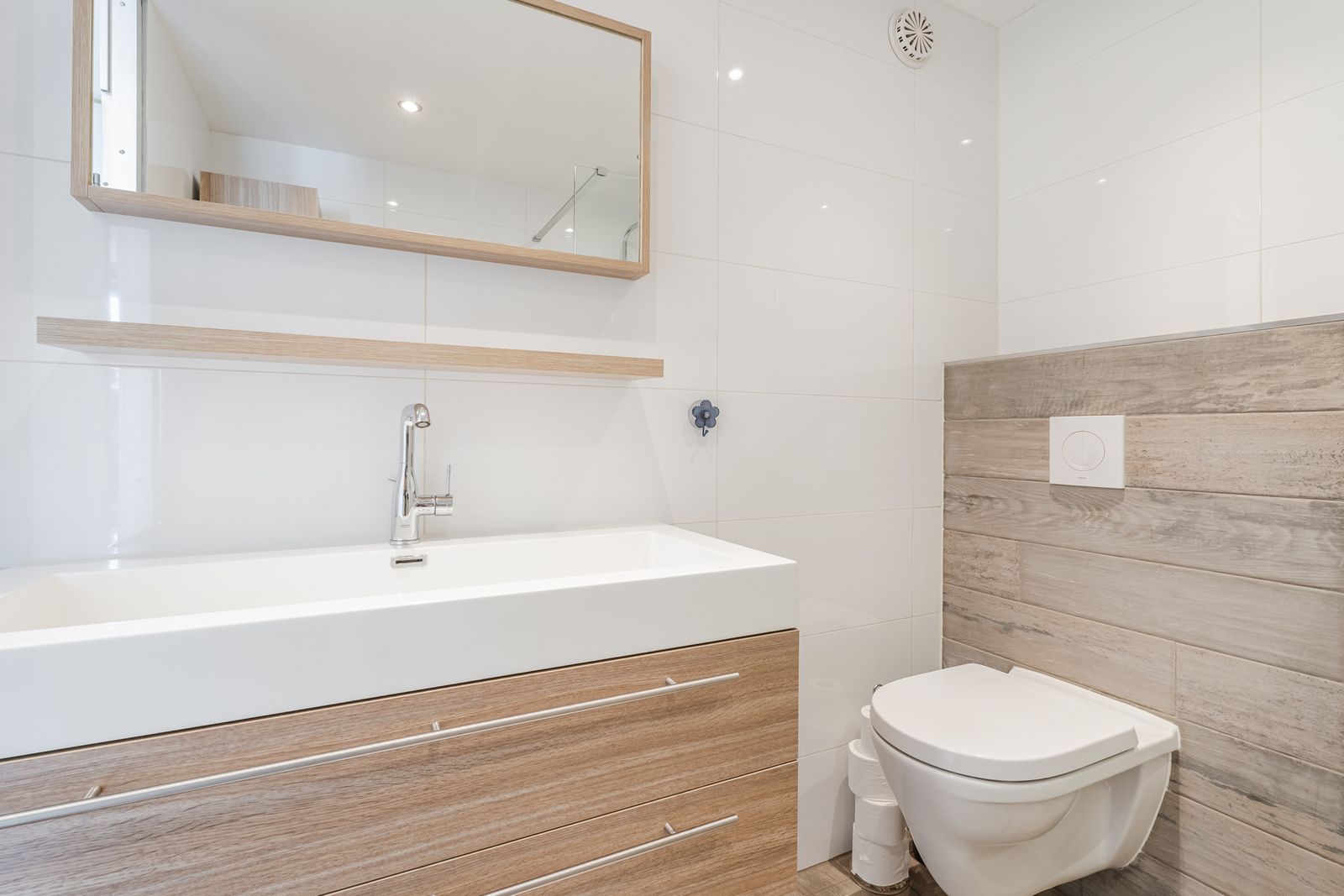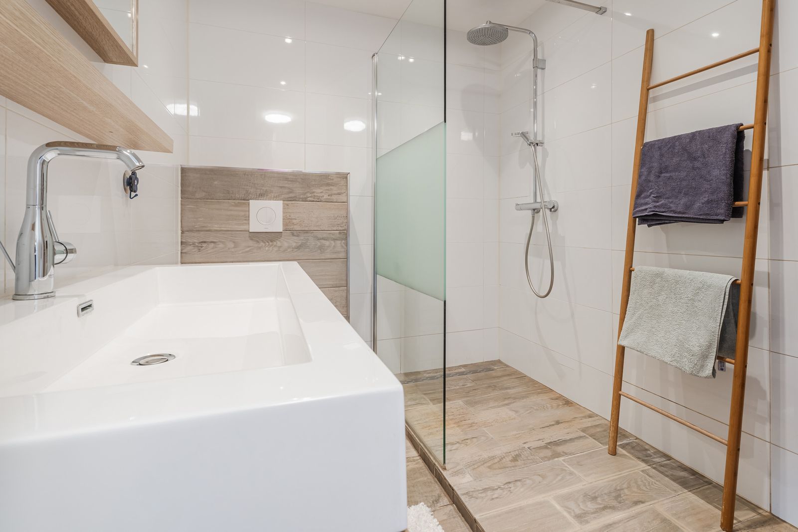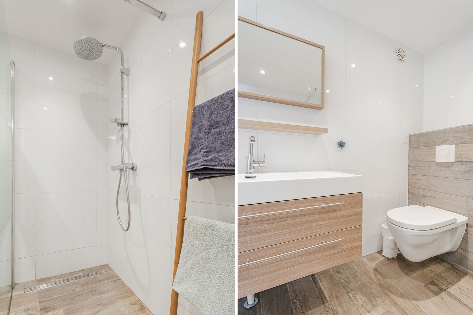 De moderne badkamer is volledig betegeld en uitgerust met een ruime inloopdouche, een brede wastafel met bijpassend meubel en een tweede (zwevend) toilet.