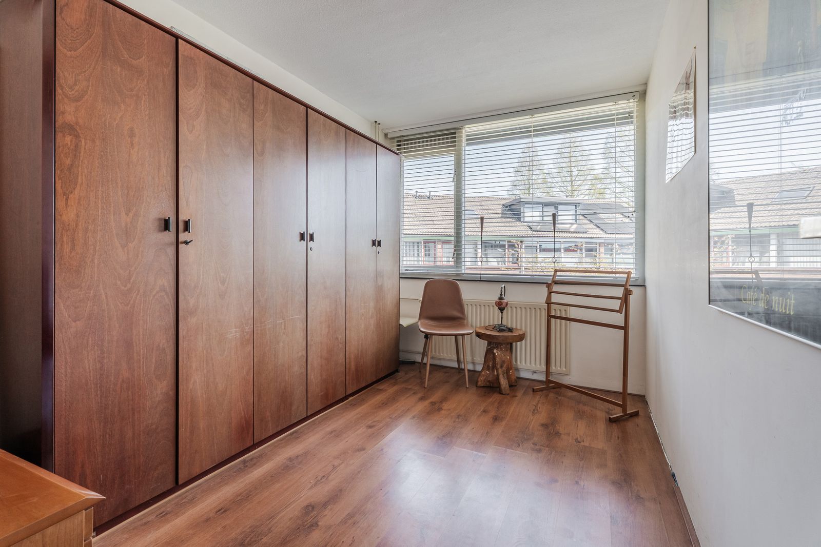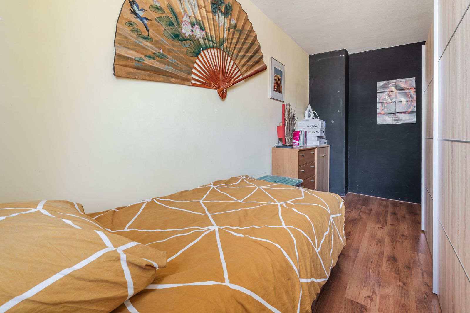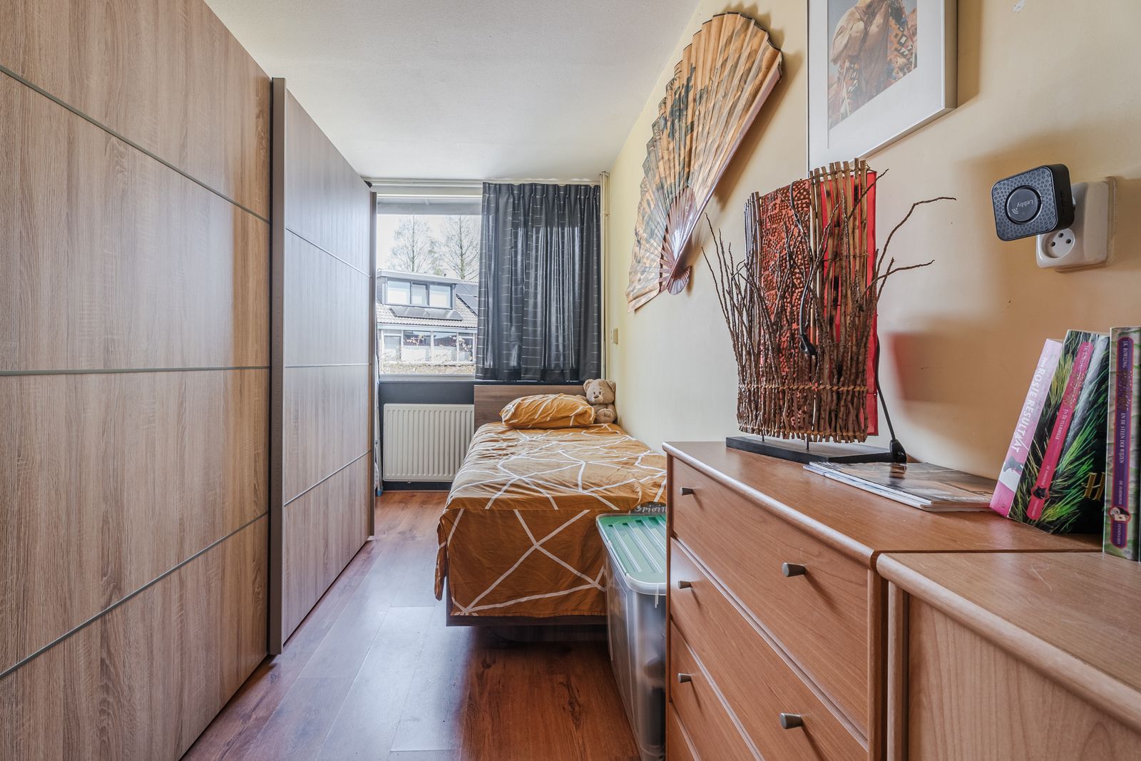 Deze vierde slaapkamer voelt verrassend ruim aan, biedt volop bergruimte en beschikt over een eigen wastafel.