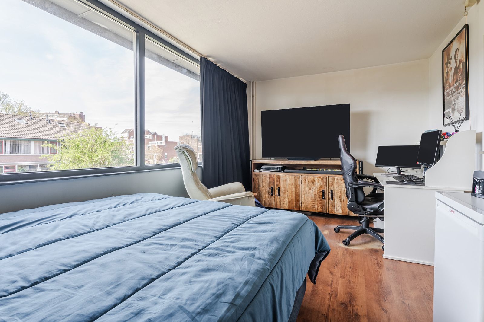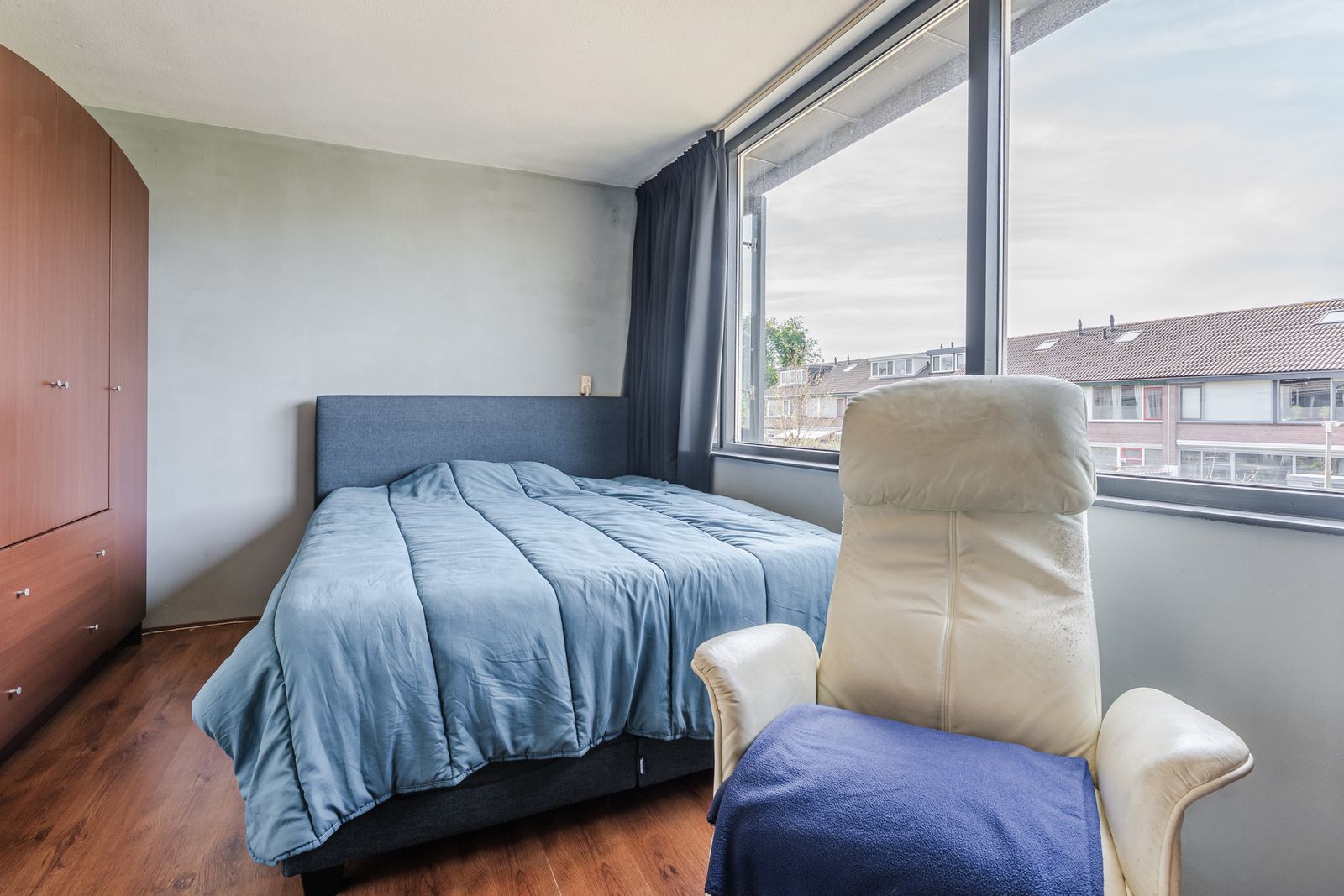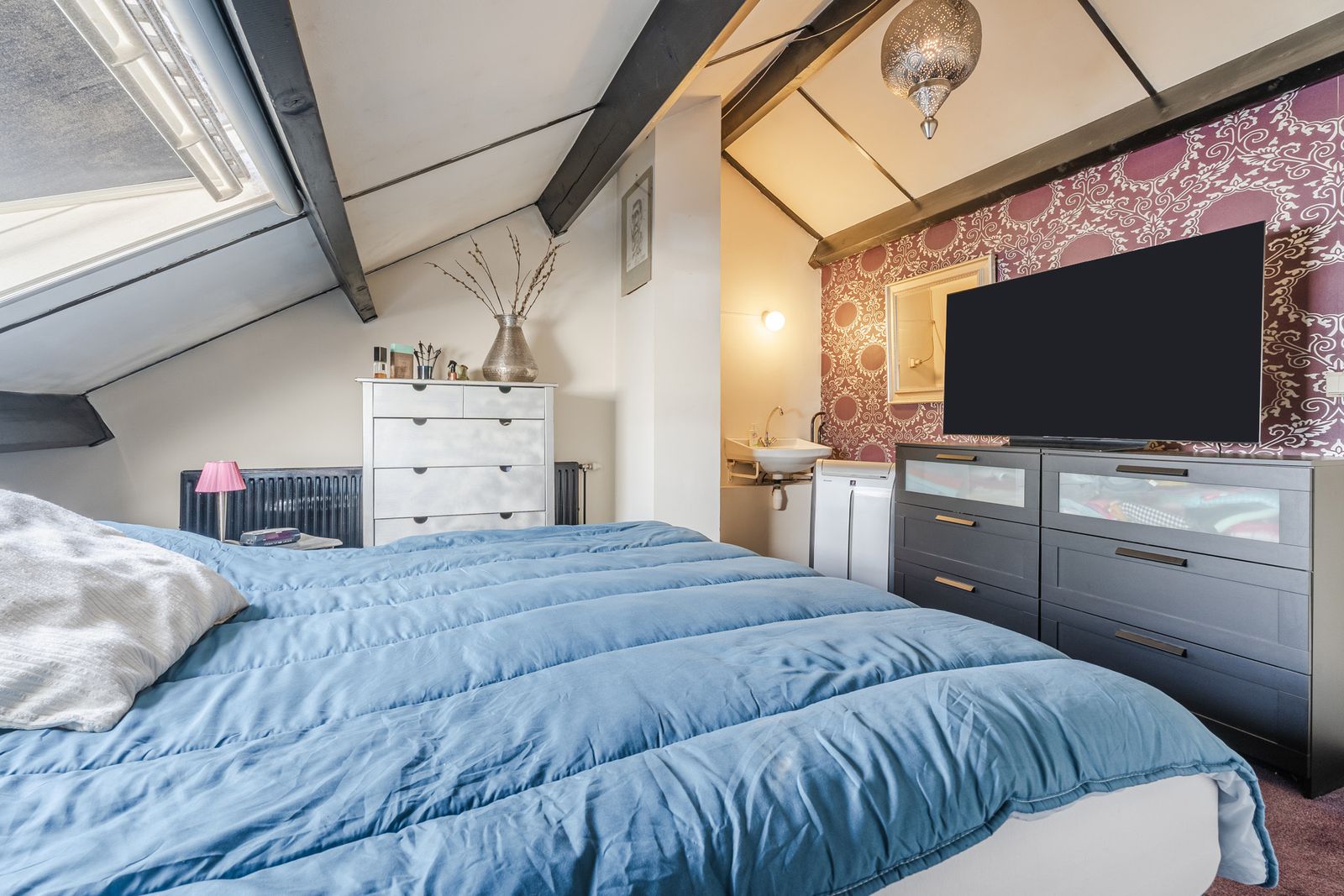 Deze vierde slaapkamer voelt verrassend ruim aan, biedt volop bergruimte en beschikt over een eigen wastafel.