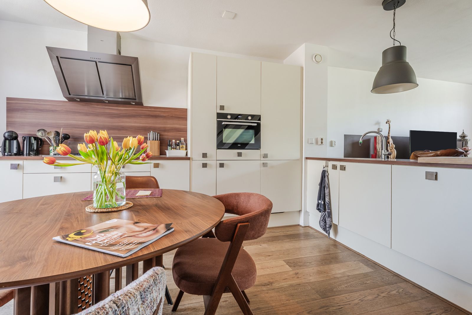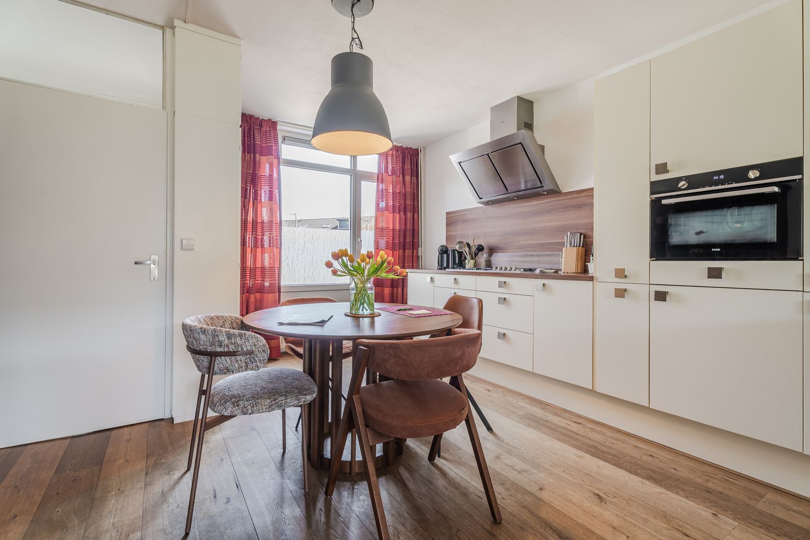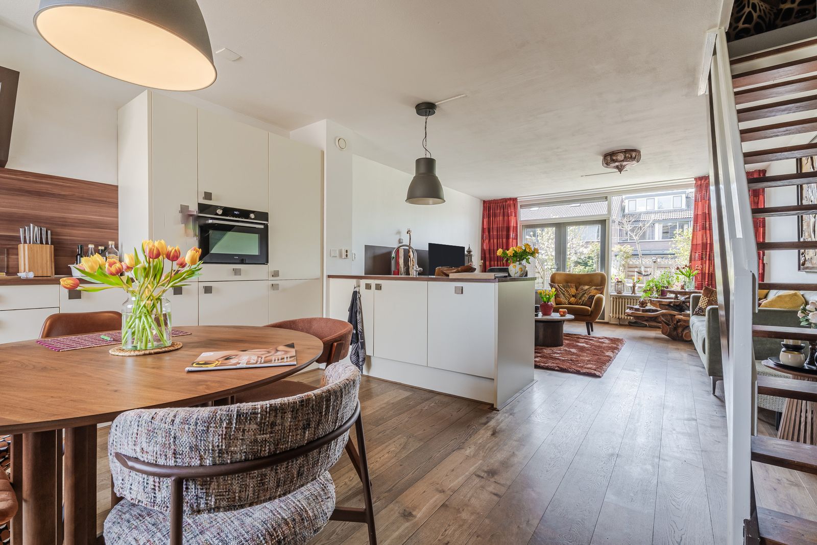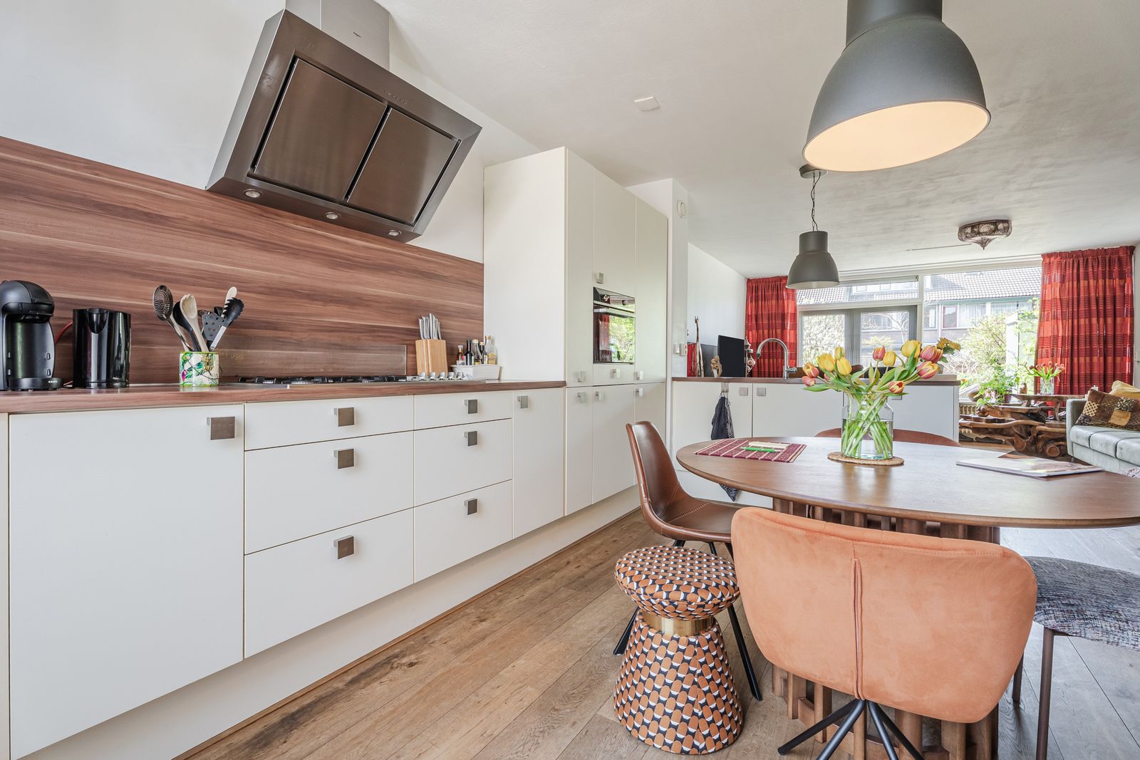 Het zitgedeelte ligt aan de achterzijde en kijkt fijn uit op de tuin. Aan de voorzijde bevindt zich de royale woonkeuken in L-opstelling, uitgerust met een 4-pits gasfornuis met wokbrander, afzuigkap, combi-oven, vaatwasser en een koel-vriescombinatie. Daarbij is er volop kastruimte én een handige inbouwkast voor extra opberggemak.