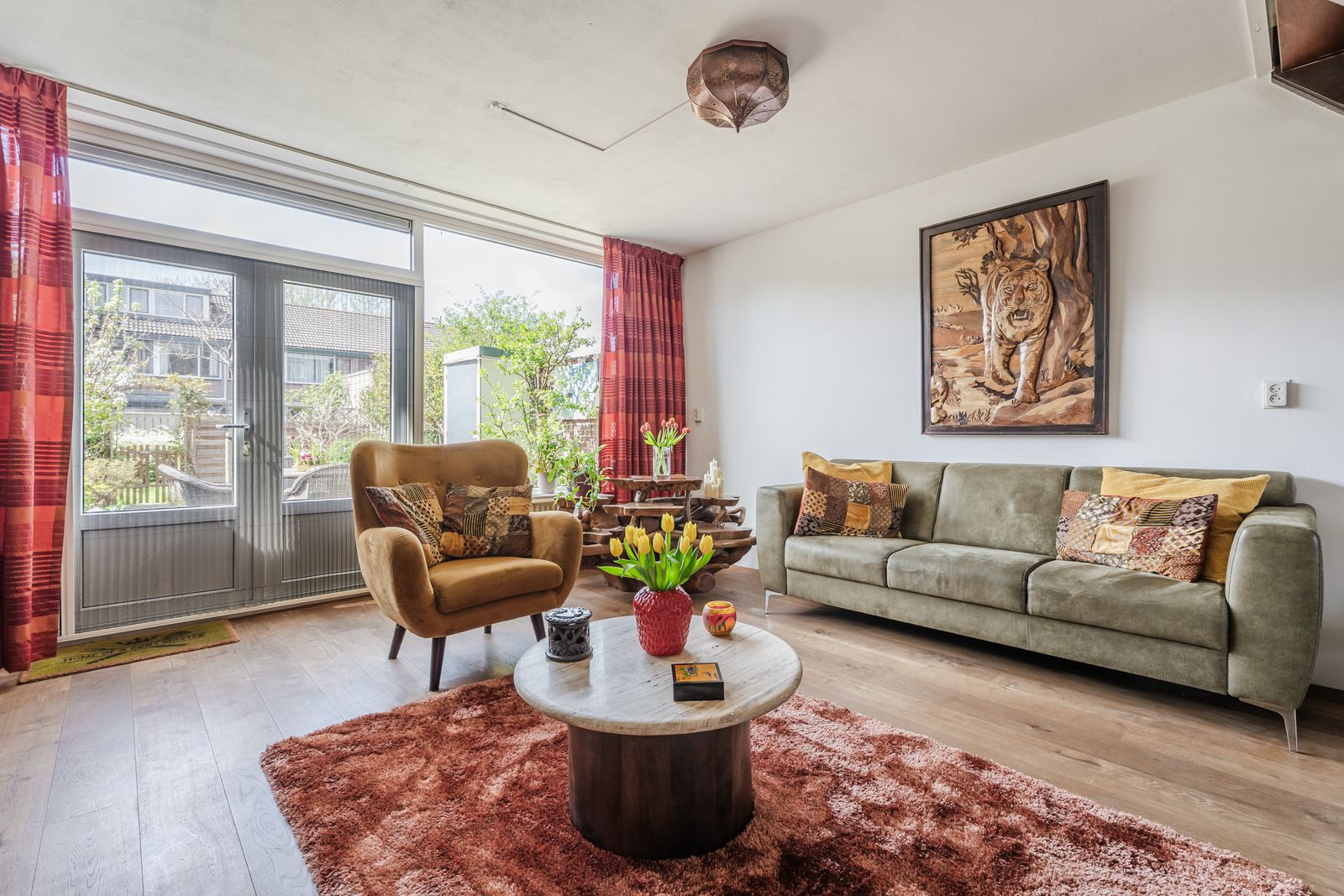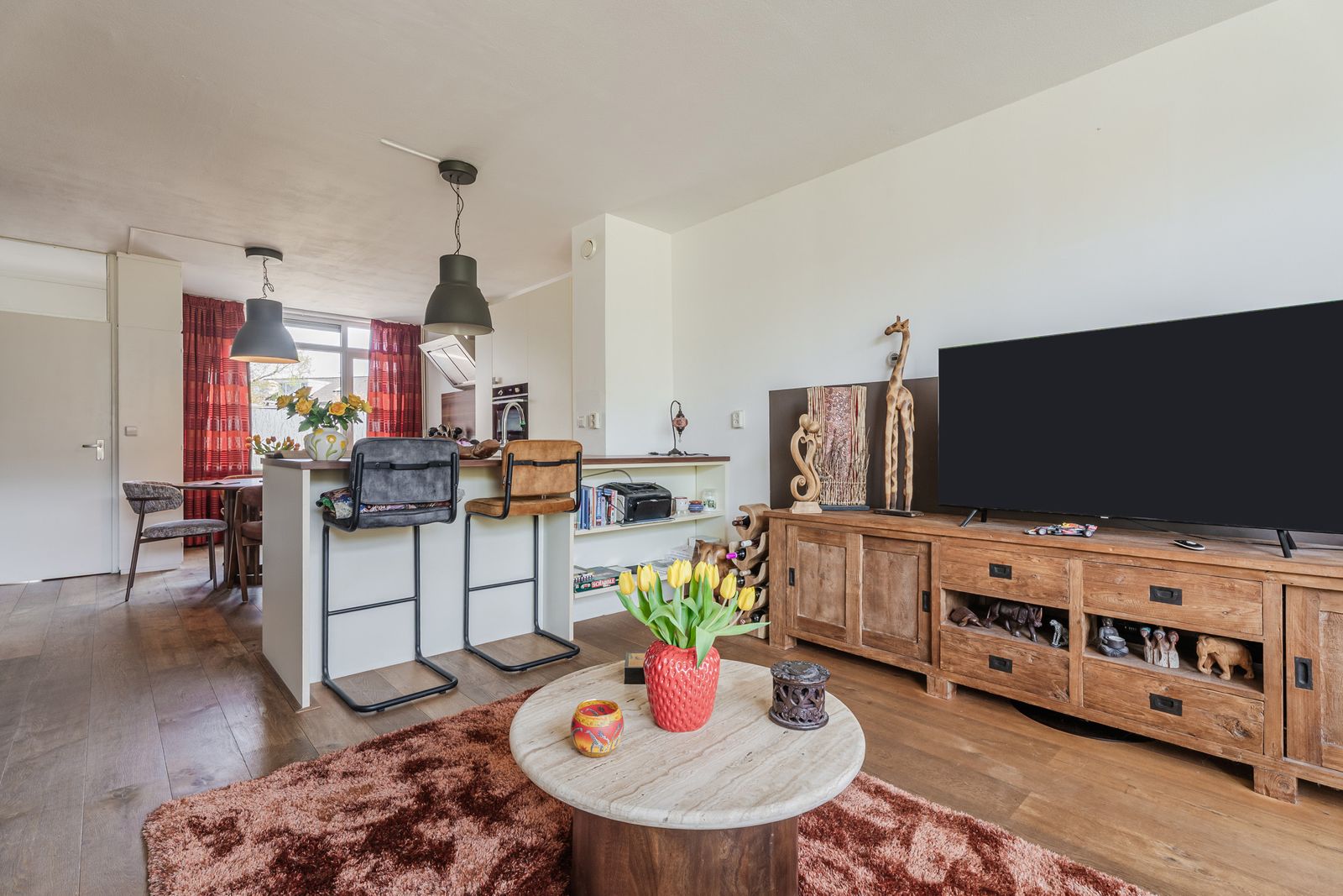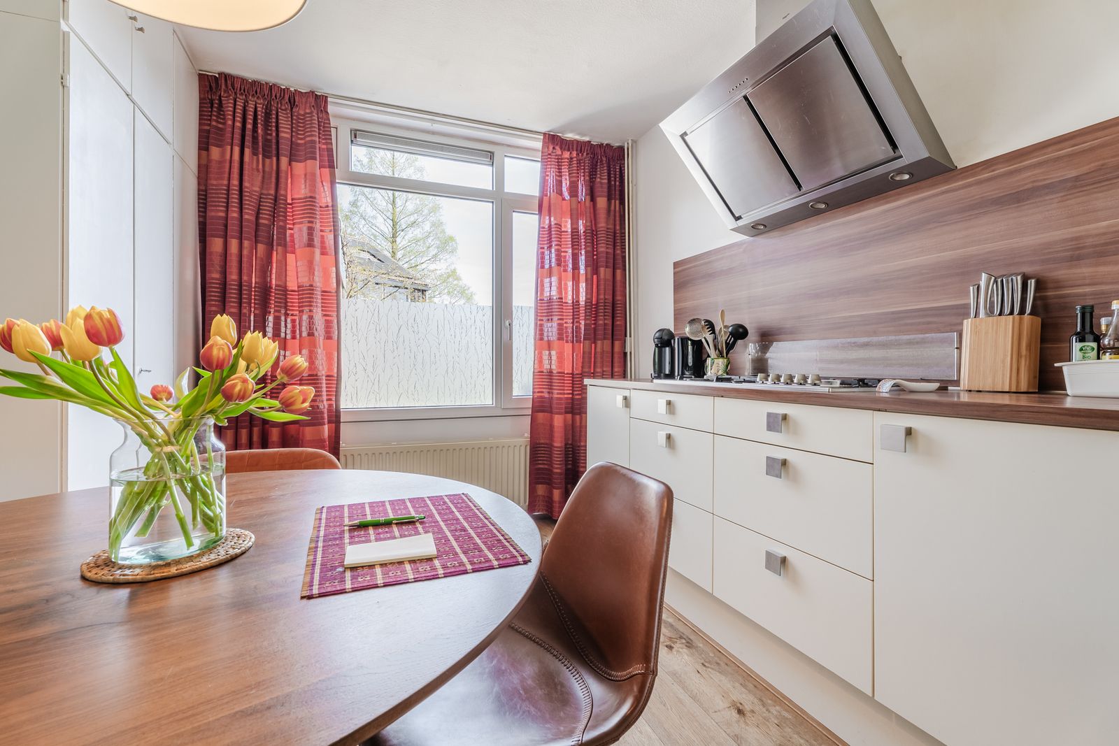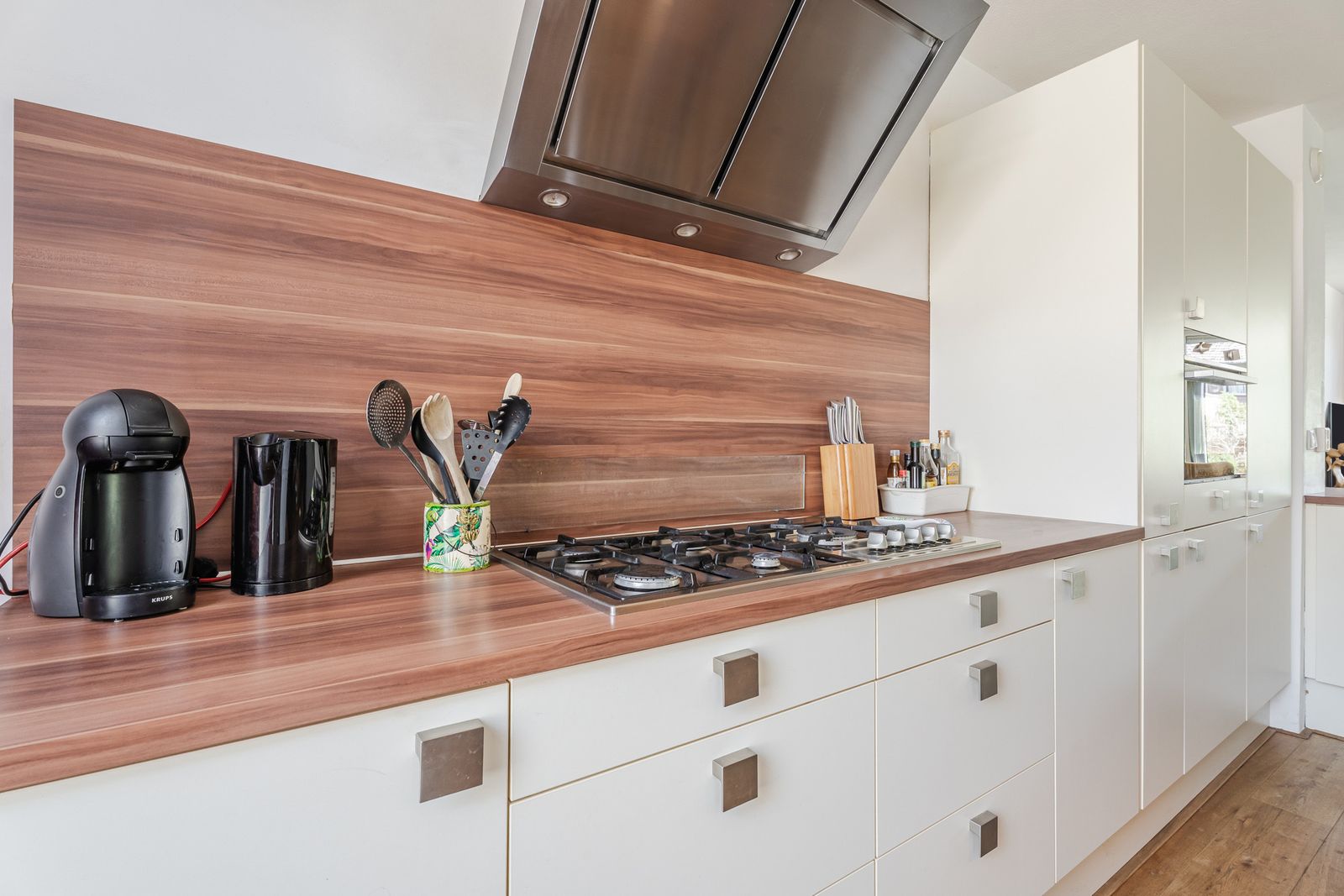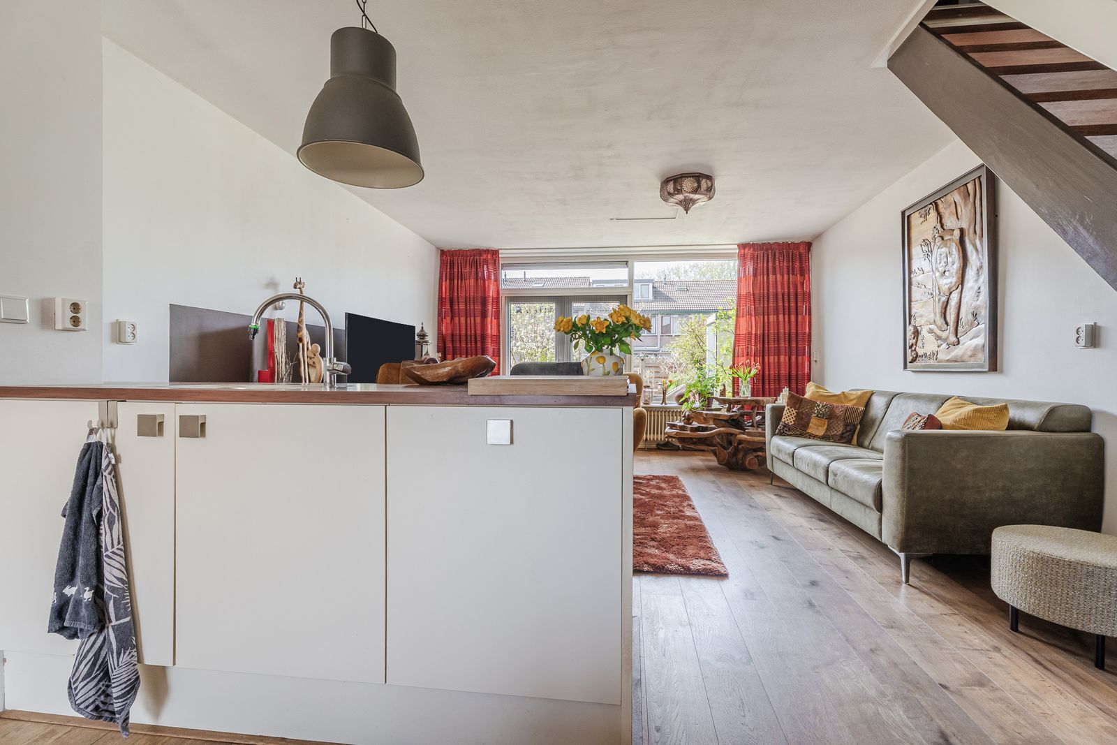 Het zitgedeelte ligt aan de achterzijde en kijkt fijn uit op de tuin. Aan de voorzijde bevindt zich de royale woonkeuken in L-opstelling, uitgerust met een 4-pits gasfornuis met wokbrander, afzuigkap, combi-oven, vaatwasser en een koel-vriescombinatie. Daarbij is er volop kastruimte én een handige inbouwkast voor extra opberggemak.