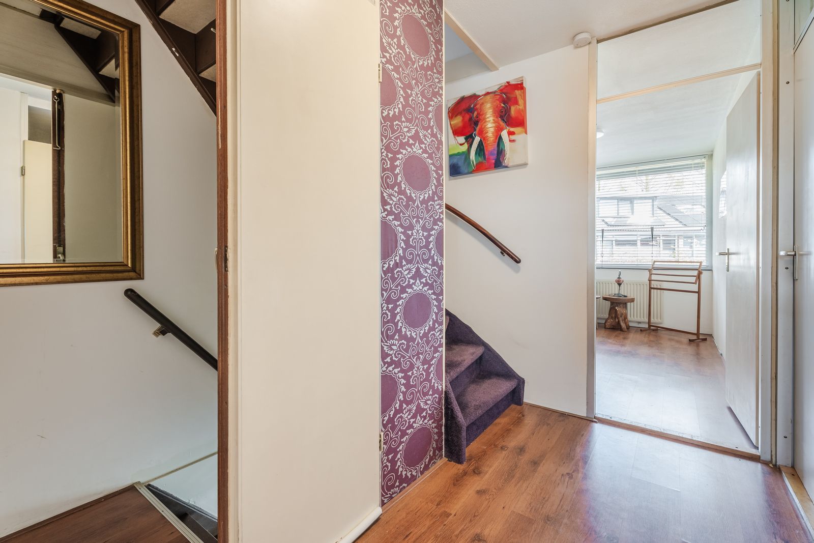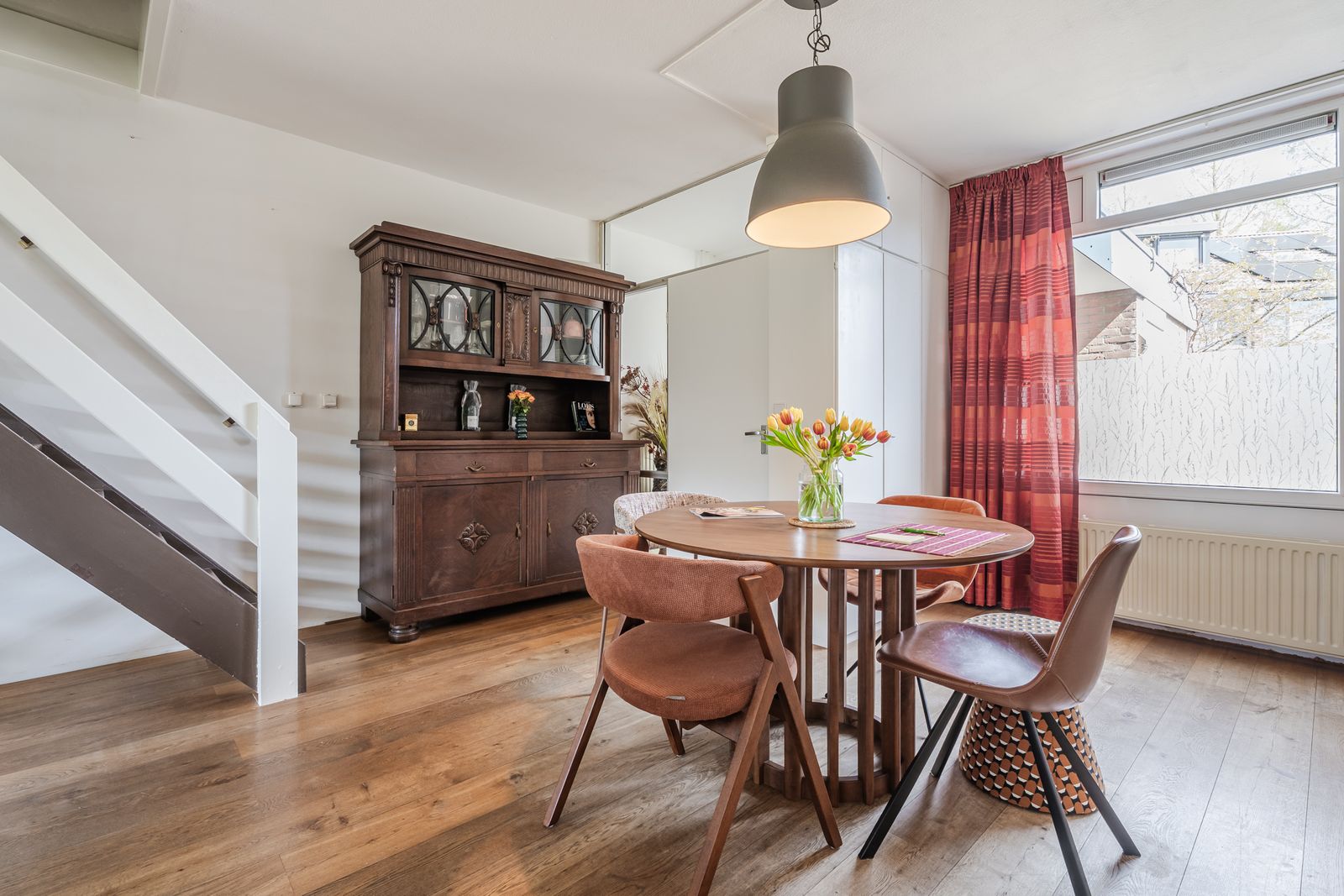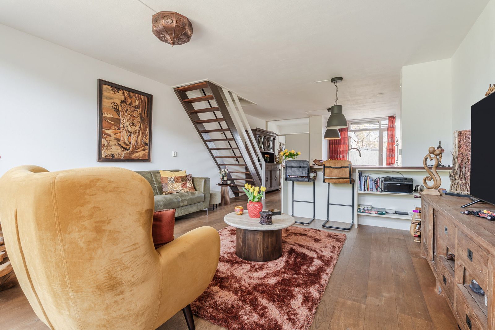 De begane grond is afgewerkt met een mooie houten vloer en vanuit de woonkamer bereik je via de trap de eerste verdieping.
