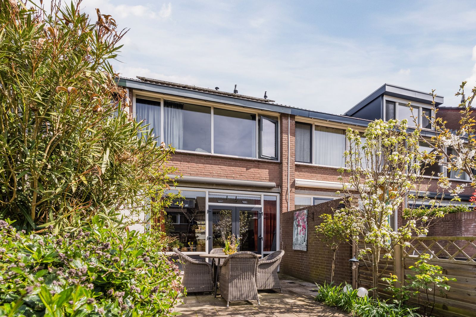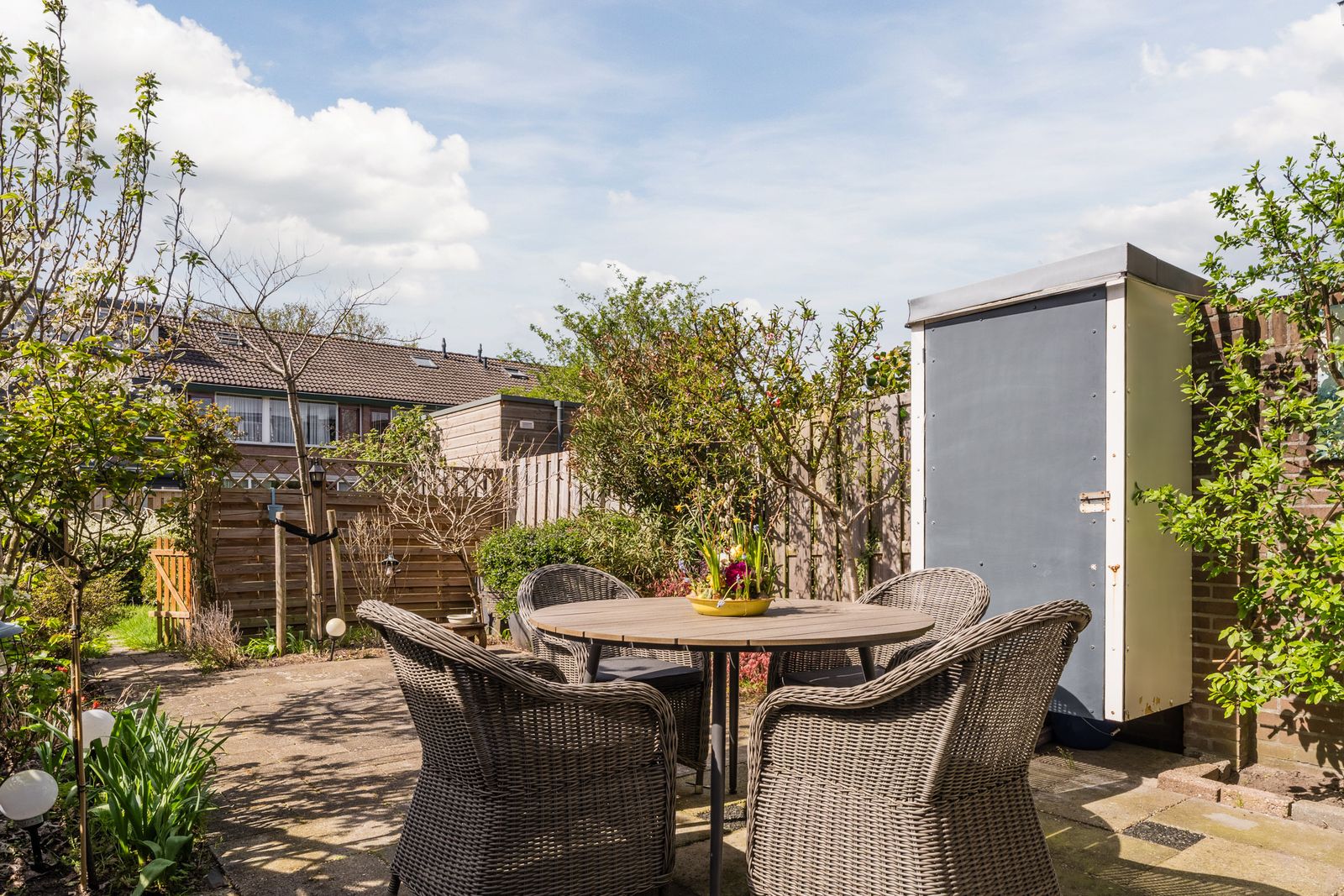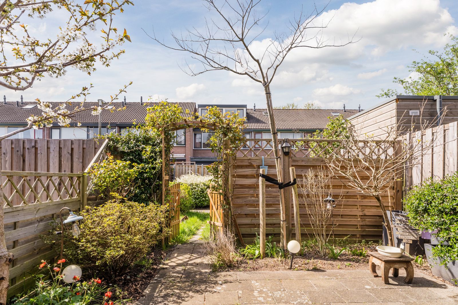 Dankzij de mooie beplanting en fruitbomen, elektra en de praktische achterom is de tuin niet alleen sfeervol, maar ook heel functioneel.