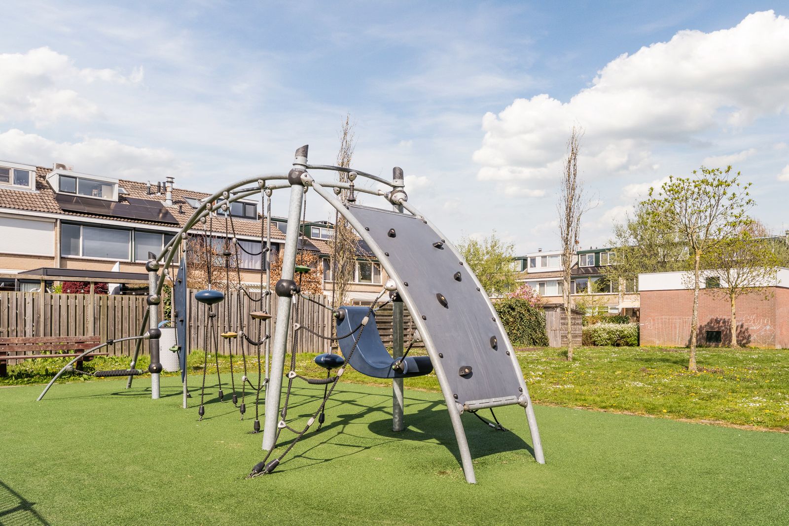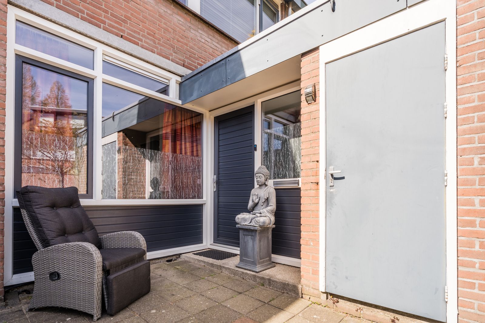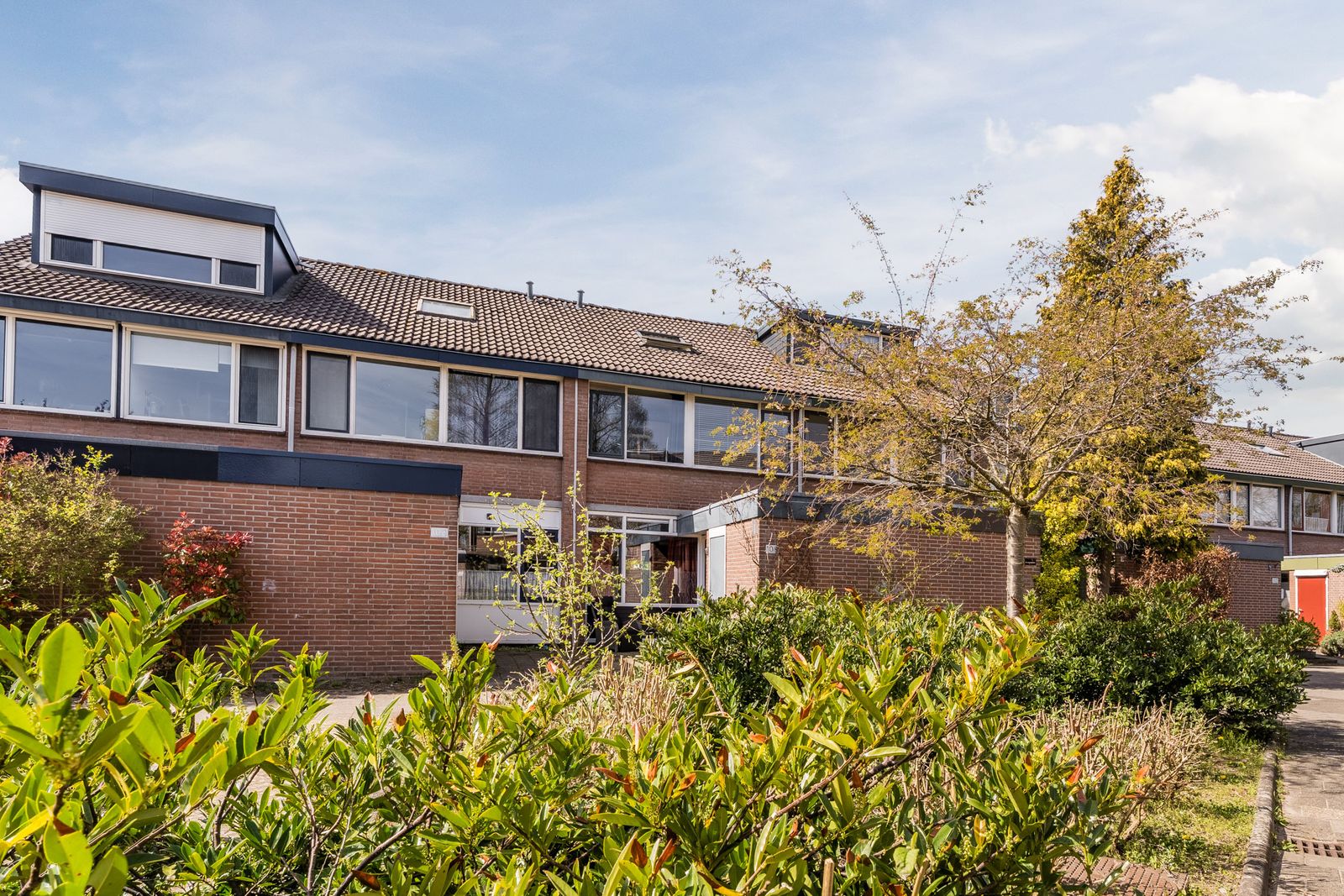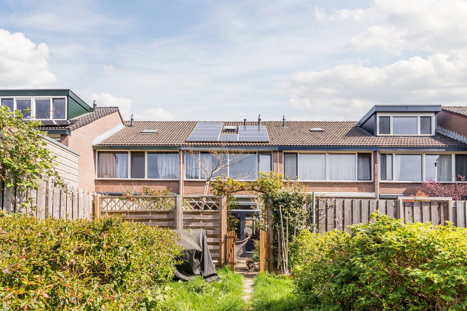 De kleine vrijstaande houten berging en het elektrisch bedienbare zonnescherm over de breedte van de woning maken het geheel compleet en zorgen voor optimaal comfort.