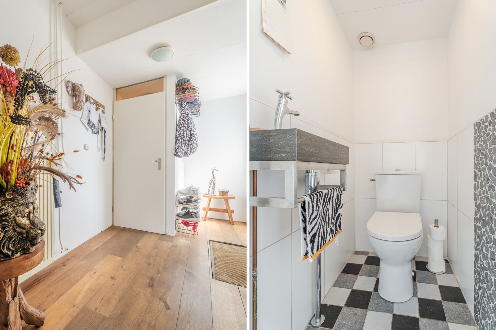 Via de verzorgde voortuin, met een praktische stenen berging van ca.5m², stap je binnen in een ruime hal. Hier vind je het toilet met staand closet en fonteintje, de meterkast en de toegang tot de woonkamer.