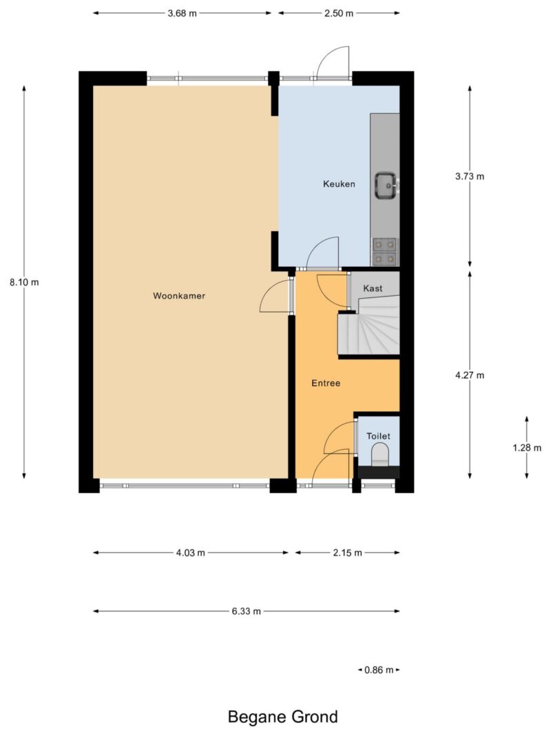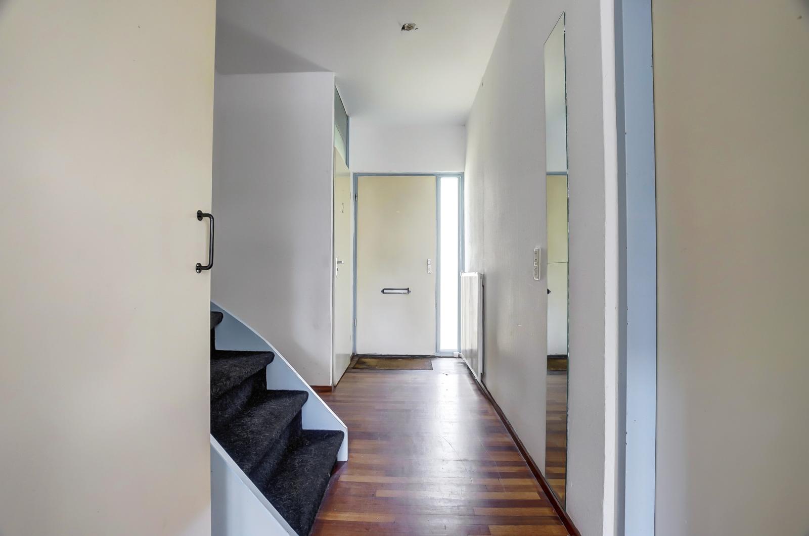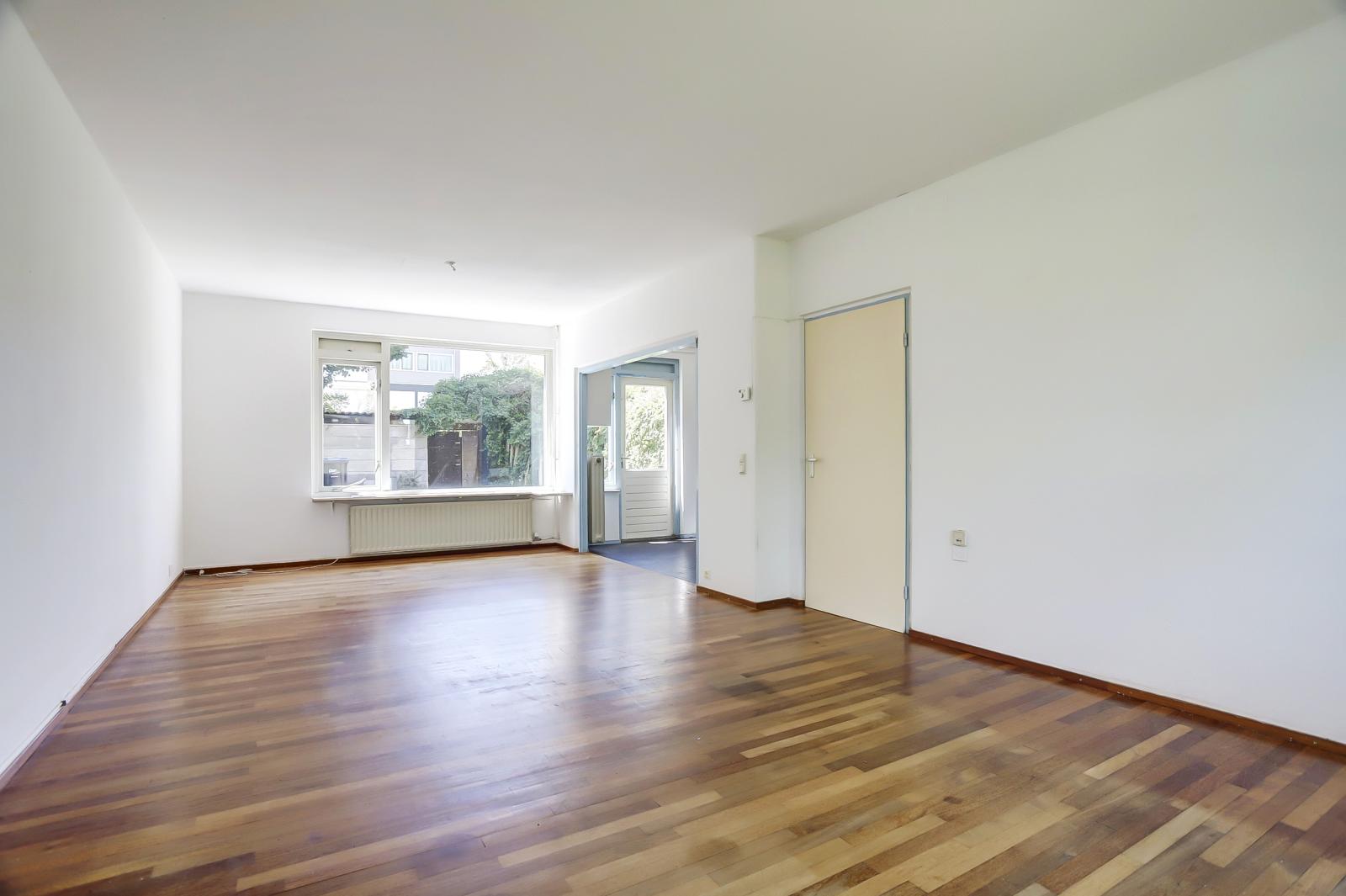 Begane grond Je komt binnen via de entree/hal met toegang tot het toilet en de lichte, open woonkamer met open keuken. De keuken is aan de achterzijde geplaatst en biedt veel lichtinval. De keuken geeft toegang tot de tuin De woonkamer is prettig ruim van opzet en heeft vrij uitzicht aan de voorkant.