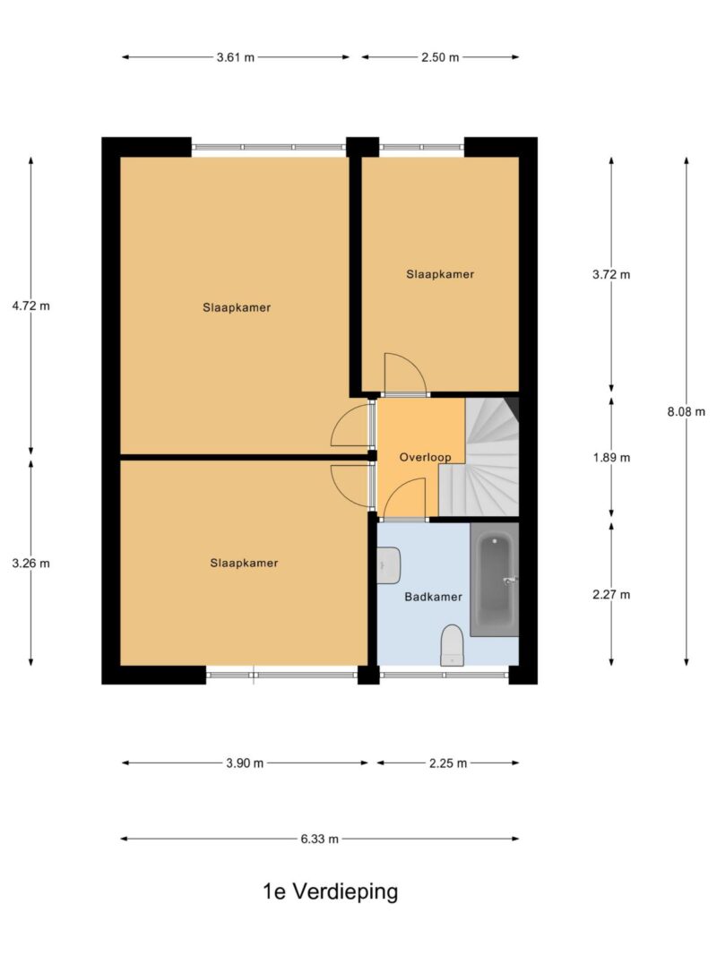 Eerste verdieping Op de eerste verdieping bevinden zich drie slaapkamers van goed formaat. De badkamer is voorzien van een ligbad, tweede toilet en wastafel.