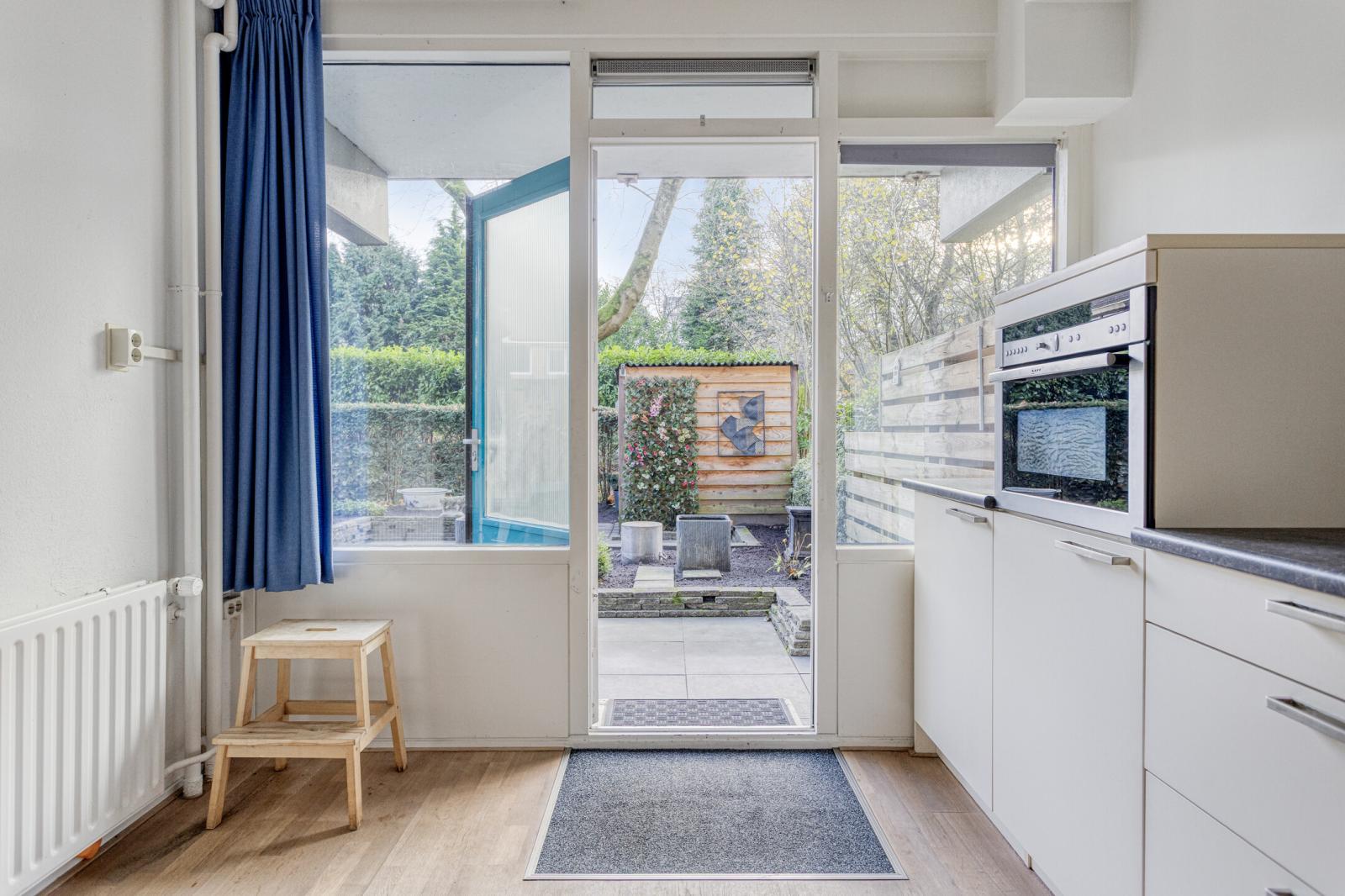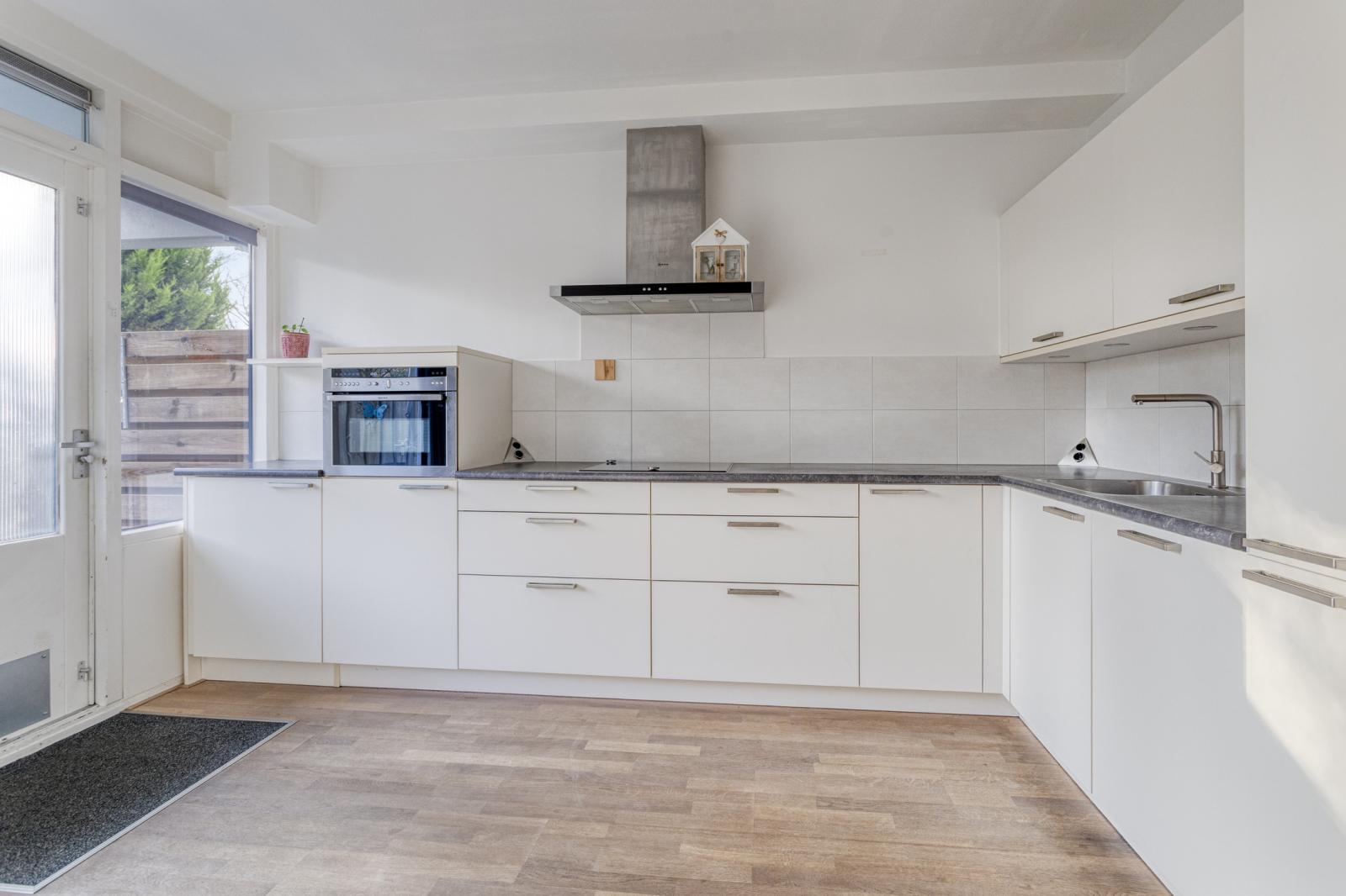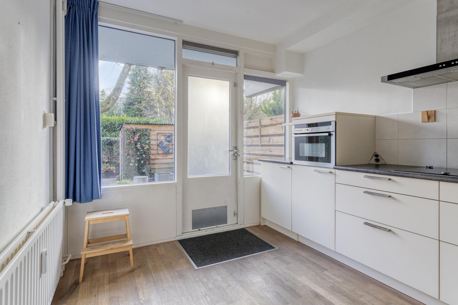 De keuken bevindt zich ook aan de tuinzijde en biedt voldoende werk- en opbergruimte, met mogelijkheid tot modernisering naar eigen smaak.