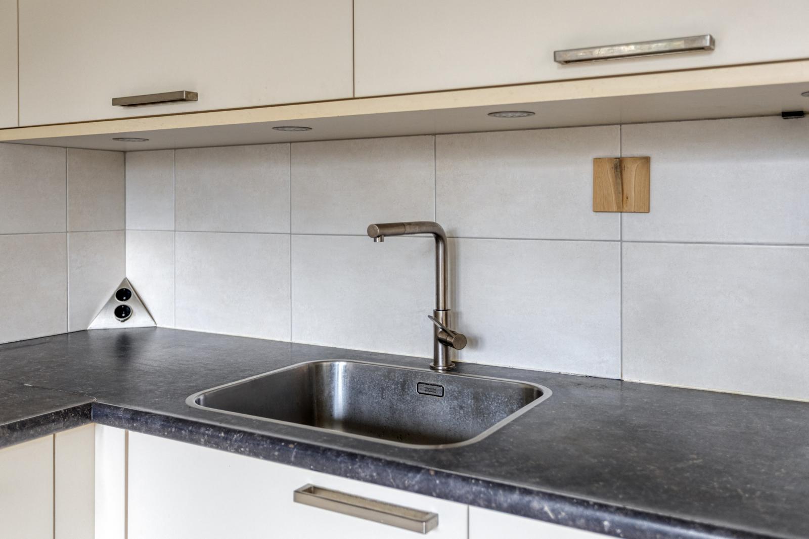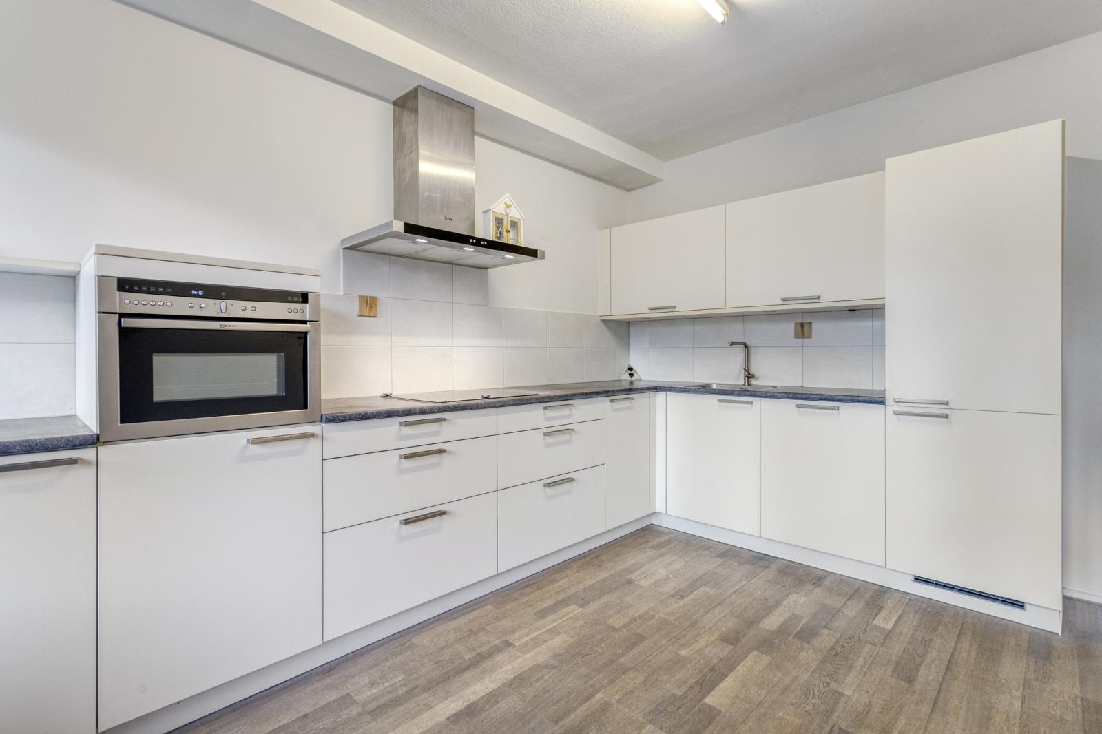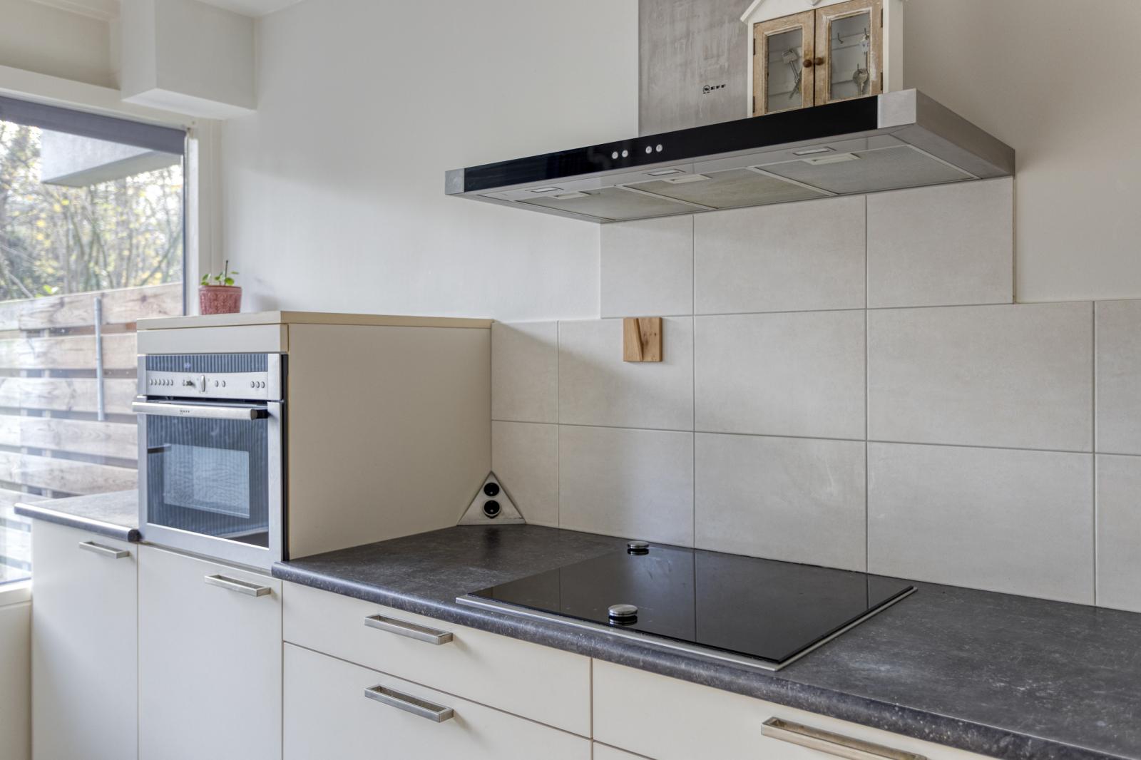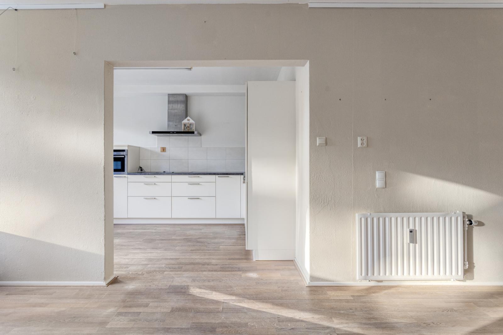 De keuken bevindt zich ook aan de tuinzijde en biedt voldoende werk- en opbergruimte, met mogelijkheid tot modernisering naar eigen smaak.
