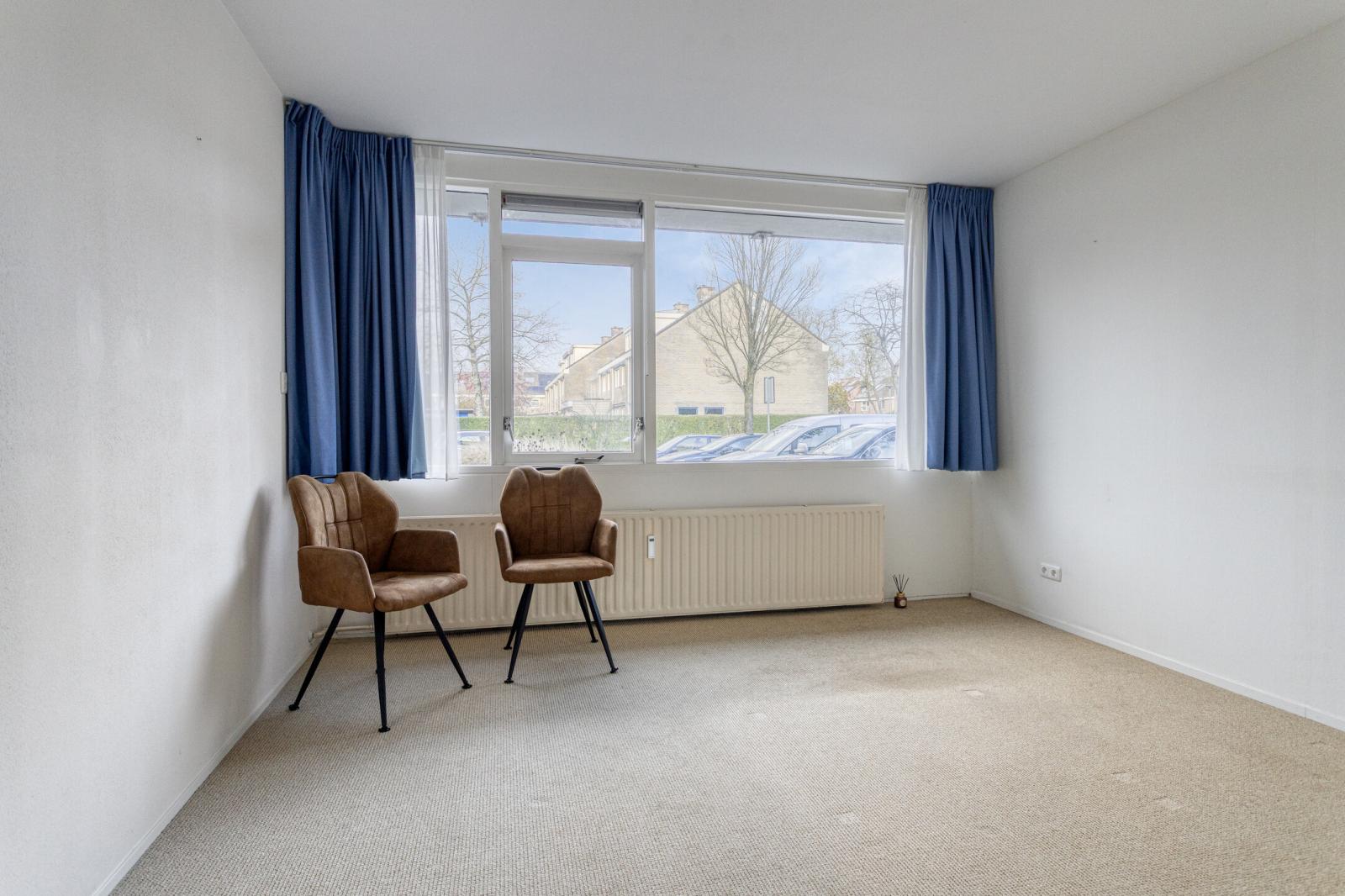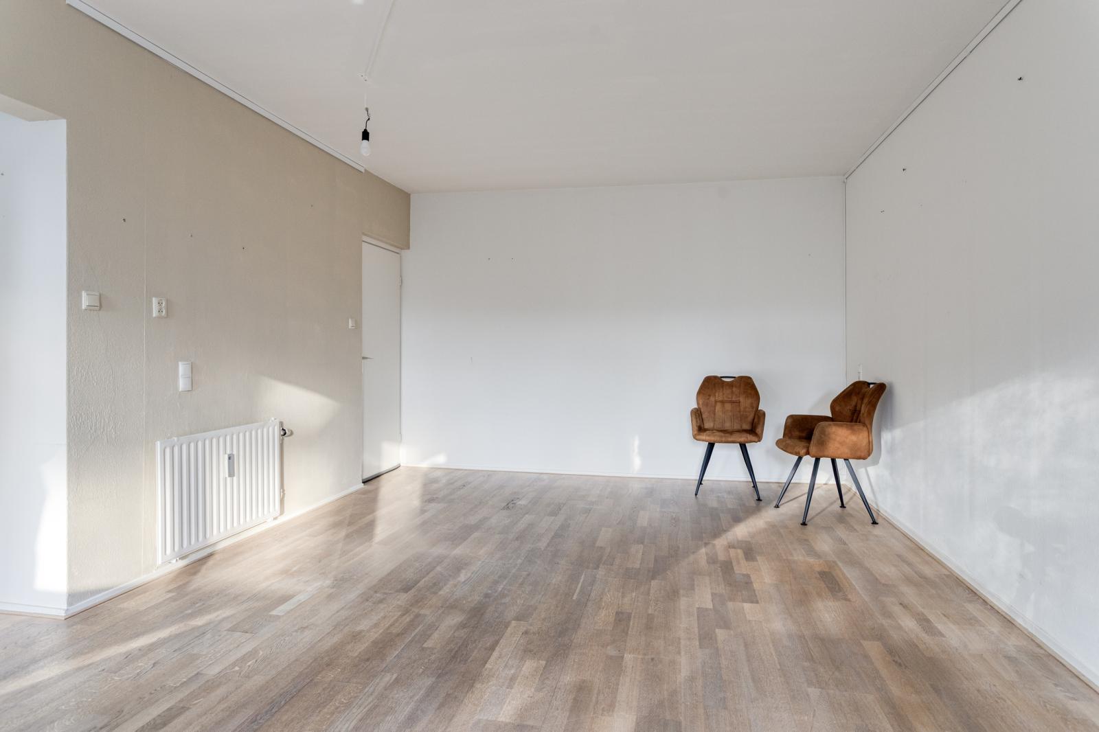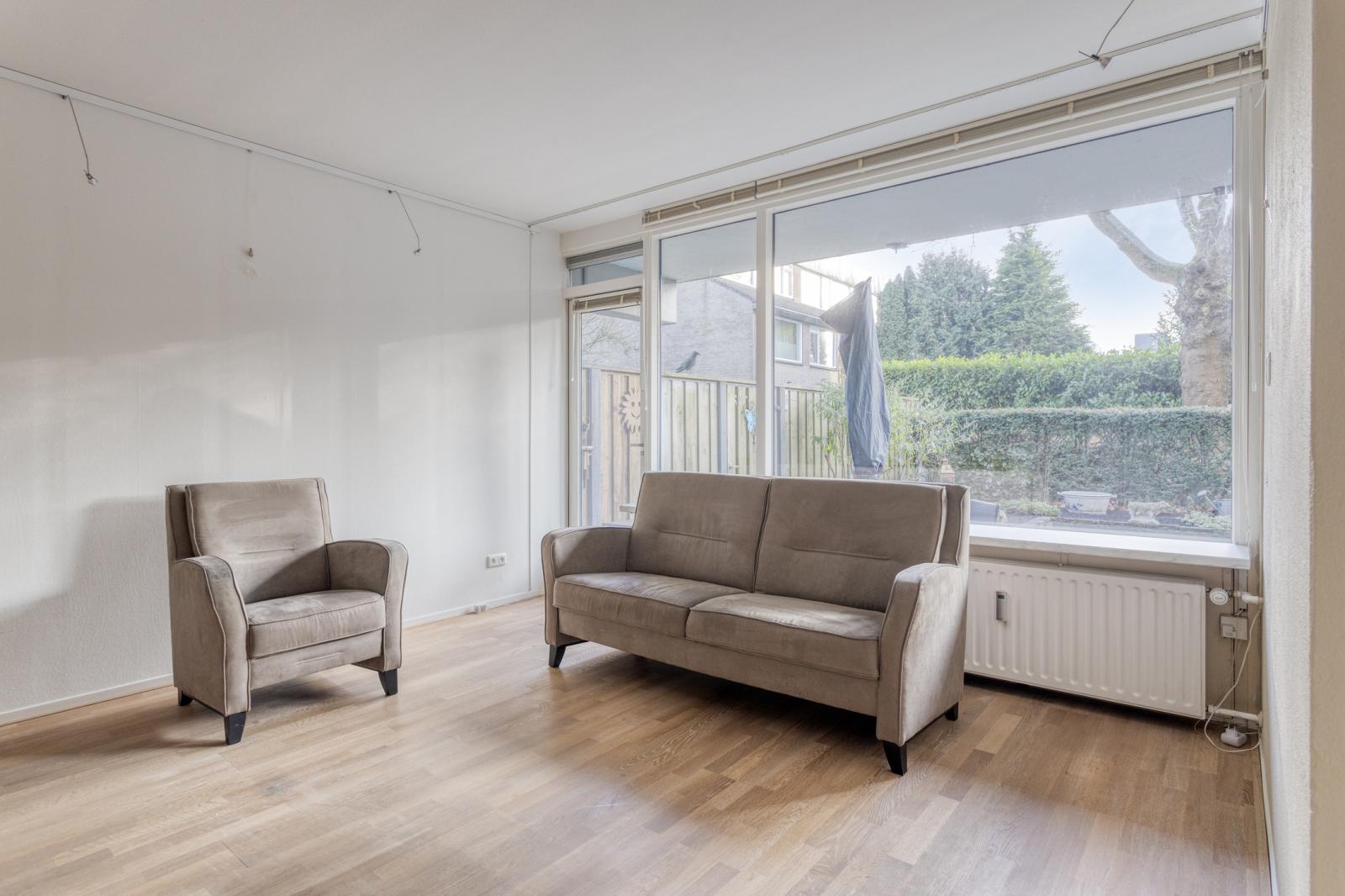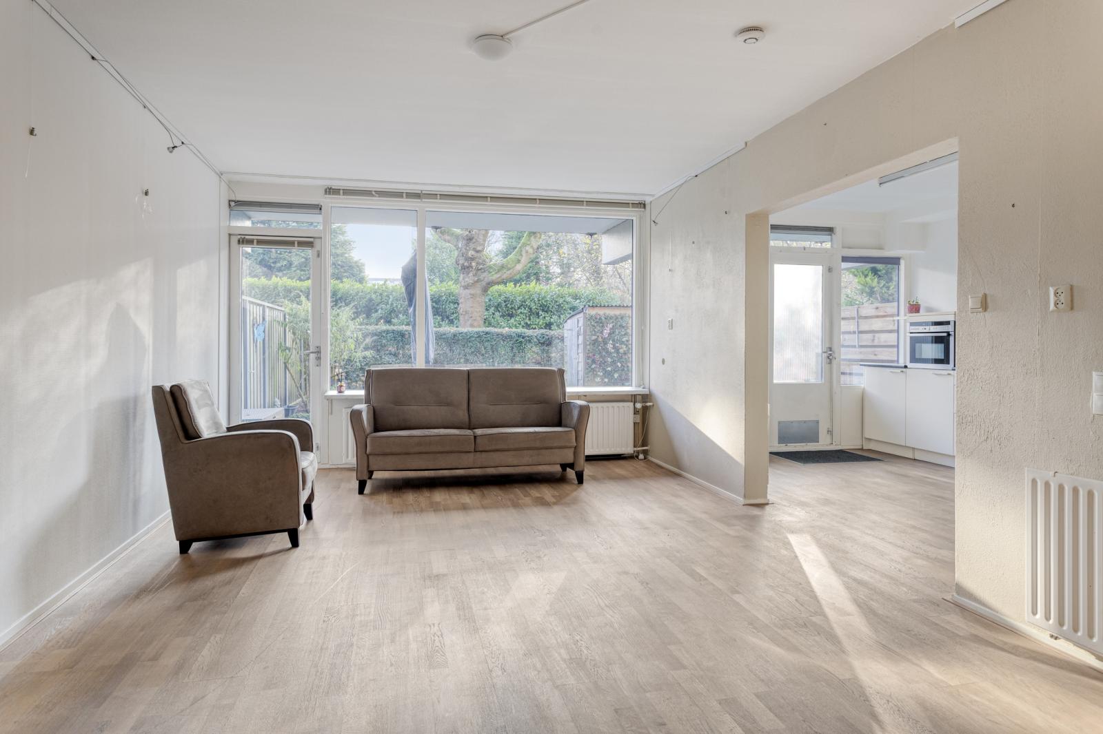 De lichte woonkamer bevindt zich aan de tuinzijde en biedt prettig uitzicht door de grote raampartijen. Vanuit de woonkamer loop je direct de eigen, deels beschutte tuin/terras op; een fijne plek om te ontspannen of om buiten te eten.