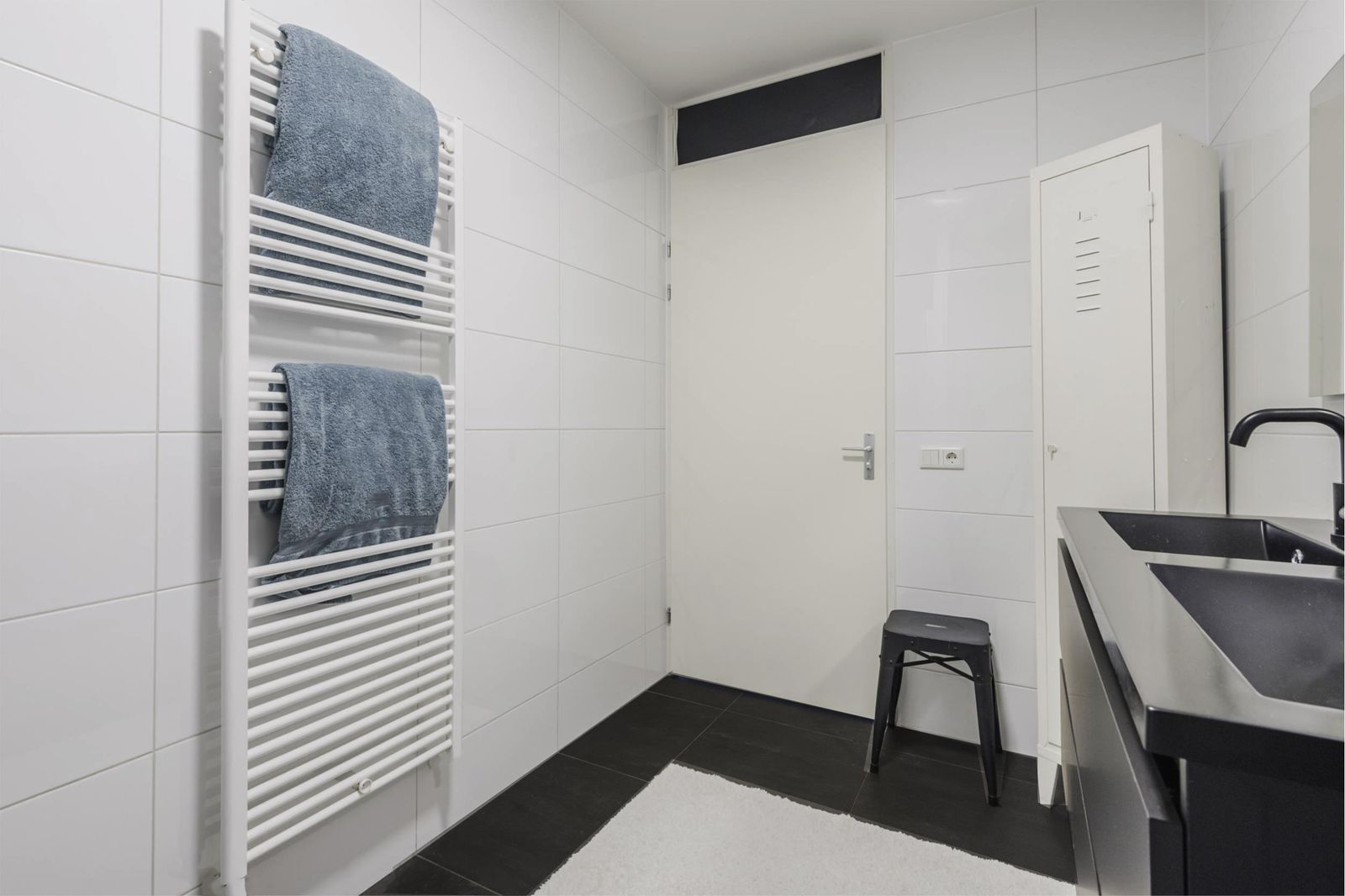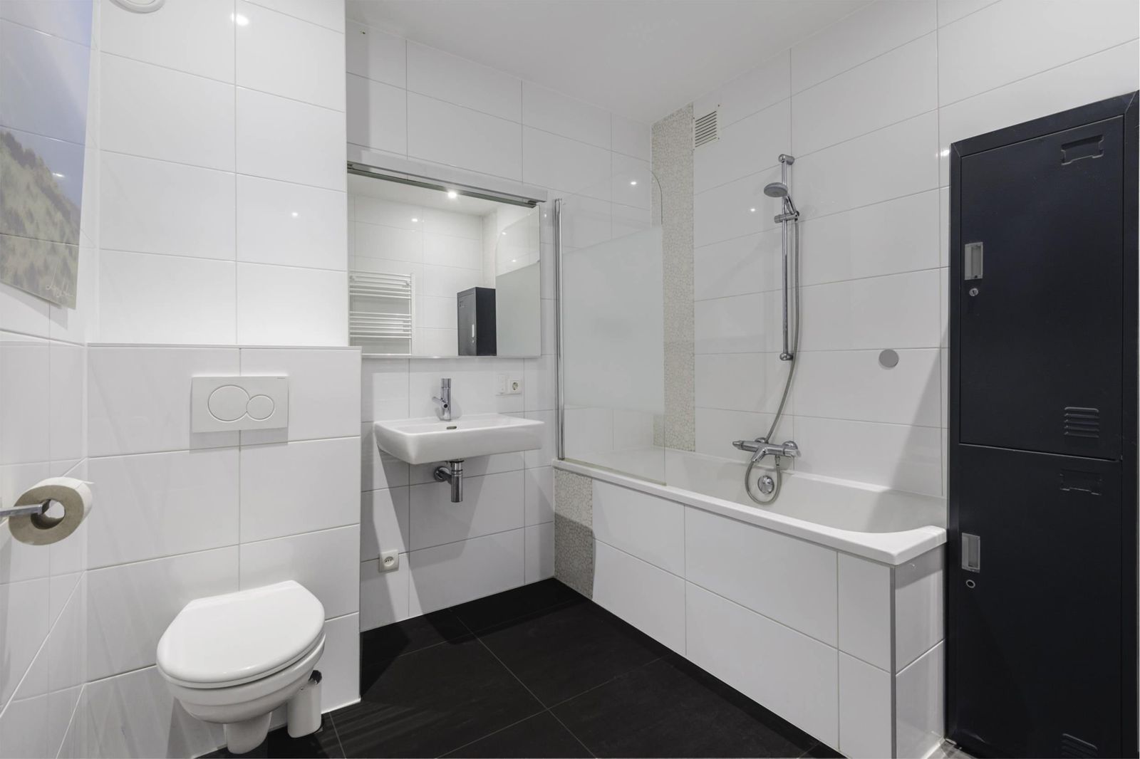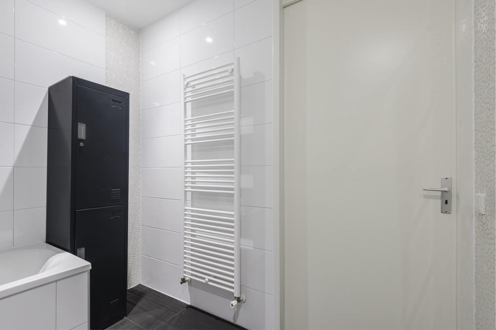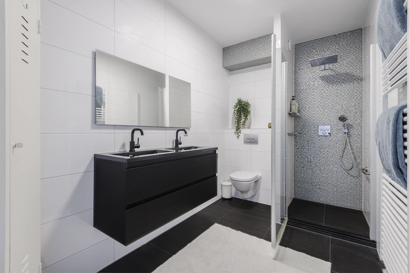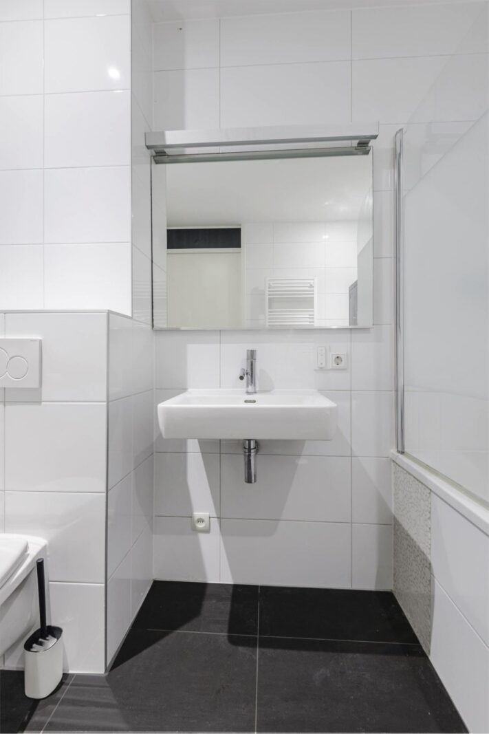 •Badkamer: Gelegen tussen de slaapkamers en voorzien van een tweede zwevend toilet en een bad/douchecombinatie. De witte wandtegels worden speels onderbroken door een kiezelsteen-look tegel. De vloer bestaat uit grijze keramische tegels – strak, ruimtelijk en onderhoudsvriendelijk.