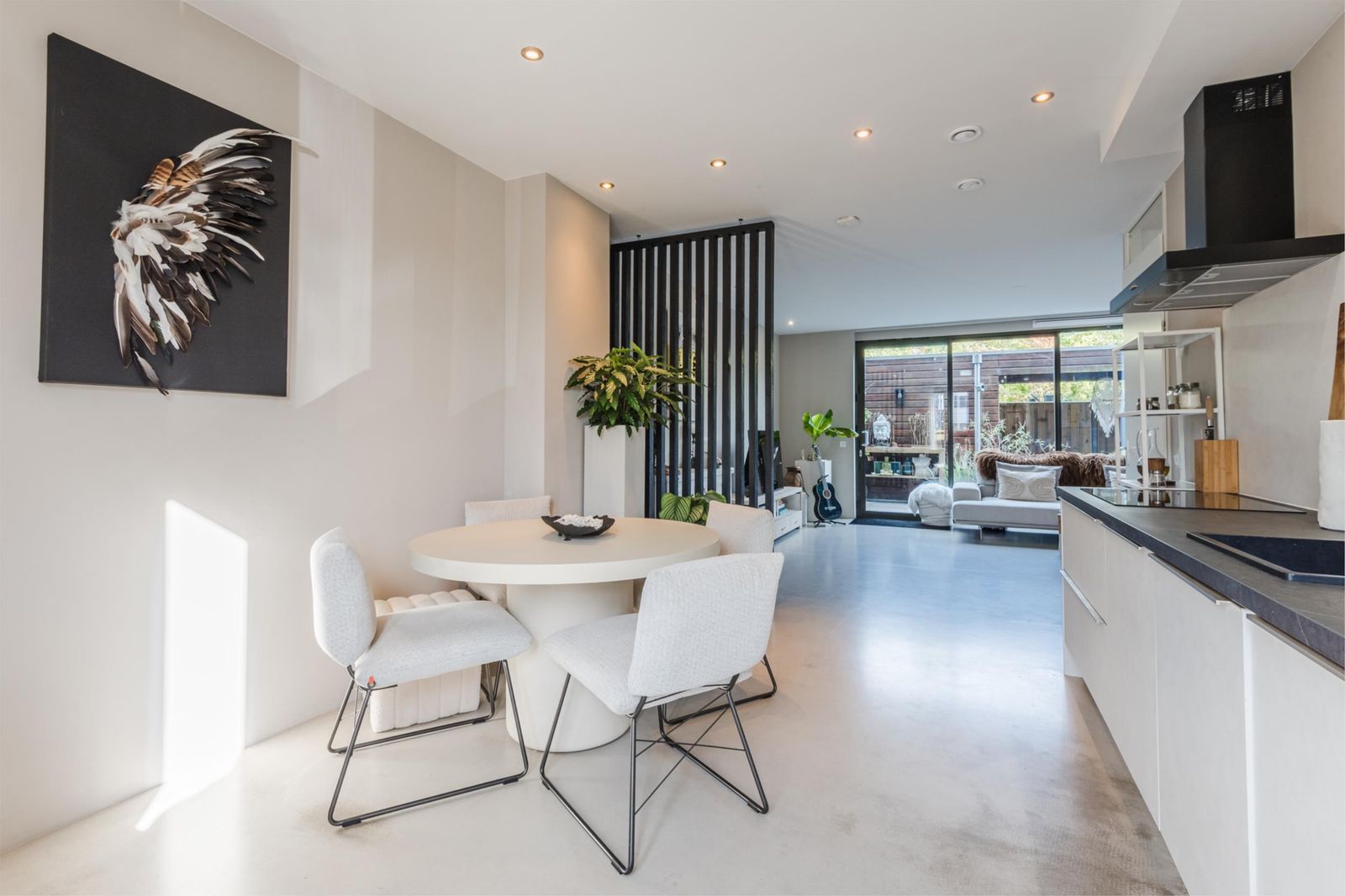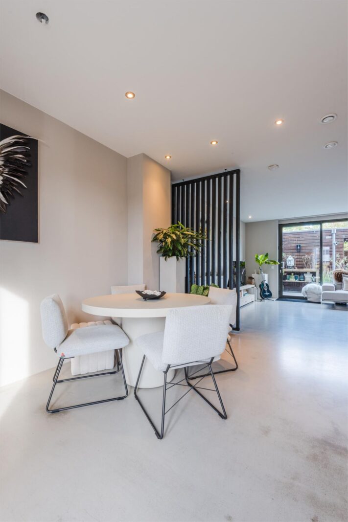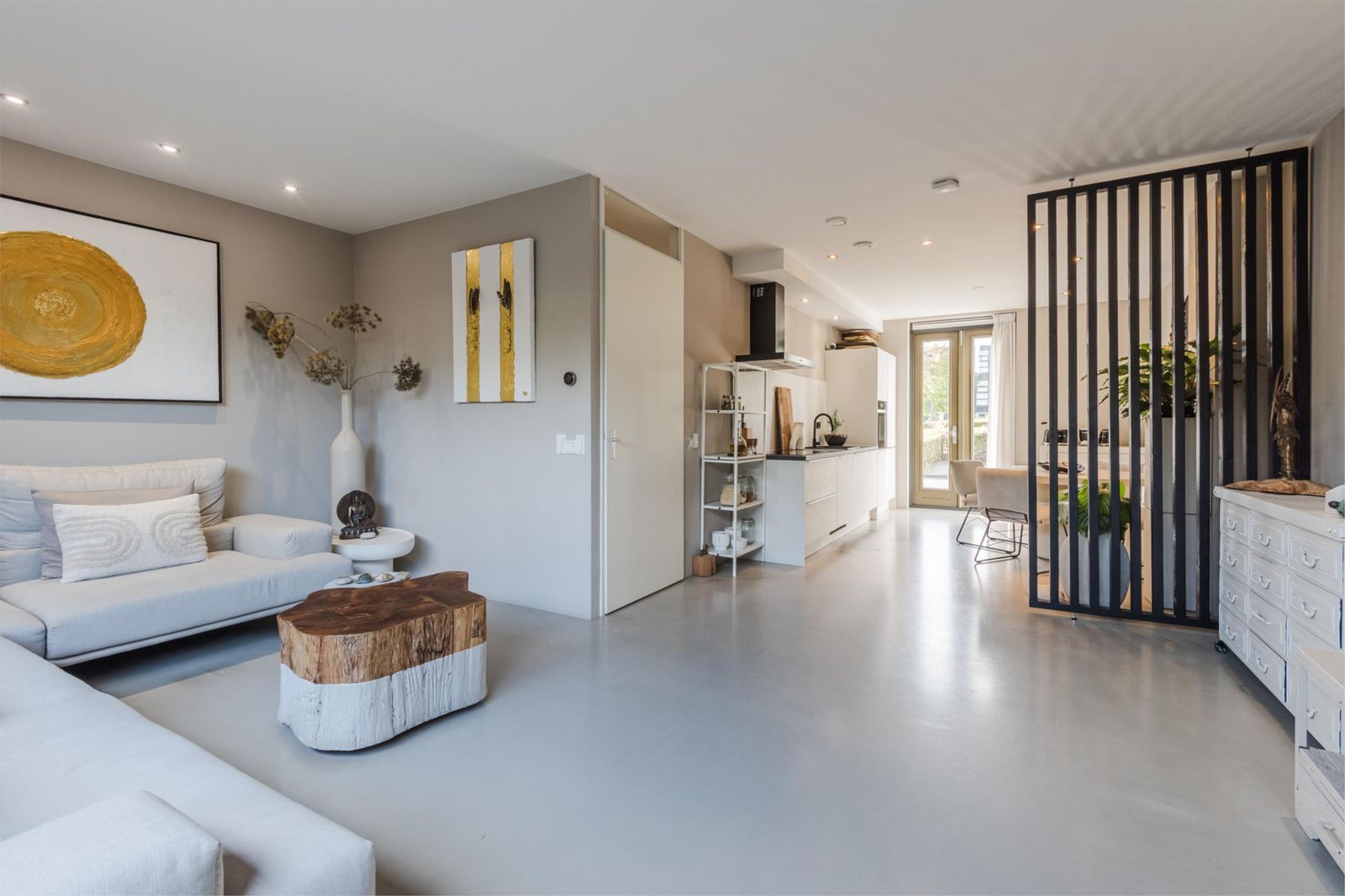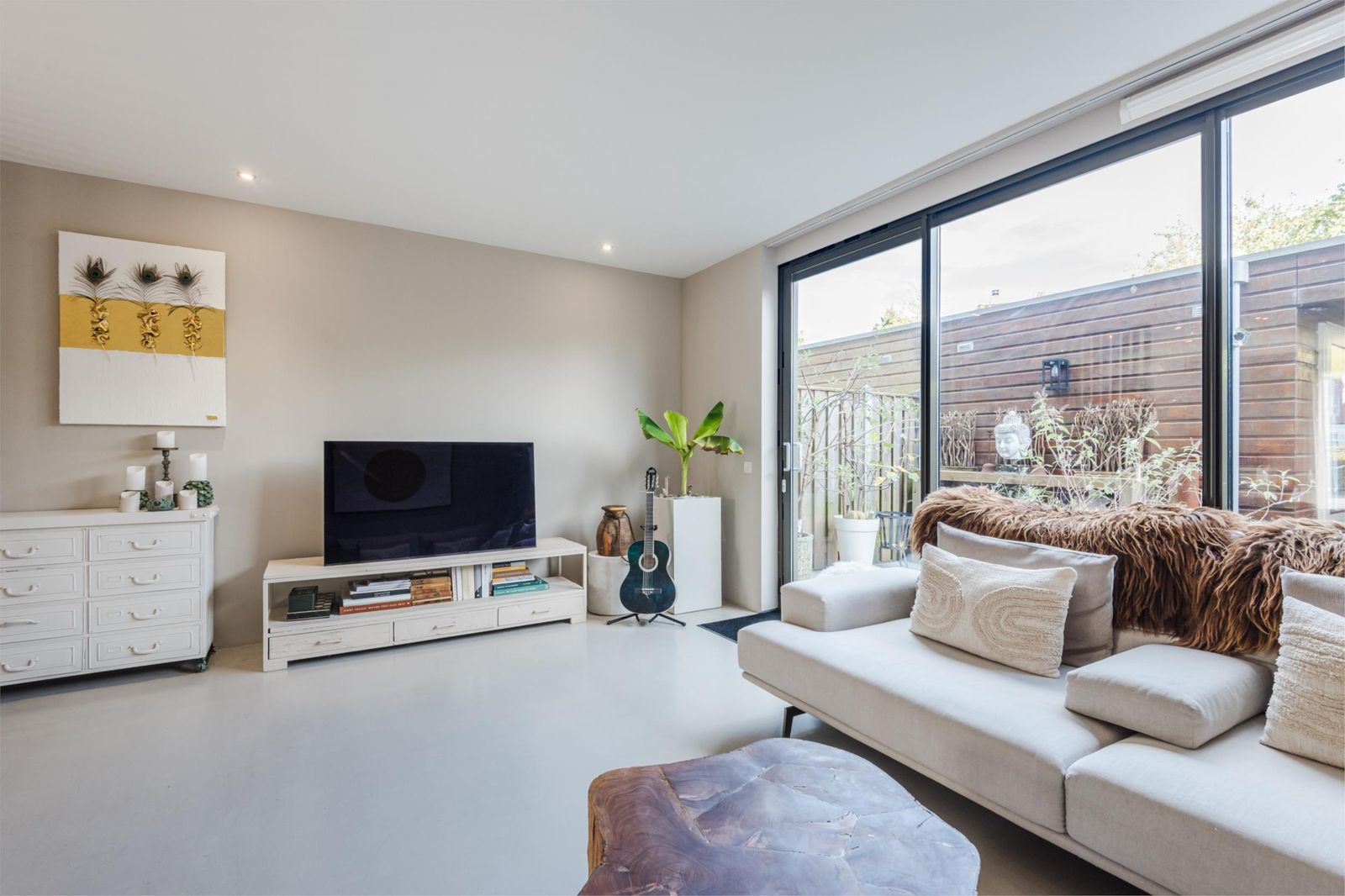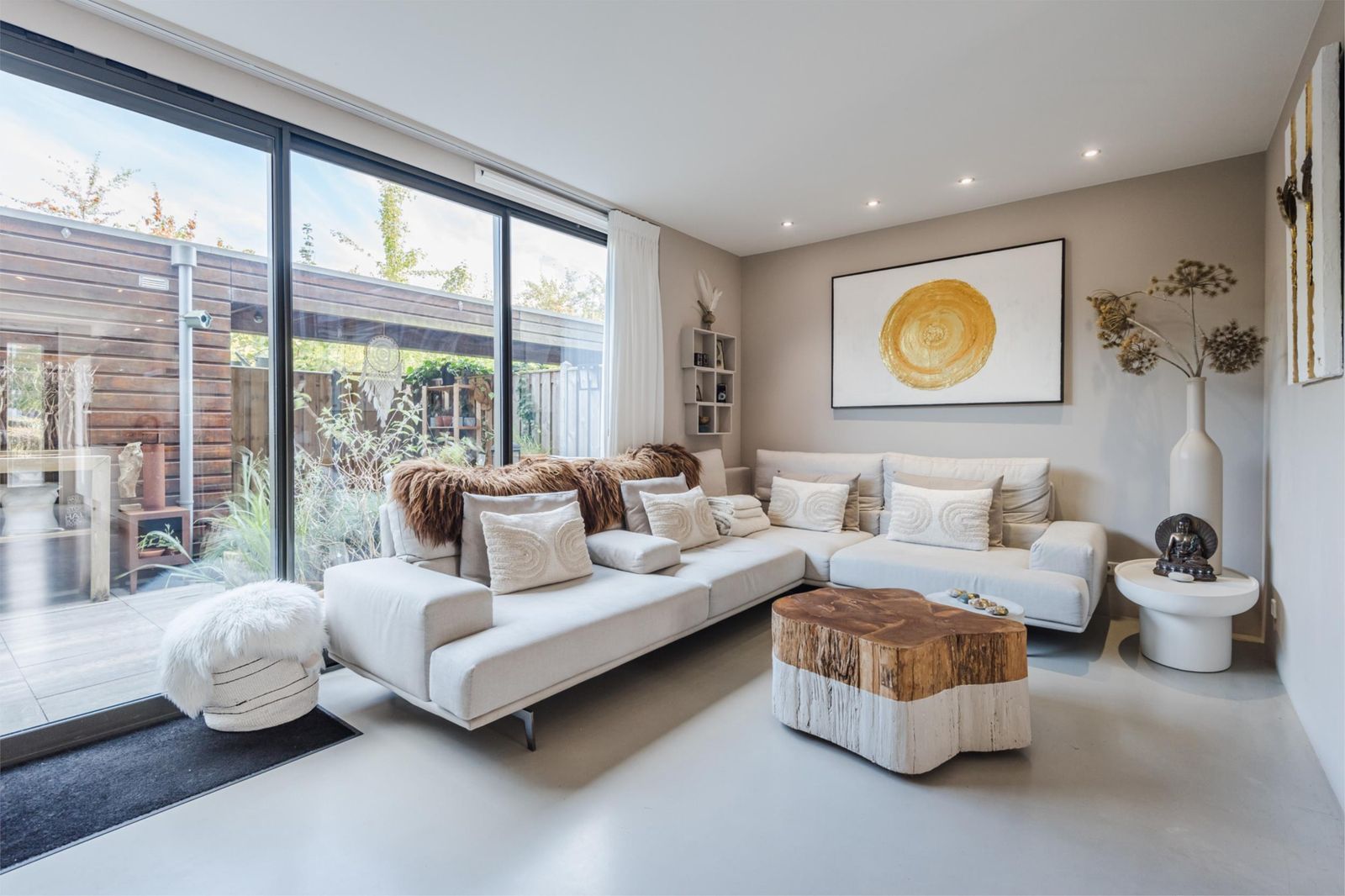 De intieme woonkamer aan de achterzijde biedt genoeg ruimte voor een grote loungebank en is volledig privé doordat er geen directe inkijk is vanaf de straat. De gehele begane grond is voorzien van vloerverwarming, bedienbaar met een energiezuinige, zelflerende Nest-thermostaat. Bovendien is de verdieping uitgerust met plafond-geïntegreerde Philips Hue-verlichting, deels voorzien van RGB-verlichting, die je bedient via de app of een draagbare afstandsbediening.