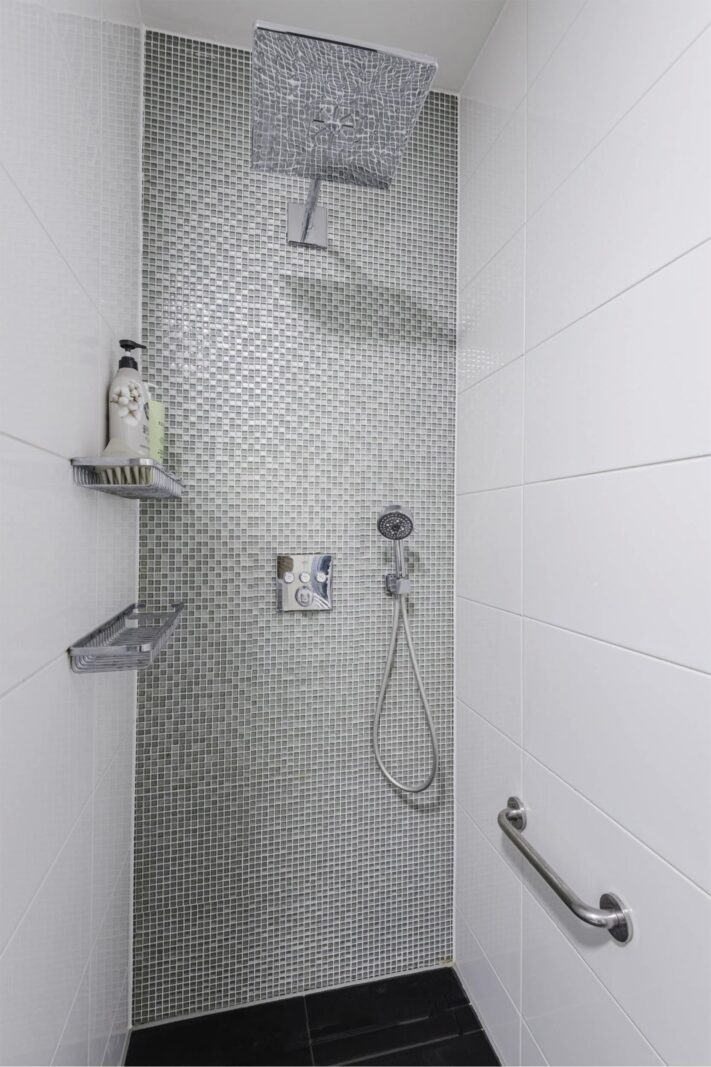•Badkamer: Deze tweede badkamer beschikt over een zwevend toilet, dubbele wastafel, instapdouche en handdoekradiator. De grijze keramische vloertegels en witte glanzende wandtegels worden gecombineerd met een groen mozaïekaccent op de achterwand – wat zorgt voor een frisse, uitnodigende uitstraling.
