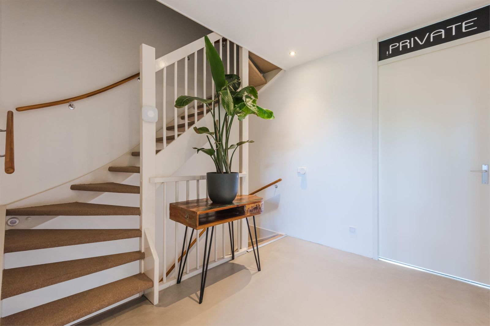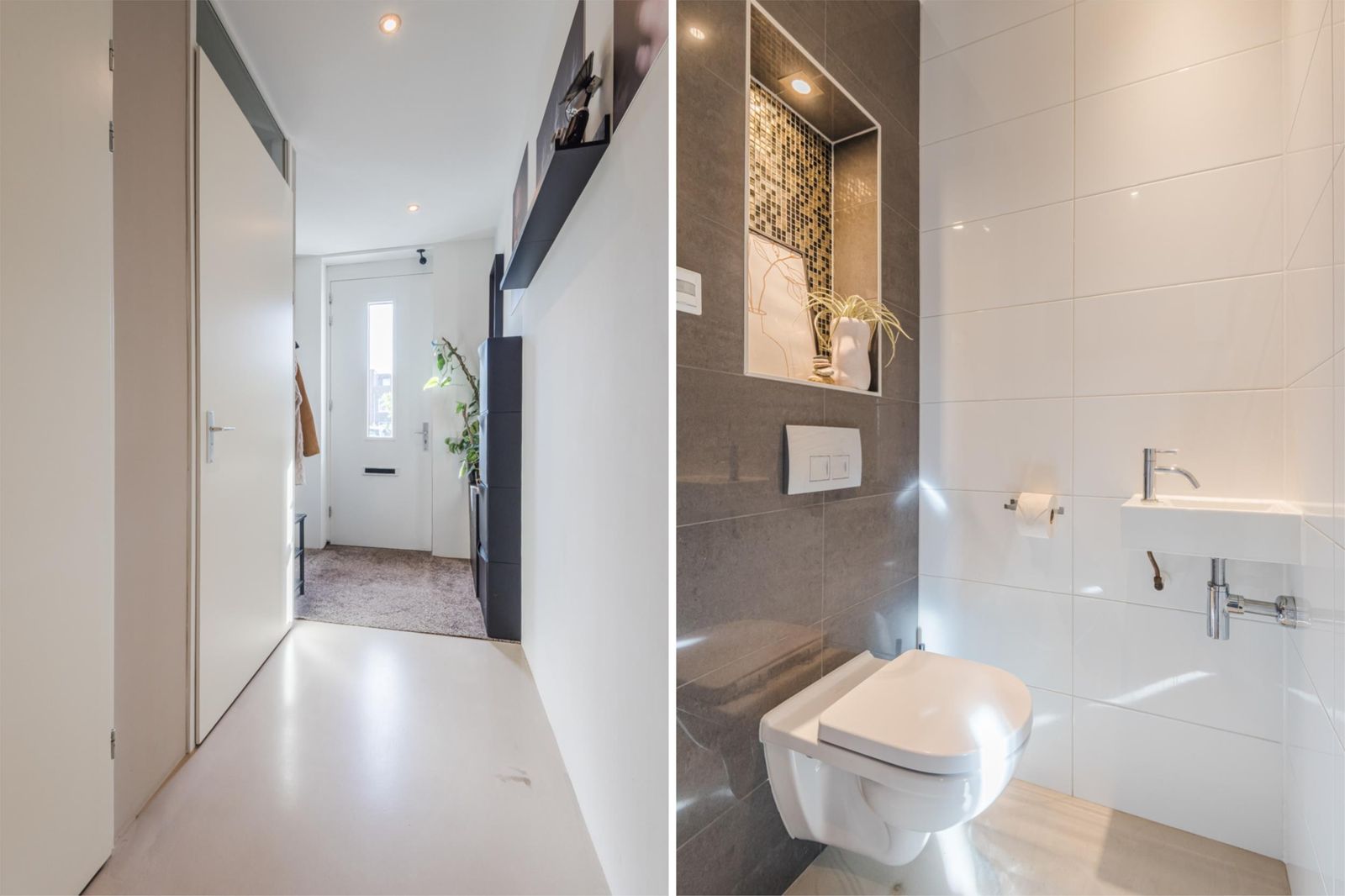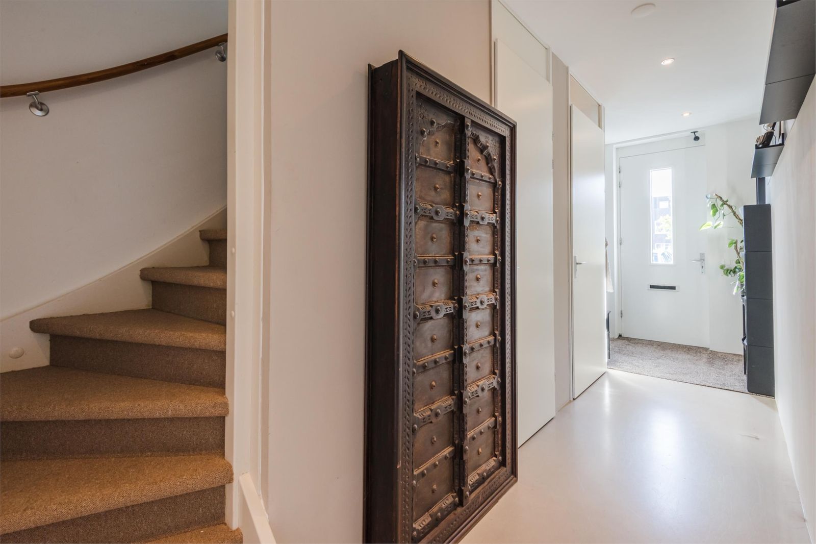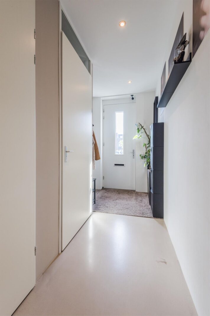 Via de hoge voordeur met langwerpig raam stap je een zeer ruime, lange hal binnen. In deze hal, die met name bij zonlicht uitnodigend en tot zijn recht komt, heb je ruime toegang tot het toilet, de trap naar de eerste verdieping, de meterkast, een voorraadkast onder de trap en de L-vormige woonruimte.