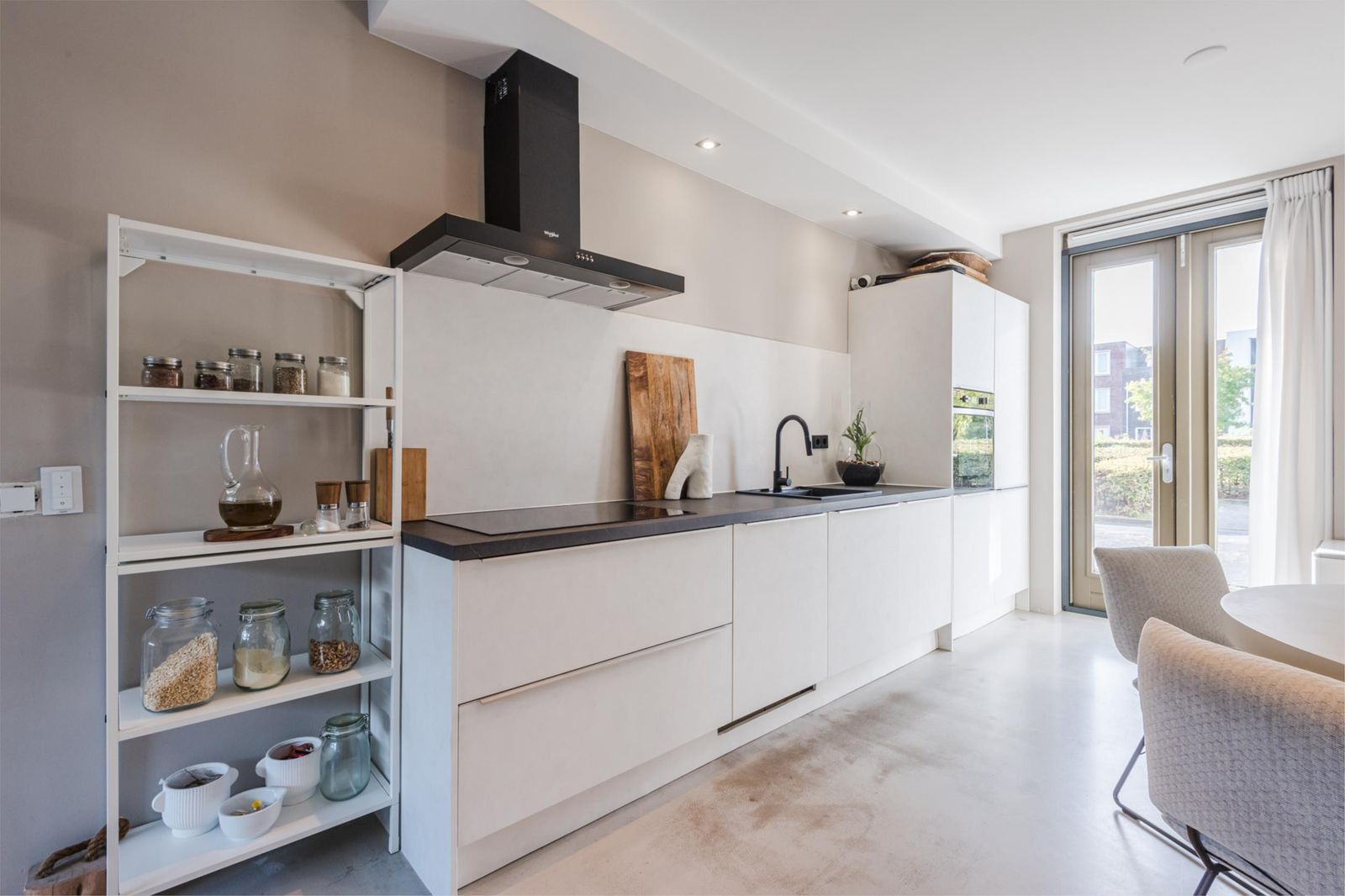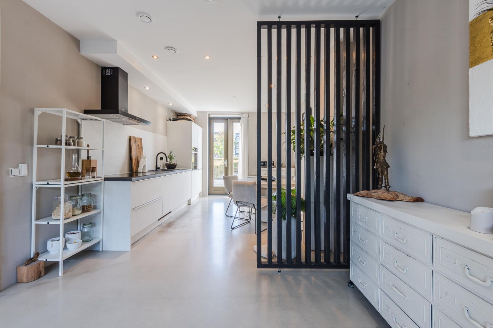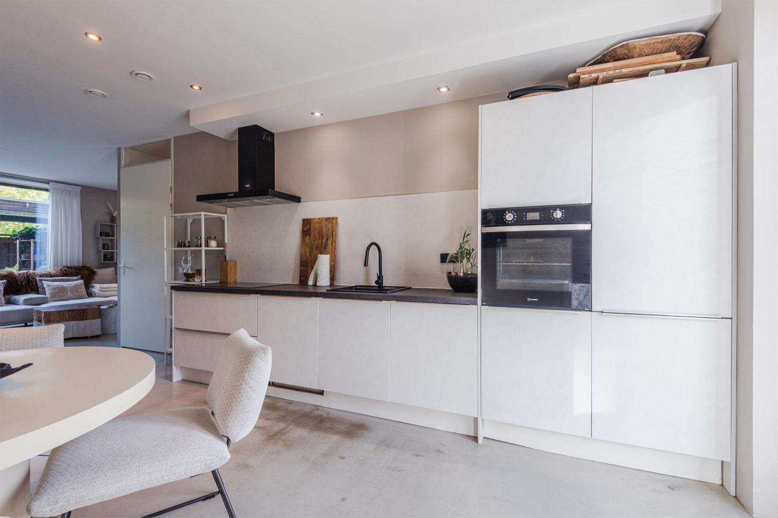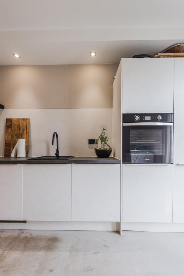De woonkamer en keuken zijn in een open L-vormige opstelling. Aan de voorzijde, bij de keuken, zorgen openslaande deuren voor de mogelijkheid om buiten te zitten bij mooi weer. De woonkeuken biedt ruimte voor een eettafel met zes stoelen. De in 2014 geplaatste inbouwkeuken is in 2022 voorzien van nieuwe moderne apparatuur, zoals een inductiekookplaat, vaatwasser, oven en een zwart marmer-look aanrechtblad. In 2024 is de keuken opnieuw gewrapped in een “white stone” betonciré, dat vlek- en vingerafdrukvrij is.