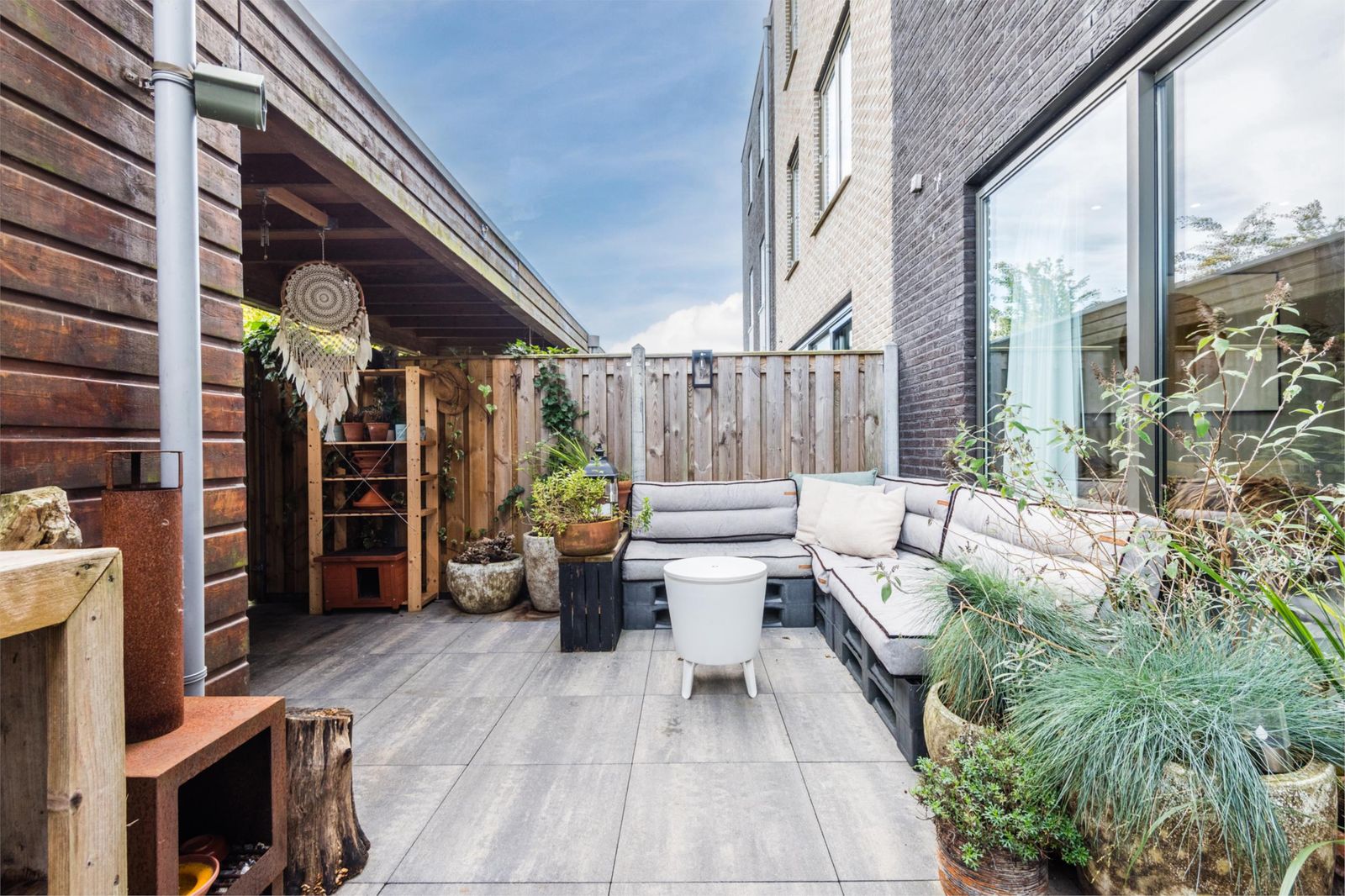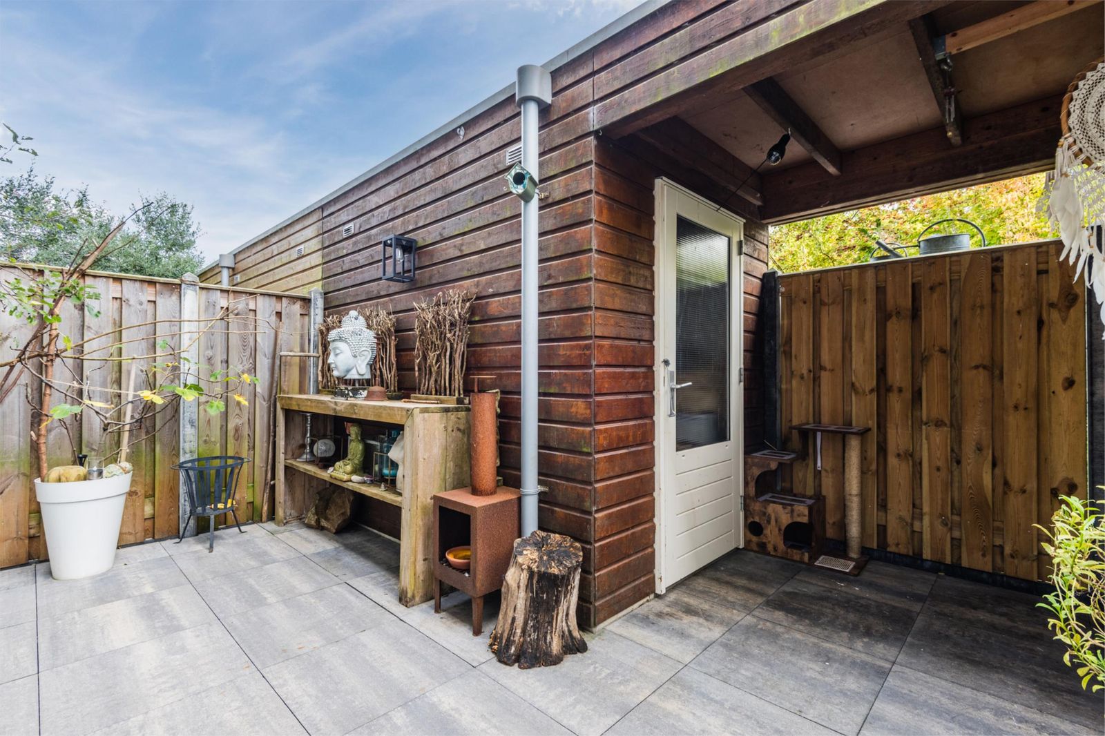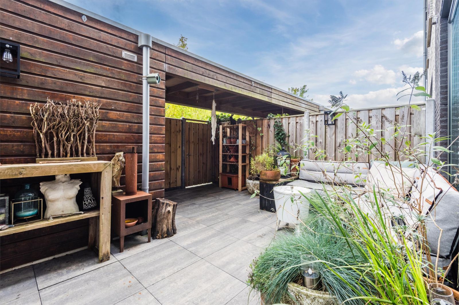 Aan de achterzijde van de woning ligt de tuin, georiënteerd op het noorden – ideaal voor wie in de zomer van verkoeling houdt. De tuin is bescheiden van formaat, maar biedt volop mogelijkheden om er een knusse, sfeervolle plek van te maken. Dankzij de keramische tegels is de tuin onderhoudsvriendelijk en oogt ruimtelijk. De schuur beschikt over een overkapping en staat direct aan de erfgrens. Achter de woning ligt een achterpad, gevolgd door een grasstrook en gemeentelijke beplanting. Hoewel de huizen van het hofje verderop niet ver weg staan, zorgen de bomen en struiken voor voldoende privacy. En als je kinderen hebt: in Noorderplassen spelen ze volop buiten – afhankelijk van het seizoen wordt er gefietst, gezwommen en gespeeld.