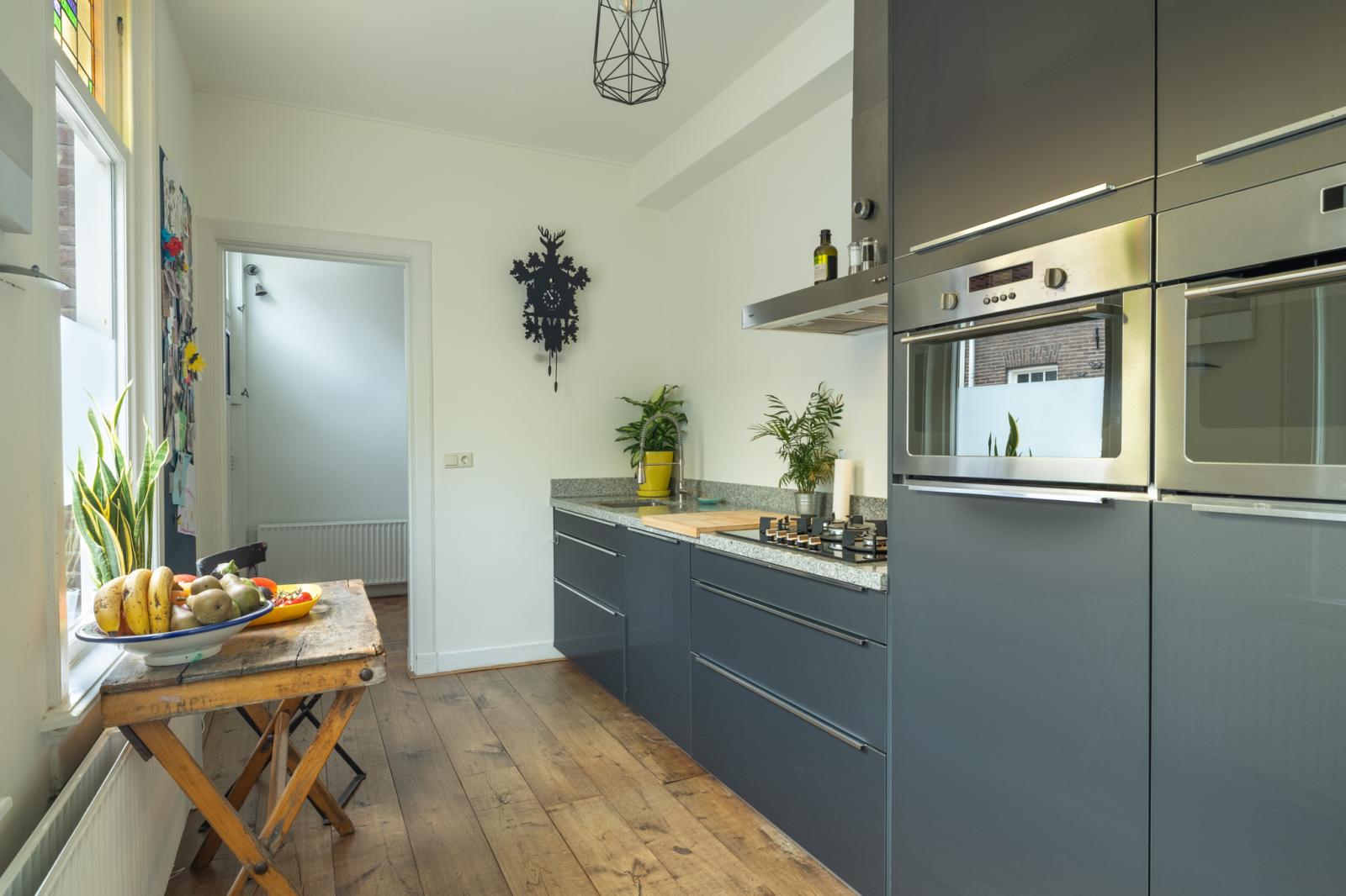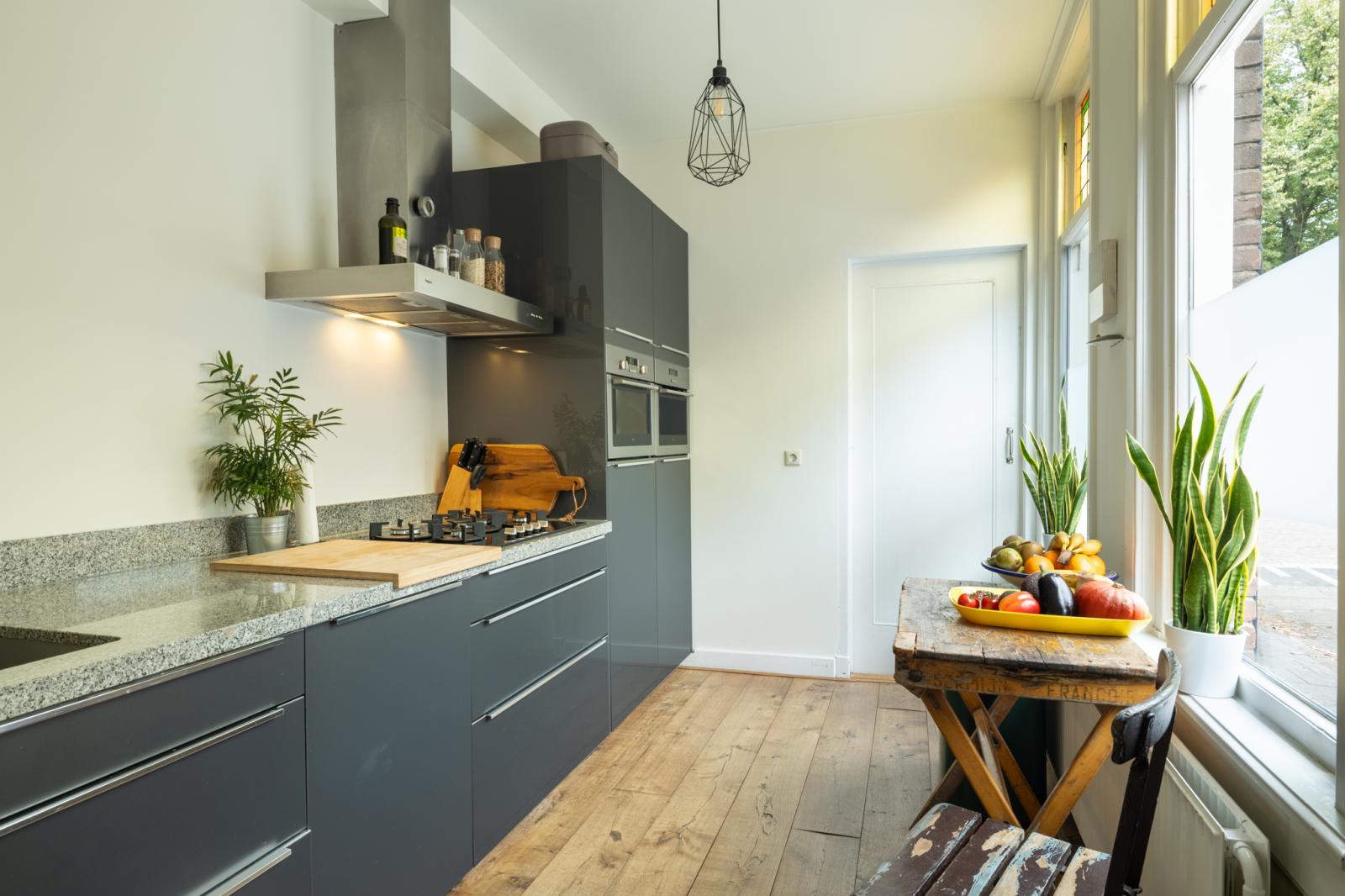 Aan de achterzijde creëer je eenvoudig een sfeervolle zithoek, met zicht en toegang tot de tuin, en aan de voorzijde is genoeg plek voor een ruime eethoek. De keuken (2010) bereik je via de entreehal; deze is strak, donker en voorzien van alles wat je nodig hebt _ van gas-op-glaskookplaat tot stoomoven en combimagnetron, een koelkast en vaatwasser. Het geheel is afgetopt met een granieten werkblad. Aan de achterzijde ligt de bijkeuken/wasruimte, met de cv-opstelling (2022) én een aparte doorgang naar de tuin. Grenzend aan de keuken beschik je overigens over een ruime berging, een ideale ruimte om in te zetten als fietsenstalling, vanwege de directe toegang tot de voorzijde van de woning.