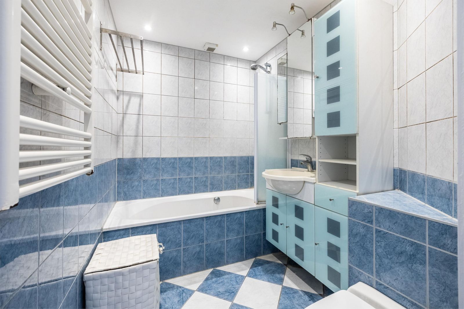 Overloop. Drie slaapkamers, waarvan de ouderslaapkamer aan de voorzijde over de volle breedte. Nette badkamer met ligbad/douche, hangtoilet en wastafelmeubel.
