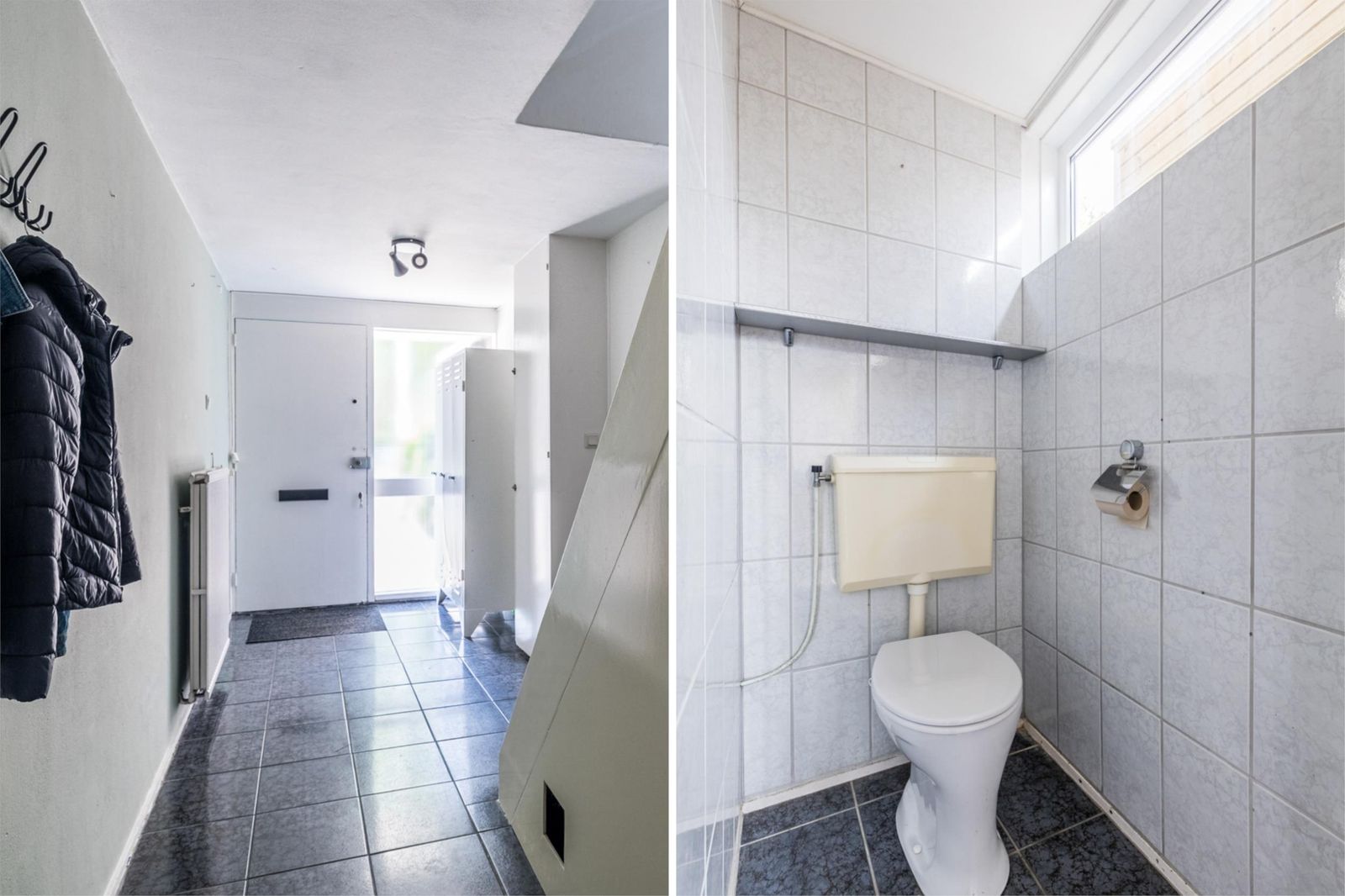 Entree met ruime hal. Royale kantoorruimte of master bedroom (voormalige garage). Wasruimte met cv-opstelling. Toiletruimte. Deur naar de achtertuin.