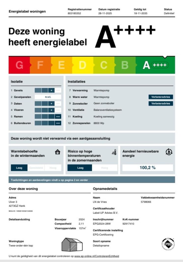 In 2025 is het nieuwbouwproject Uiver gerealiseerd in het hart van het leuke dorp Hank. Alles aan deze aangeboden levensloopbestendige geschakelde halfvrijstaande woning is nieuw. De woning is geheel gerealiseerd en heeft maar liefst 4 slaapkamers en 2 badkamers. De laatste eindafwerking zoals de keuken en het sanitair kunnen nog naar eigen smaak worden afgewerkt. De woning is gasloos, energiezuinig en heeft het unieke A++++ energielabel, waardoor u geen energiekosten (nul op de meter) meer zult hebben met de 19 aanwezige zonnepanelen. De woningen aan de Uiver liggen aan een straat welke het gezamenlijk eigendom (ieder voor 25%) is van de 4 aanwonende eigenaren, waardoor u gezamenlijk ook nog eens extra eigen parkeerplaatsen ter beschikking hebt en tevens heerlijk veel privacy.