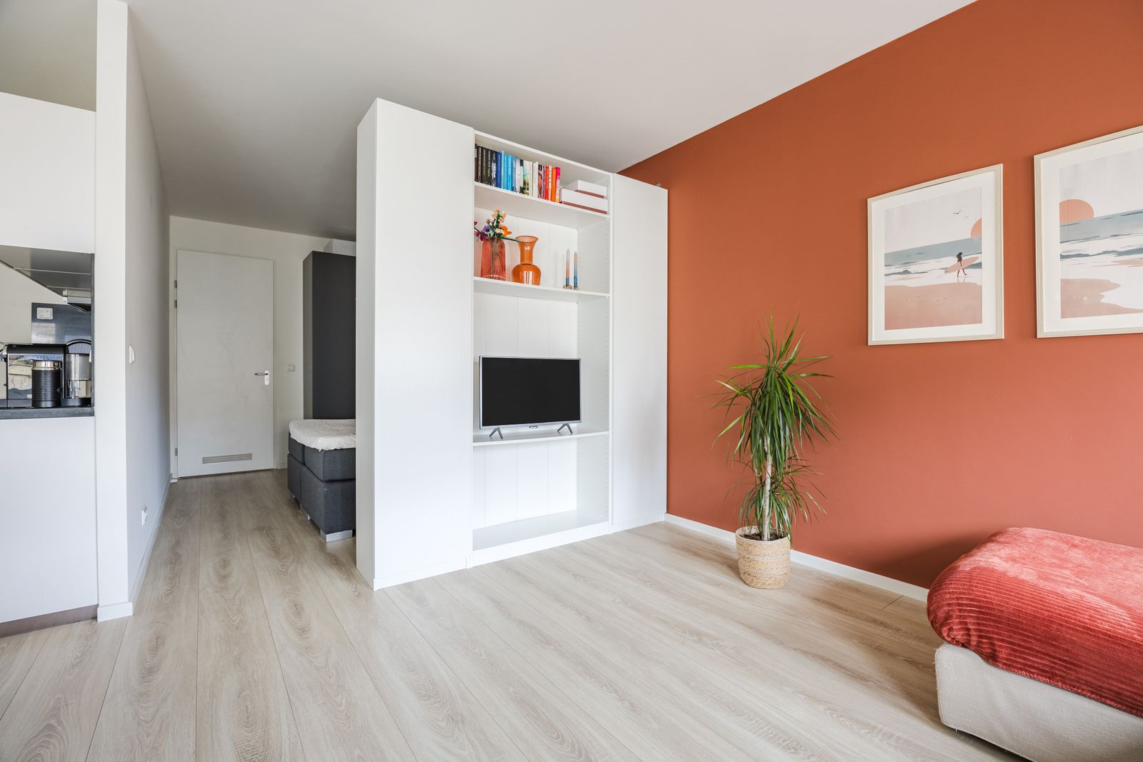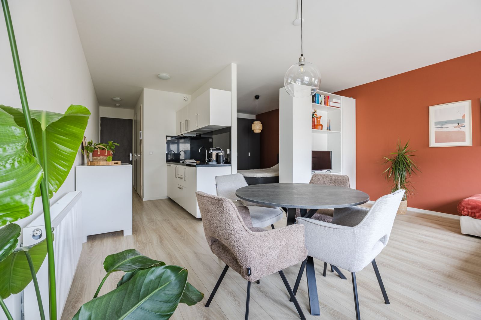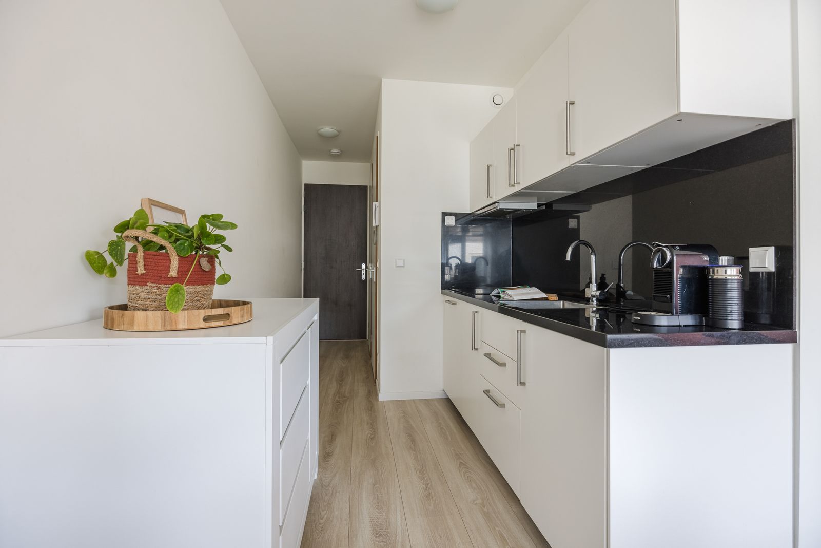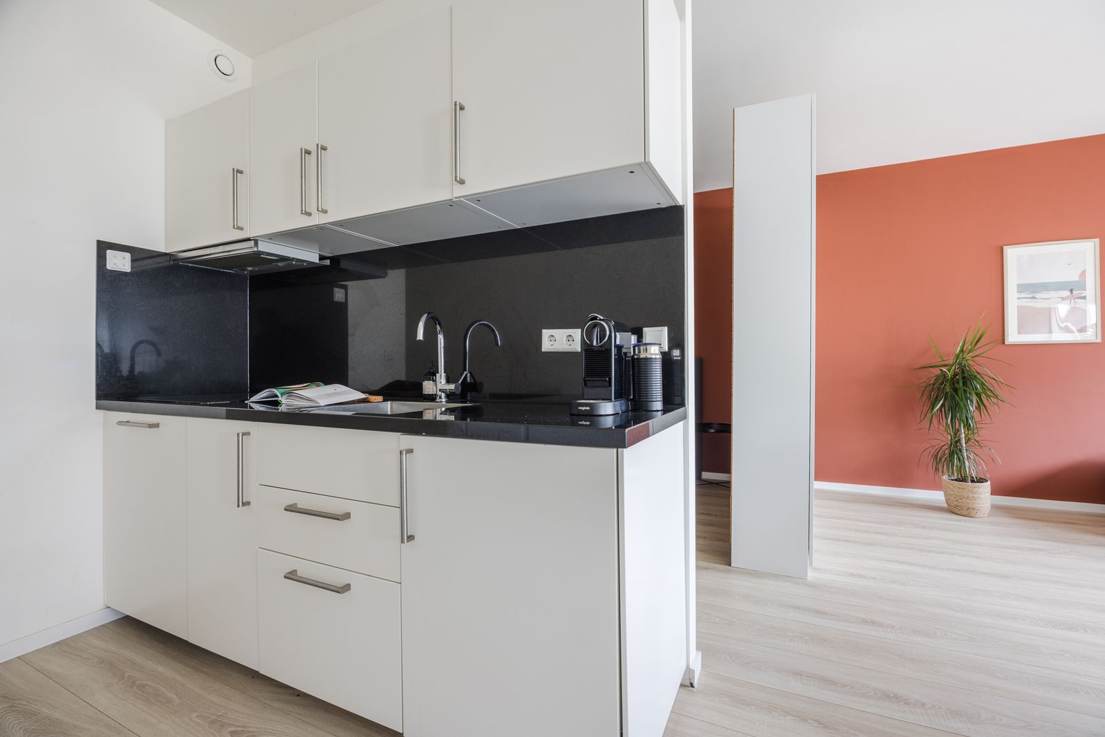 Het appartement is modern afgewerkt en voorzien van strak gestucte wanden, een fraaie laminaatvloer, een modern keukenblok met inbouwapparatuur en een nette badkamer met inloopdouche. De slaapkamer is afgescheiden van de woonkamer door middel van een hoge kastenwand, wat zorgt voor een praktische en gezellige indeling.