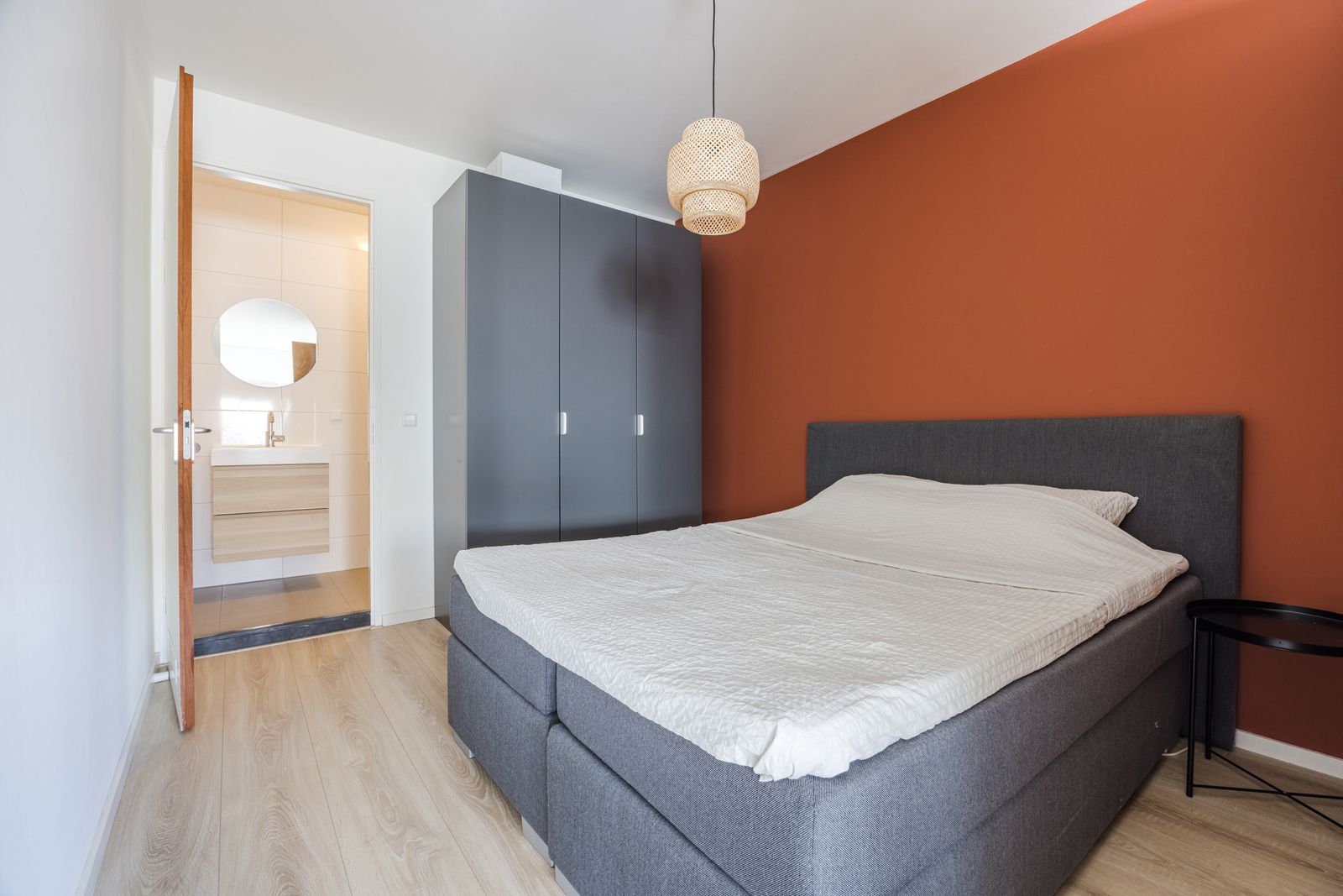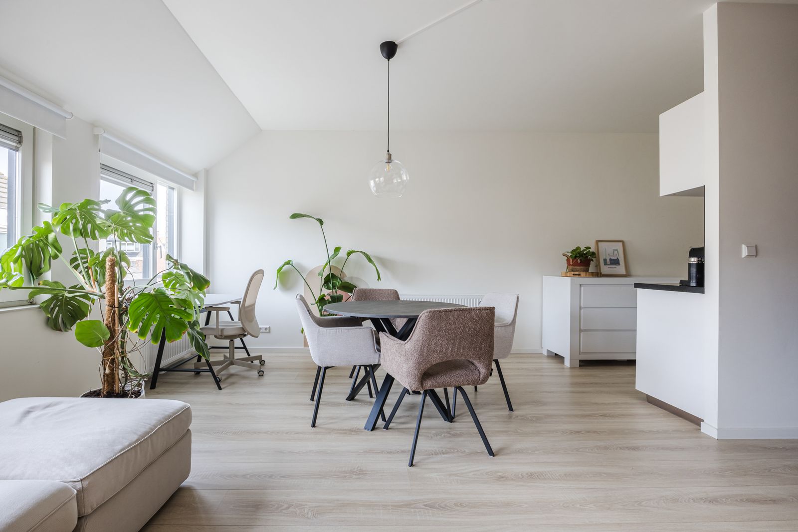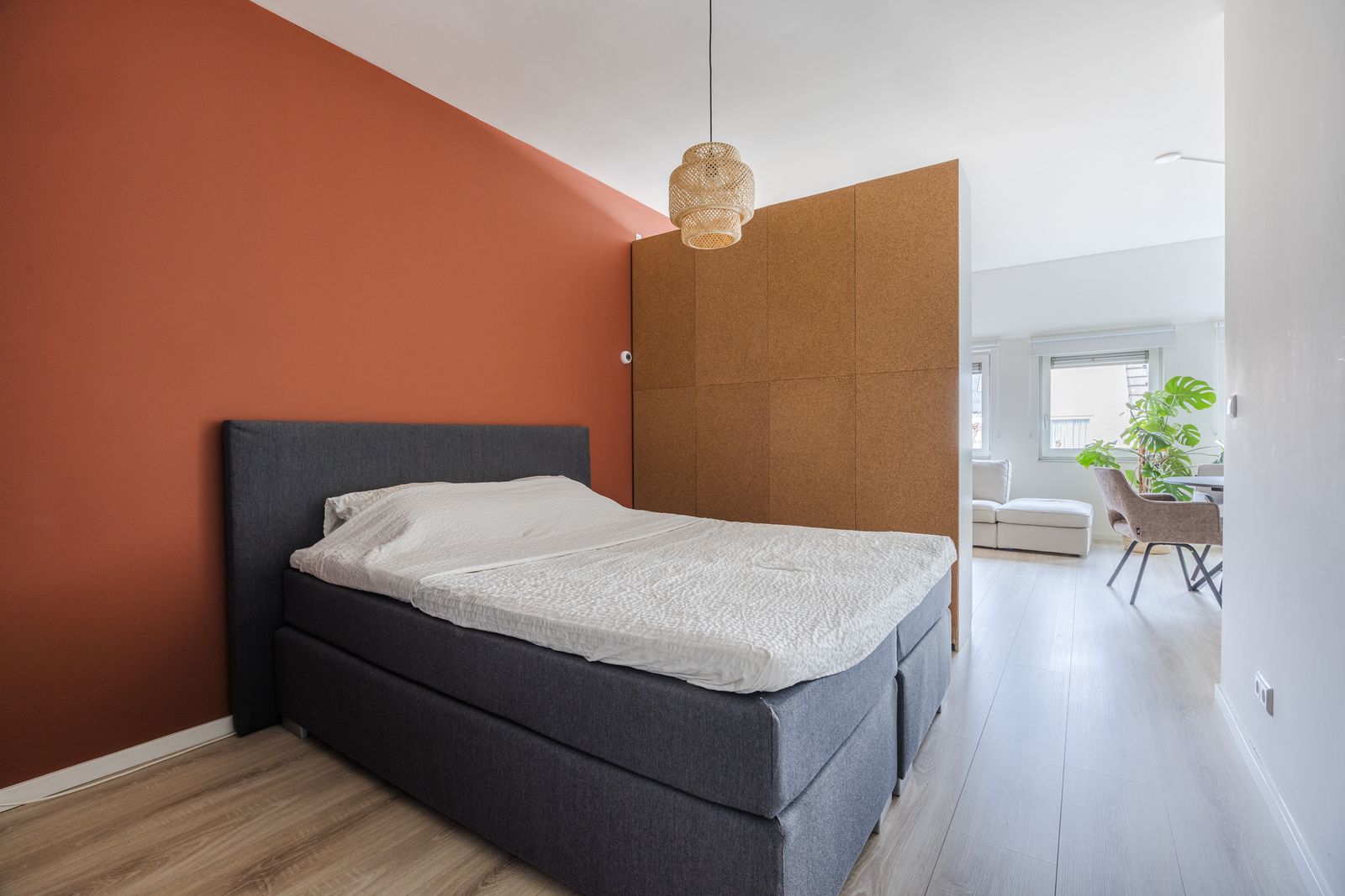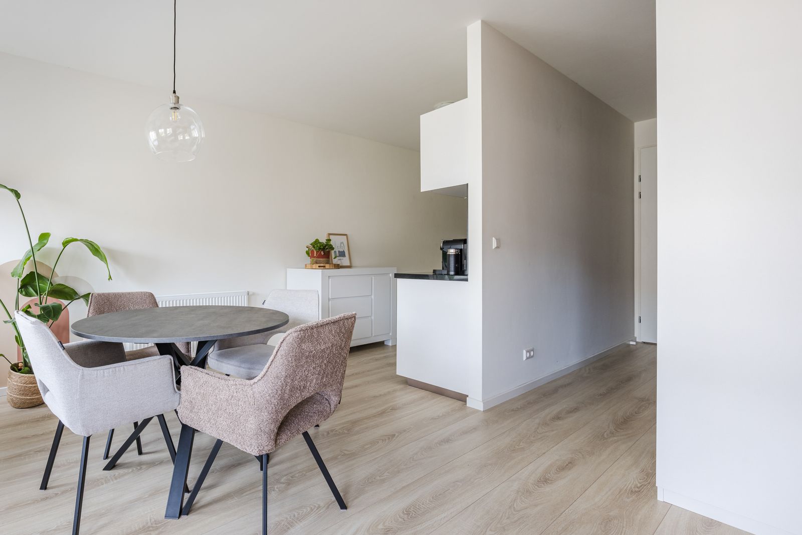 Het appartement is modern afgewerkt en voorzien van strak gestucte wanden, een fraaie laminaatvloer, een modern keukenblok met inbouwapparatuur en een nette badkamer met inloopdouche. De slaapkamer is afgescheiden van de woonkamer door middel van een hoge kastenwand, wat zorgt voor een praktische en gezellige indeling.