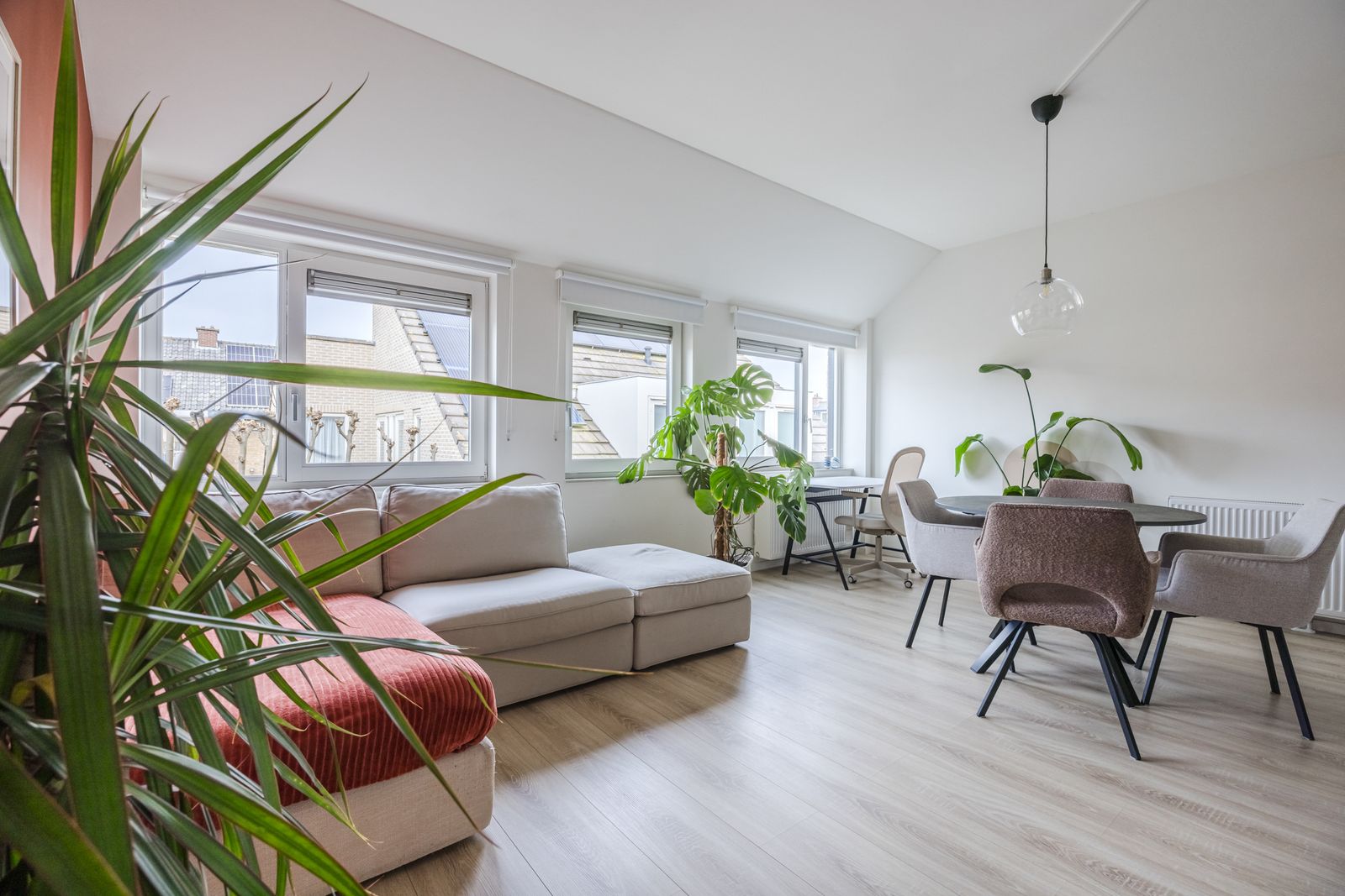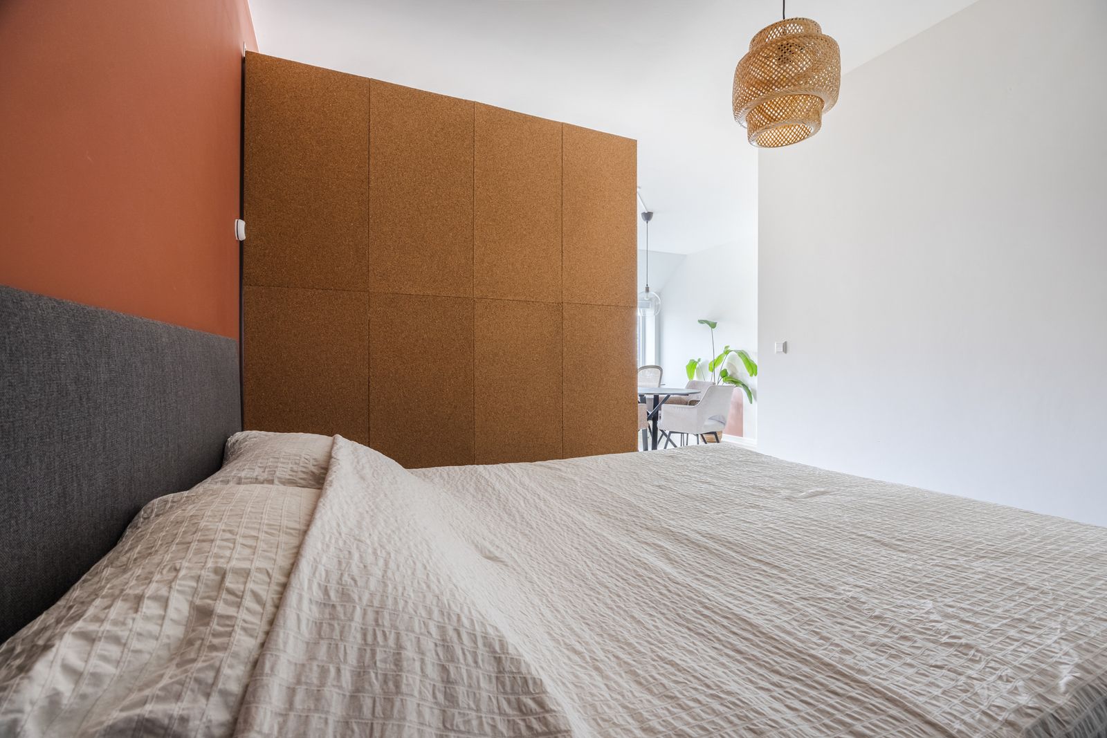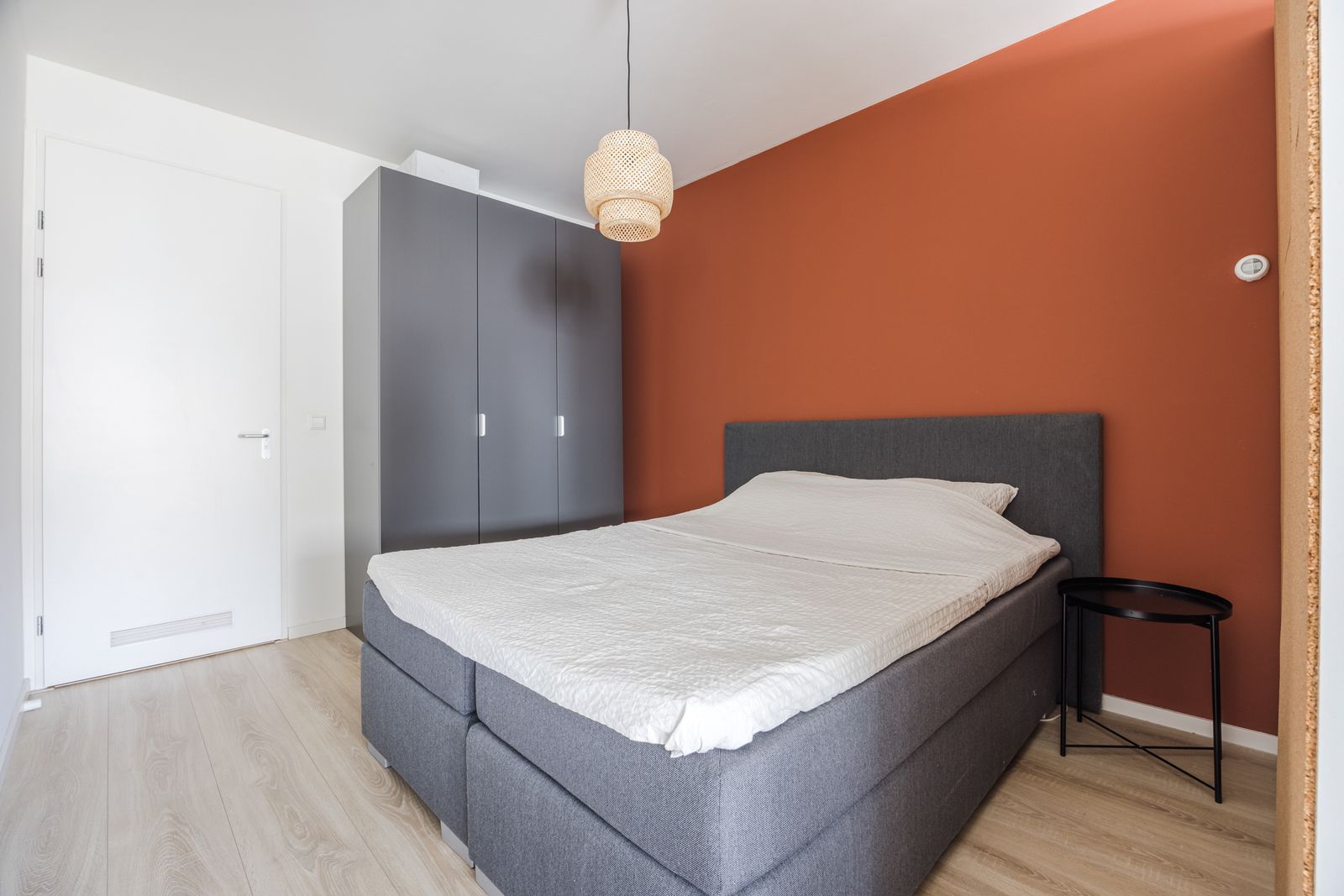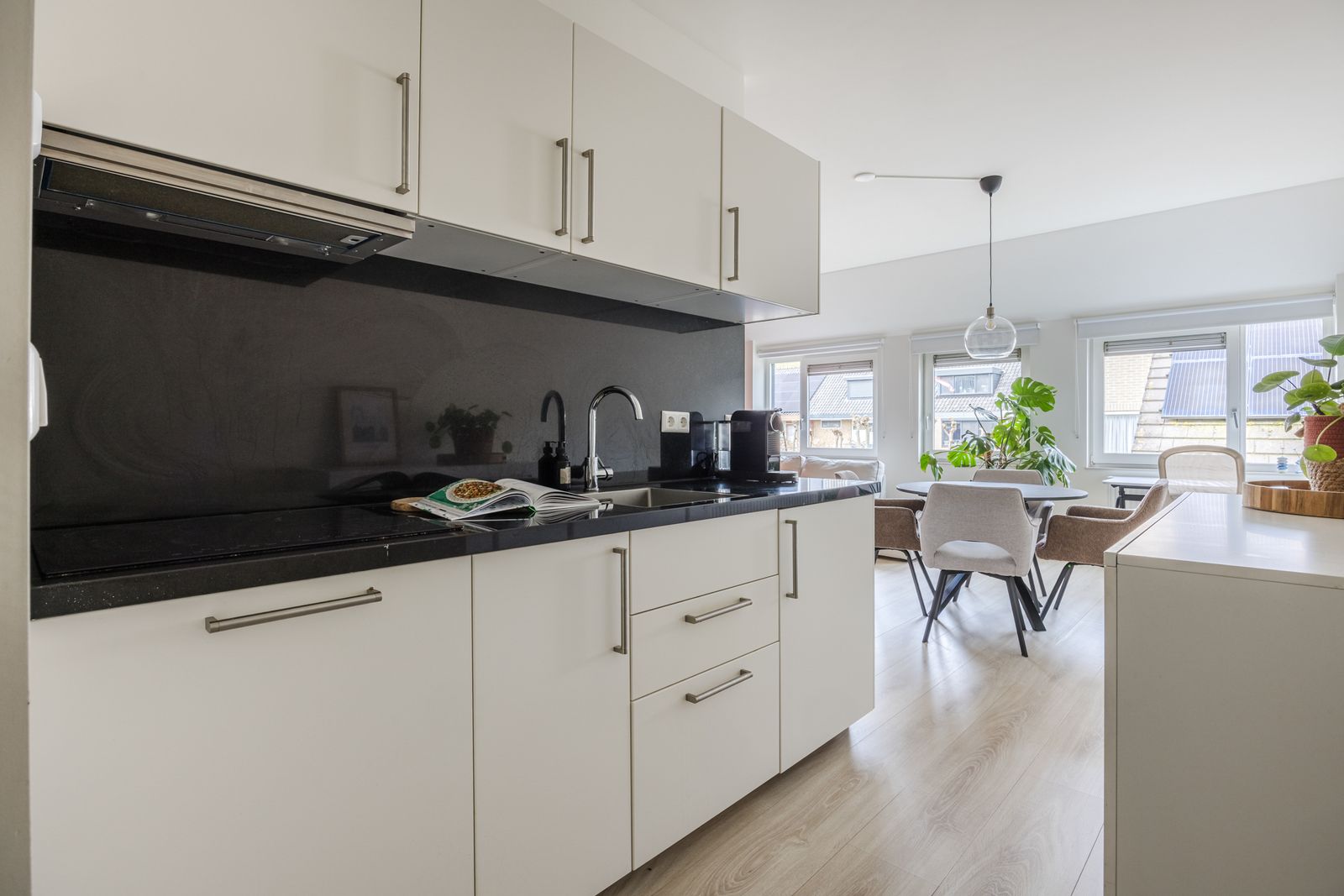 Het appartement is modern afgewerkt en voorzien van strak gestucte wanden, een fraaie laminaatvloer, een modern keukenblok met inbouwapparatuur en een nette badkamer met inloopdouche. De slaapkamer is afgescheiden van de woonkamer door middel van een hoge kastenwand, wat zorgt voor een praktische en gezellige indeling.