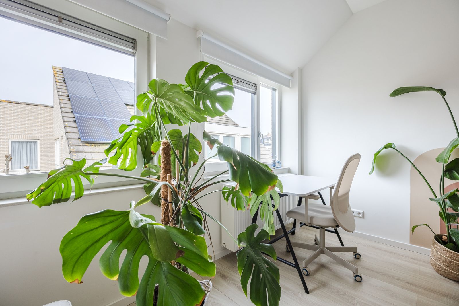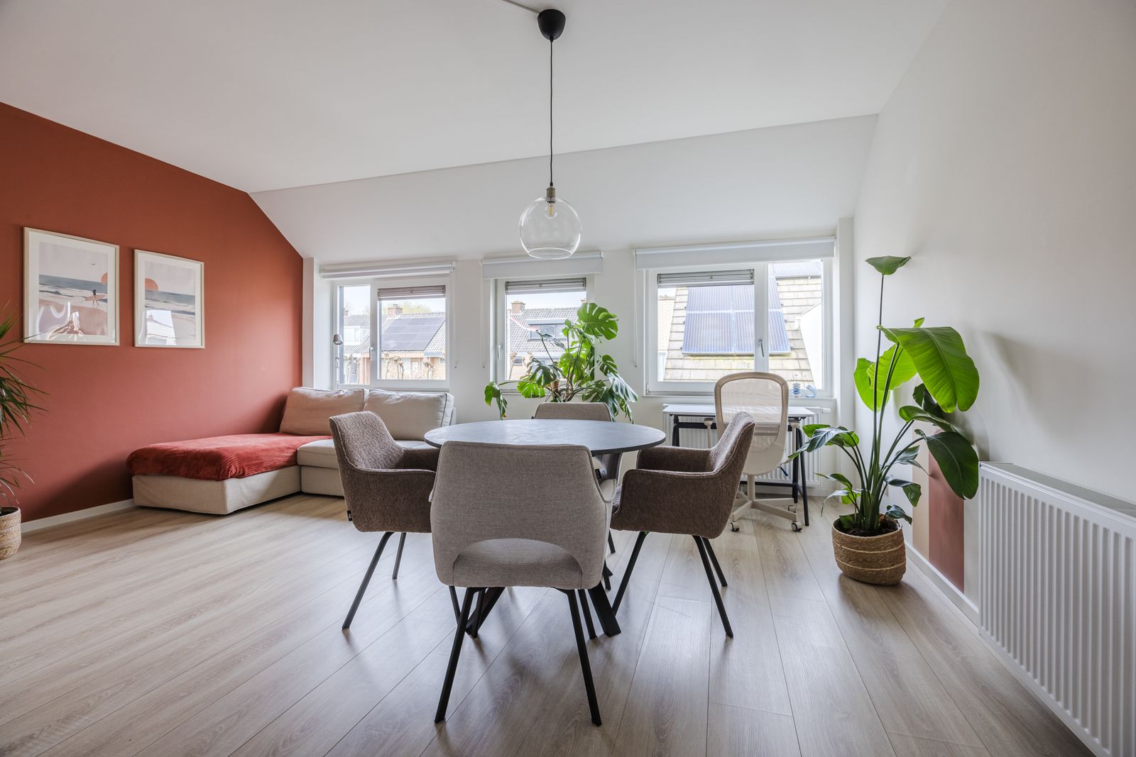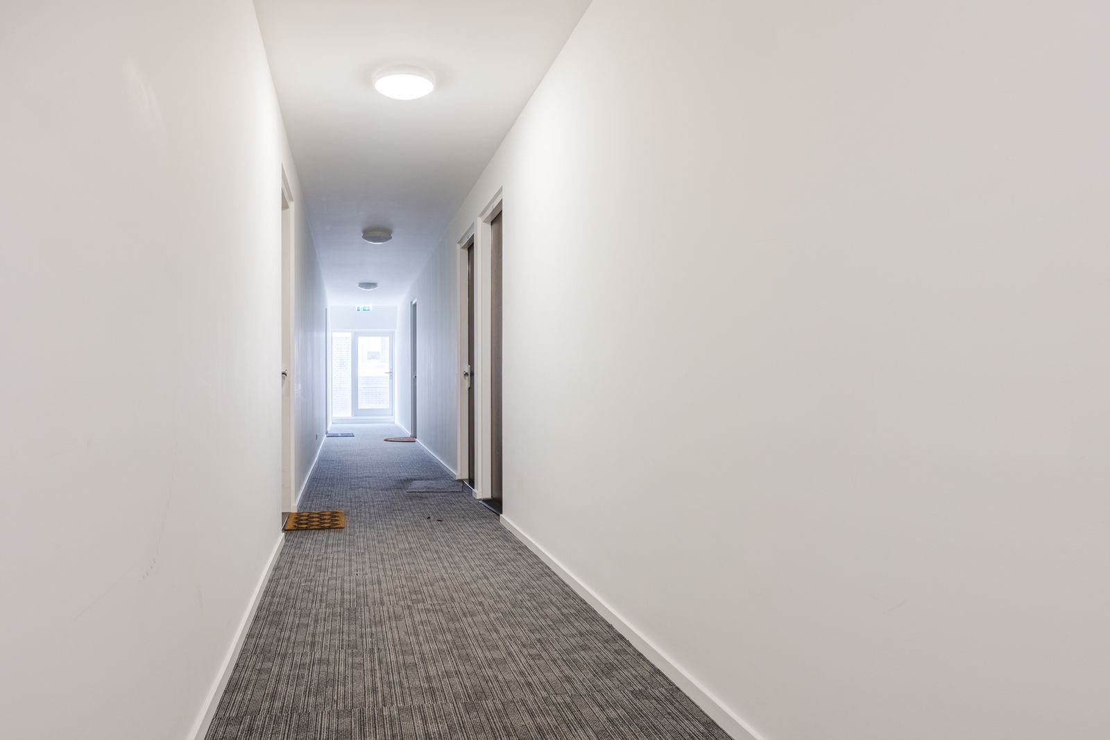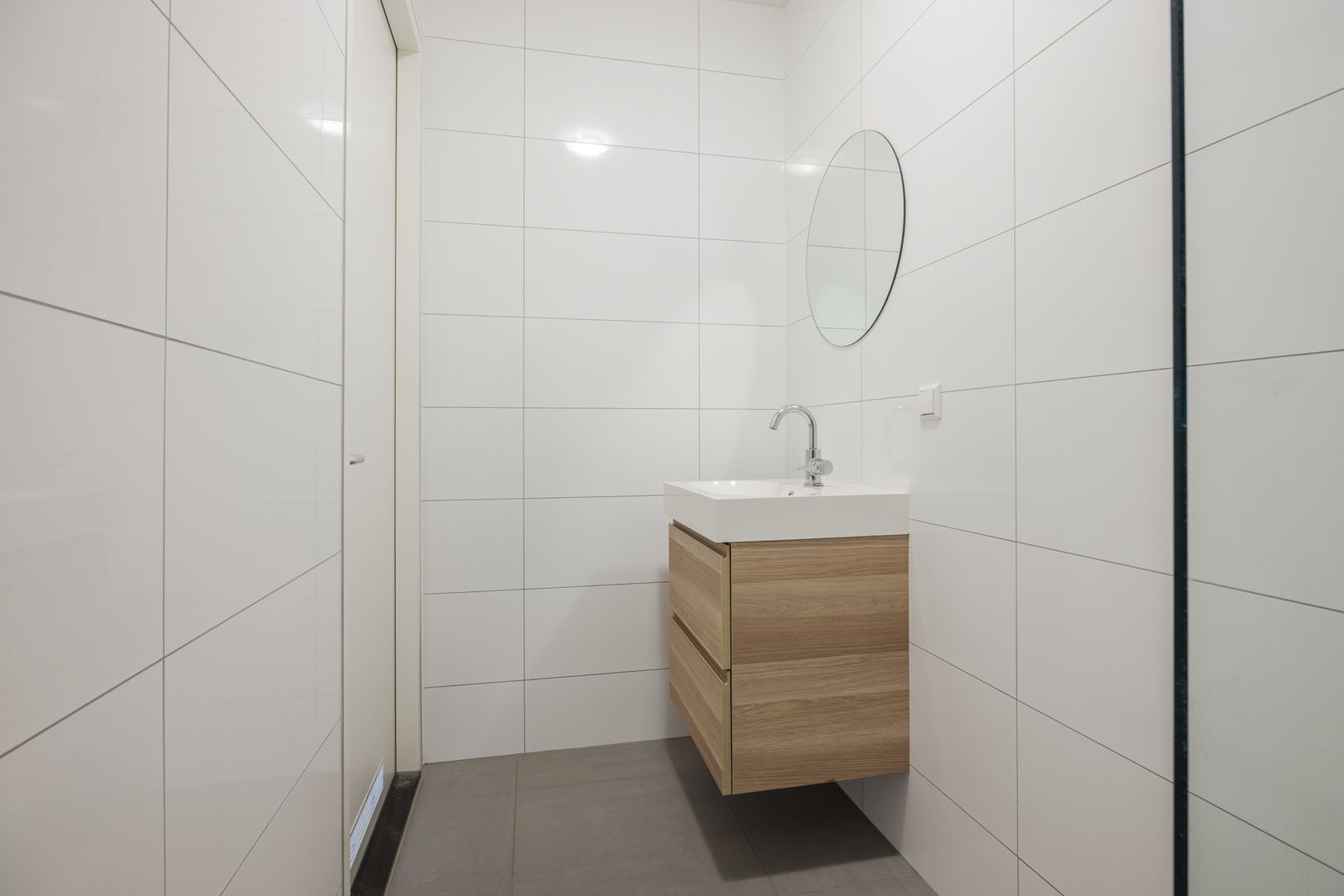 Het appartement is modern afgewerkt en voorzien van strak gestucte wanden, een fraaie laminaatvloer, een modern keukenblok met inbouwapparatuur en een nette badkamer met inloopdouche. De slaapkamer is afgescheiden van de woonkamer door middel van een hoge kastenwand, wat zorgt voor een praktische en gezellige indeling.