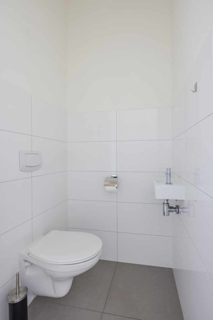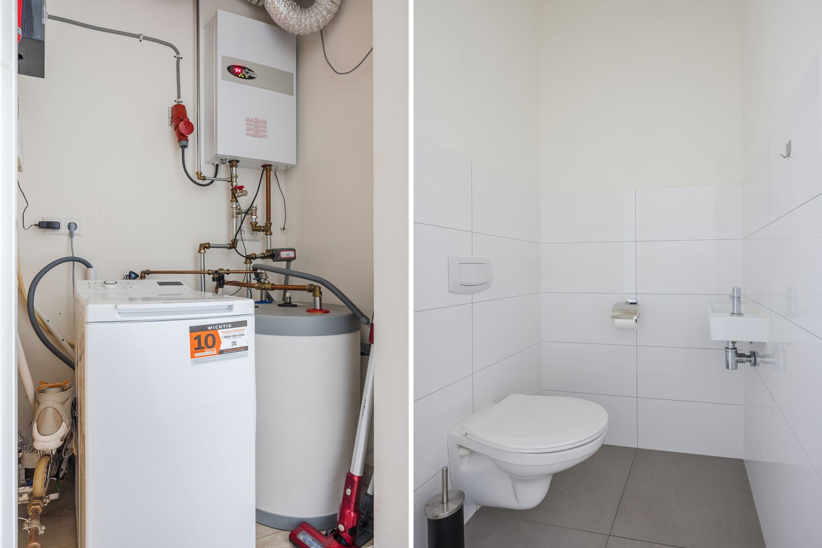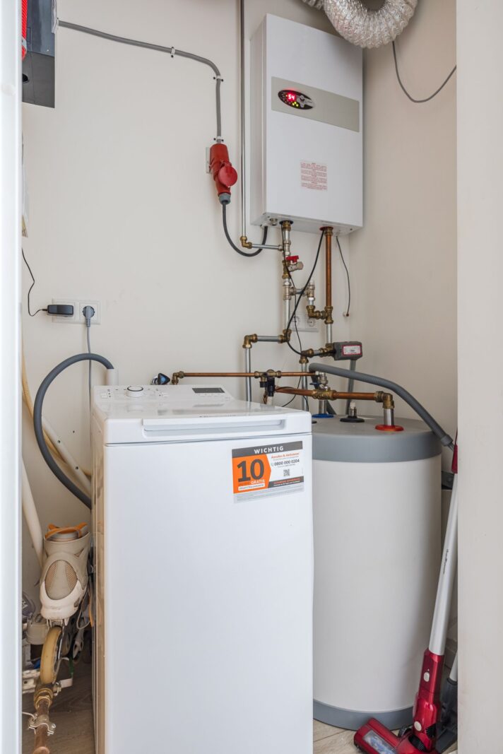 1e verdieping: Entree/hal, modern toilet met fonteintje, bergkast met opstelplaats van de elektrische CV-ketel en warmwaterboiler, aansluiting voor de wasmachine. De open keuken is in een recht opstelling en is voorzien van inbouwapparatuur zoals een inductie kookplaat, afzuigkap, vaatwasser en een koelkast.