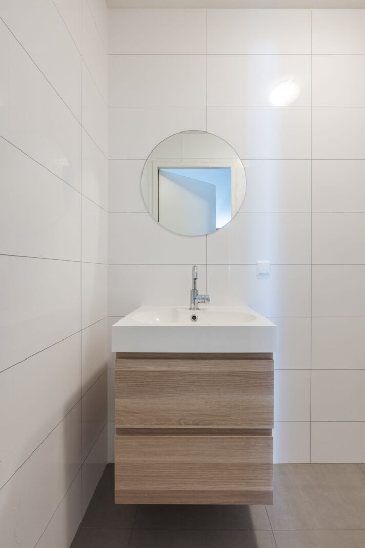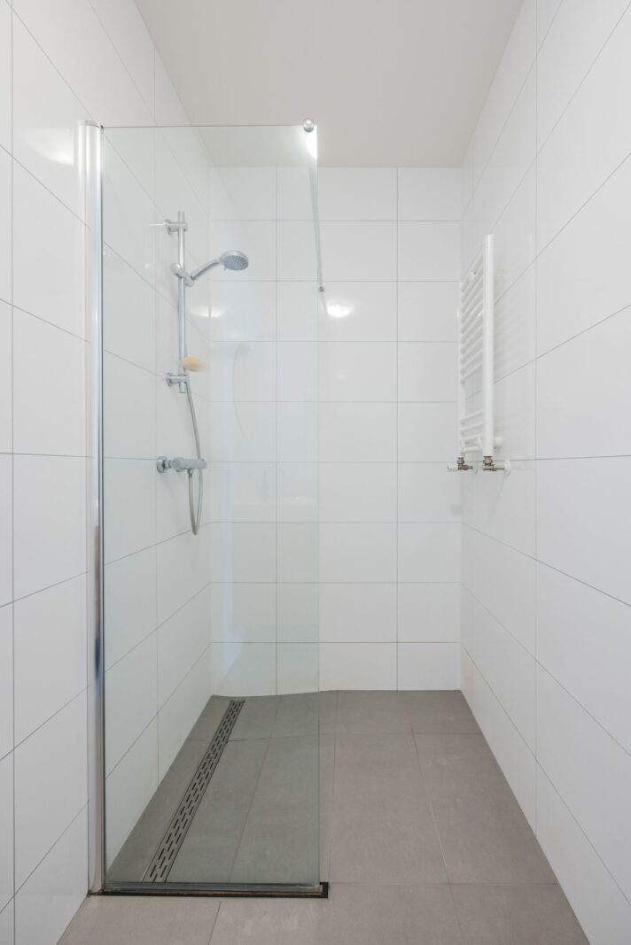 Woon- en slaapkamer met toegang tot de moderne badkamer met een inloopdouche en wastafelmeubel.