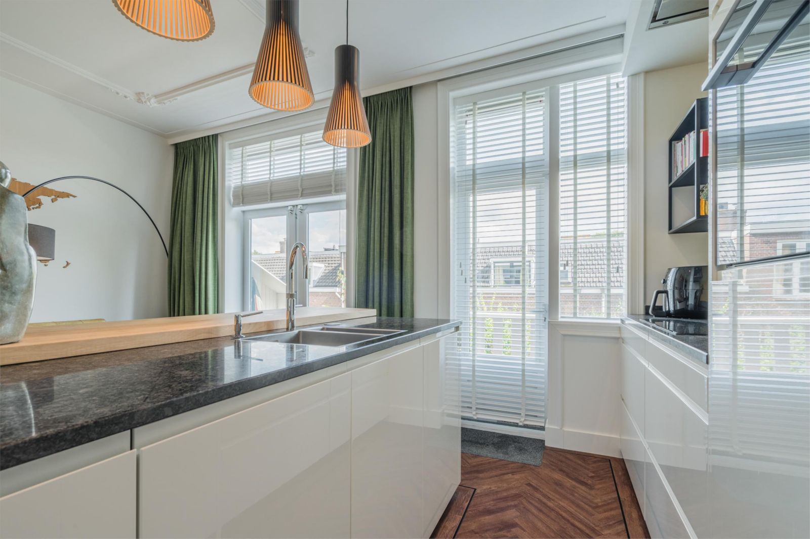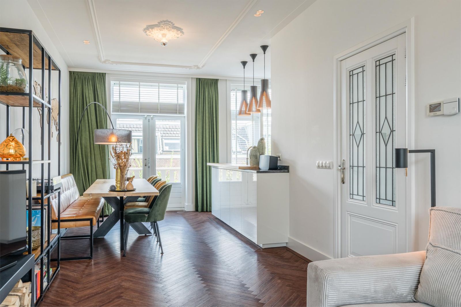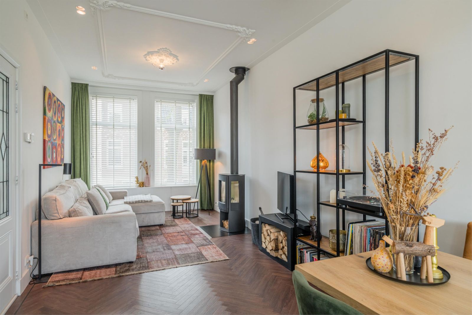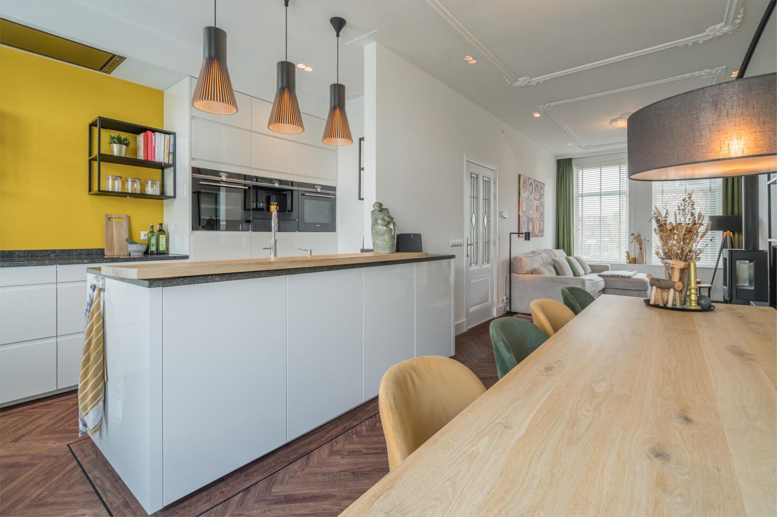 Landing with staircase, toilet, study with beautiful unobstructed views and access to the living room and open kitchen with cooking island. The kitchen is equipped with Siemens refrigerators, freezer, dishwasher, coffee machine, warming drawer, two ovens, one of which is a combi-steam oven, Quooker boiling water tap, AEG induction hob and Novi ceiling extractor. The living room has classic ceiling ornaments and an A-label Dik Geurts wood-burning stove at the front. At the rear, there are French doors to the spacious balcony with outdoor lighting and power socket. The floor is finished with classic brown herringbone parquet flooring made of high-quality Moduleo PVC.